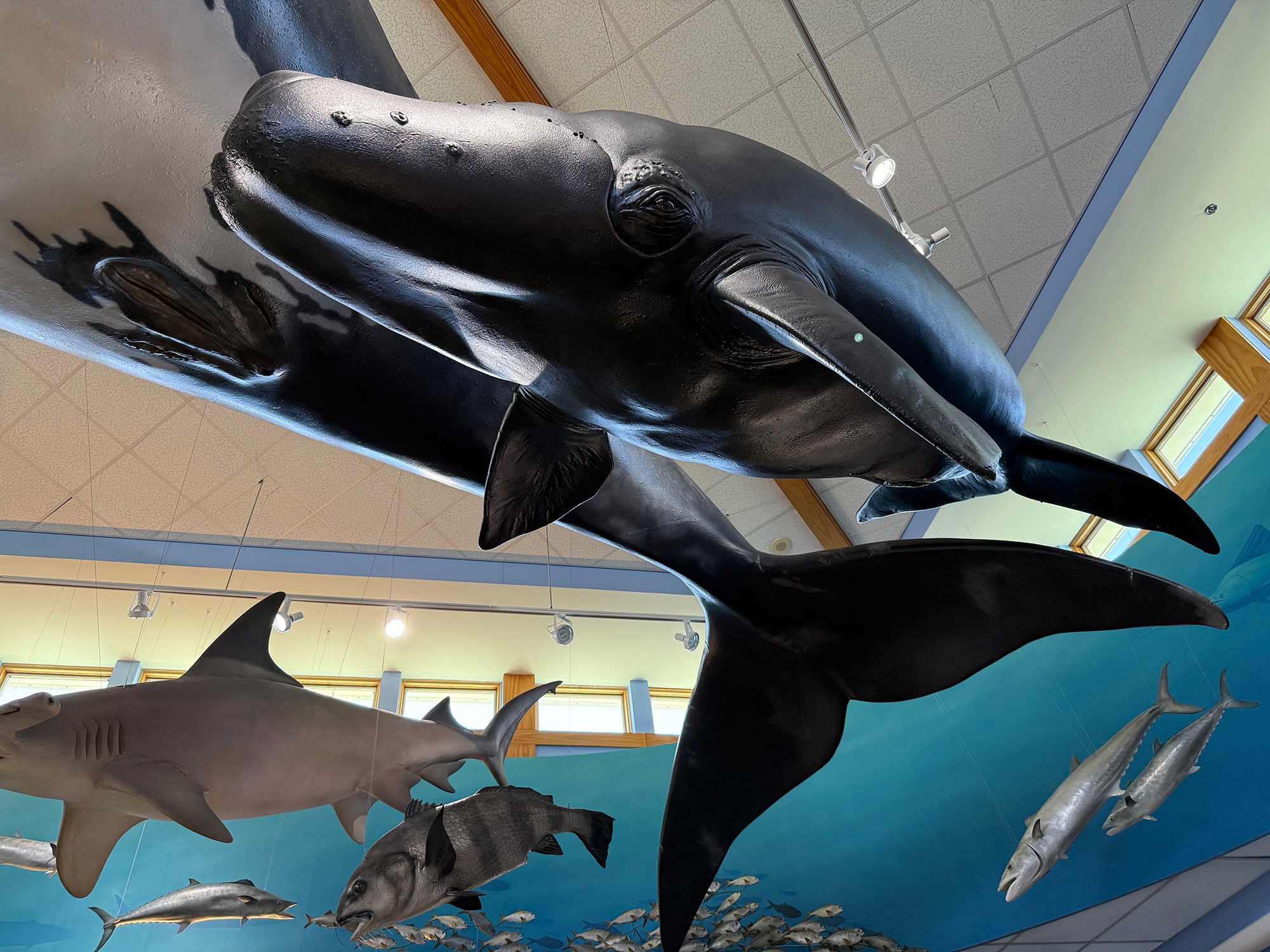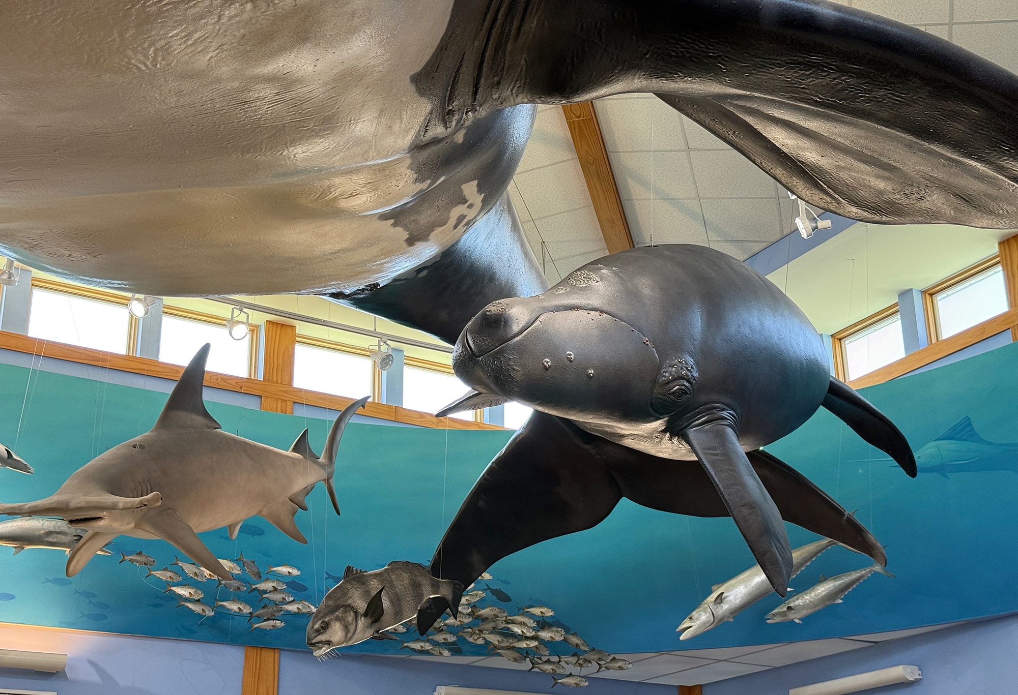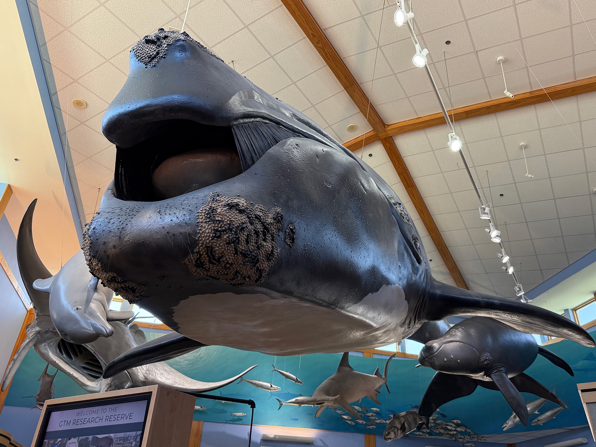 Instead of getting on the Interstate, we headed north on A1A about a half hour to the GTM Research Reserve Visitor Center in Ponte Vedra Beach. We didn’t really know what to expect, but I had no idea it would be this fantastic! The Visitor Center is filled with information about migration and habitats, with lovely sculptures of fish, manatees, and whales “swimming” above us. Some, like the gorgeous turtle below, had its habitat behind glass so we could catch a glimpse of his day. It was really quite beautiful!