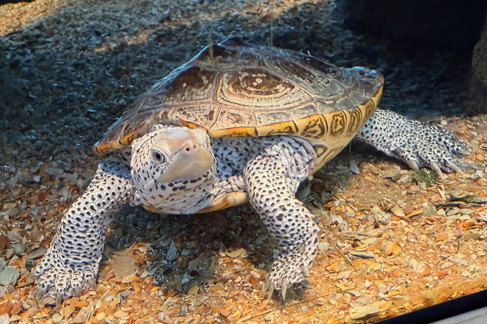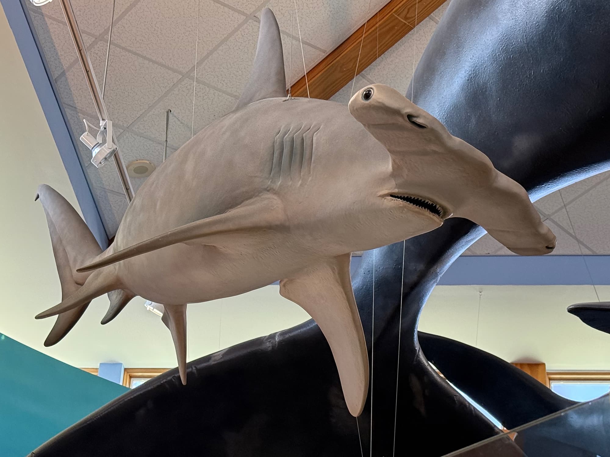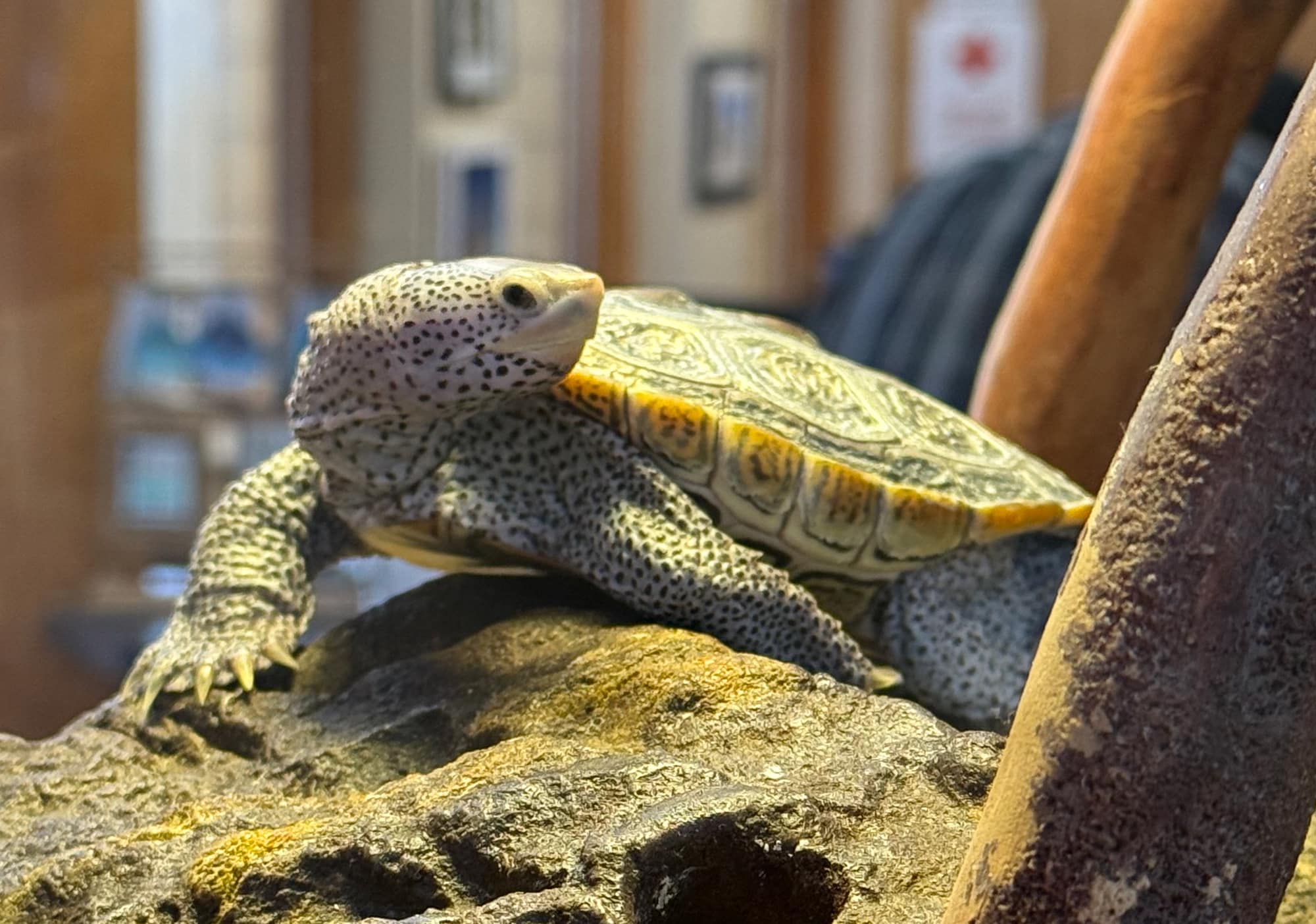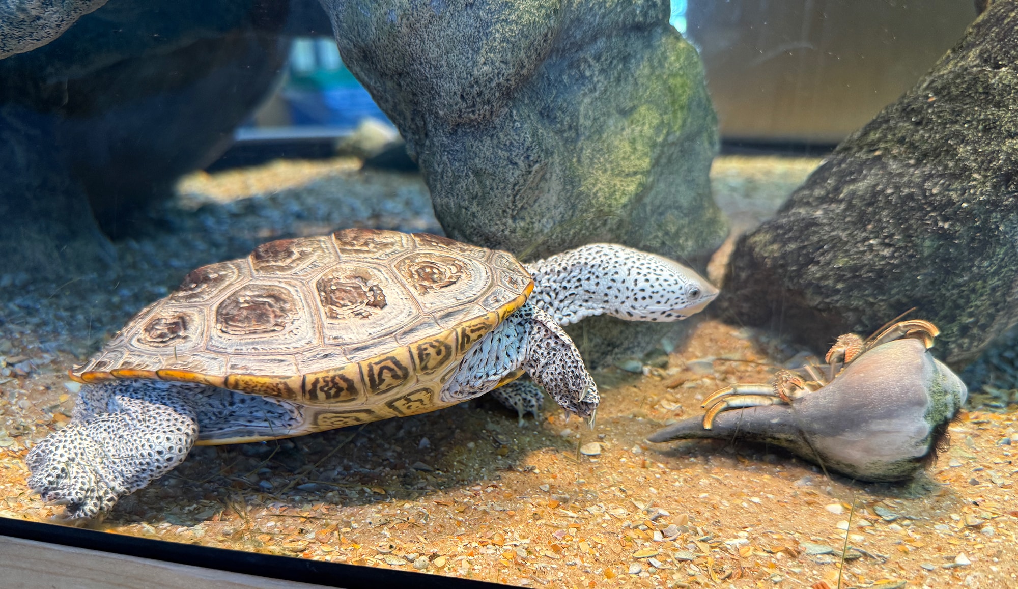Instead of getting on the Interstate, we headed north on A1A about a half hour to the GTM Research Reserve Visitor Center in Ponte Vedra Beach. We didn’t really know what to expect, but I had no idea it would be this fantastic! The Visitor Center is filled with information about migration and habitats, with lovely sculptures of fish, manatees, and whales “swimming” above us. Some, like the gorgeous turtle below, had its habitat behind glass so we could catch a glimpse of his day. It was really quite beautiful!