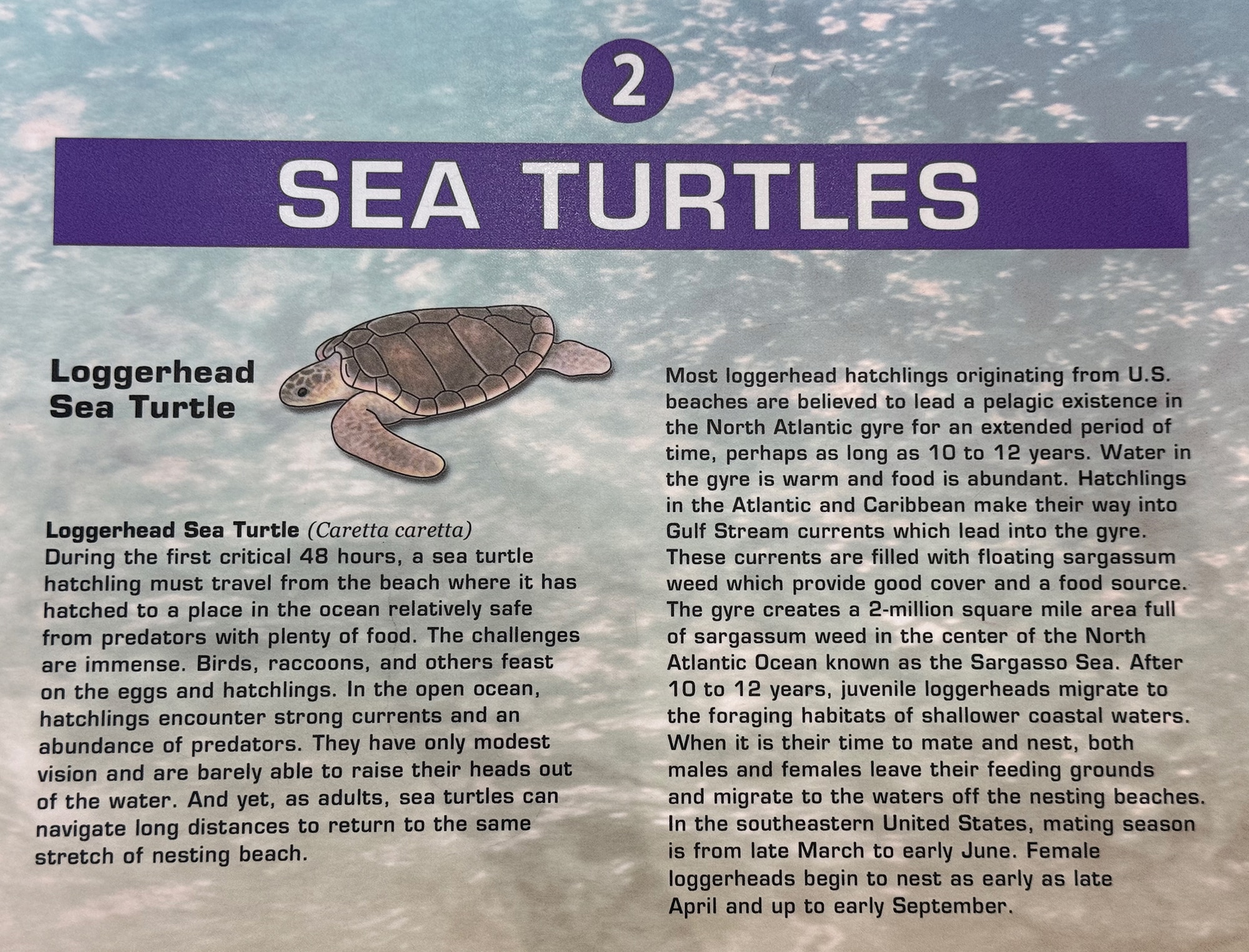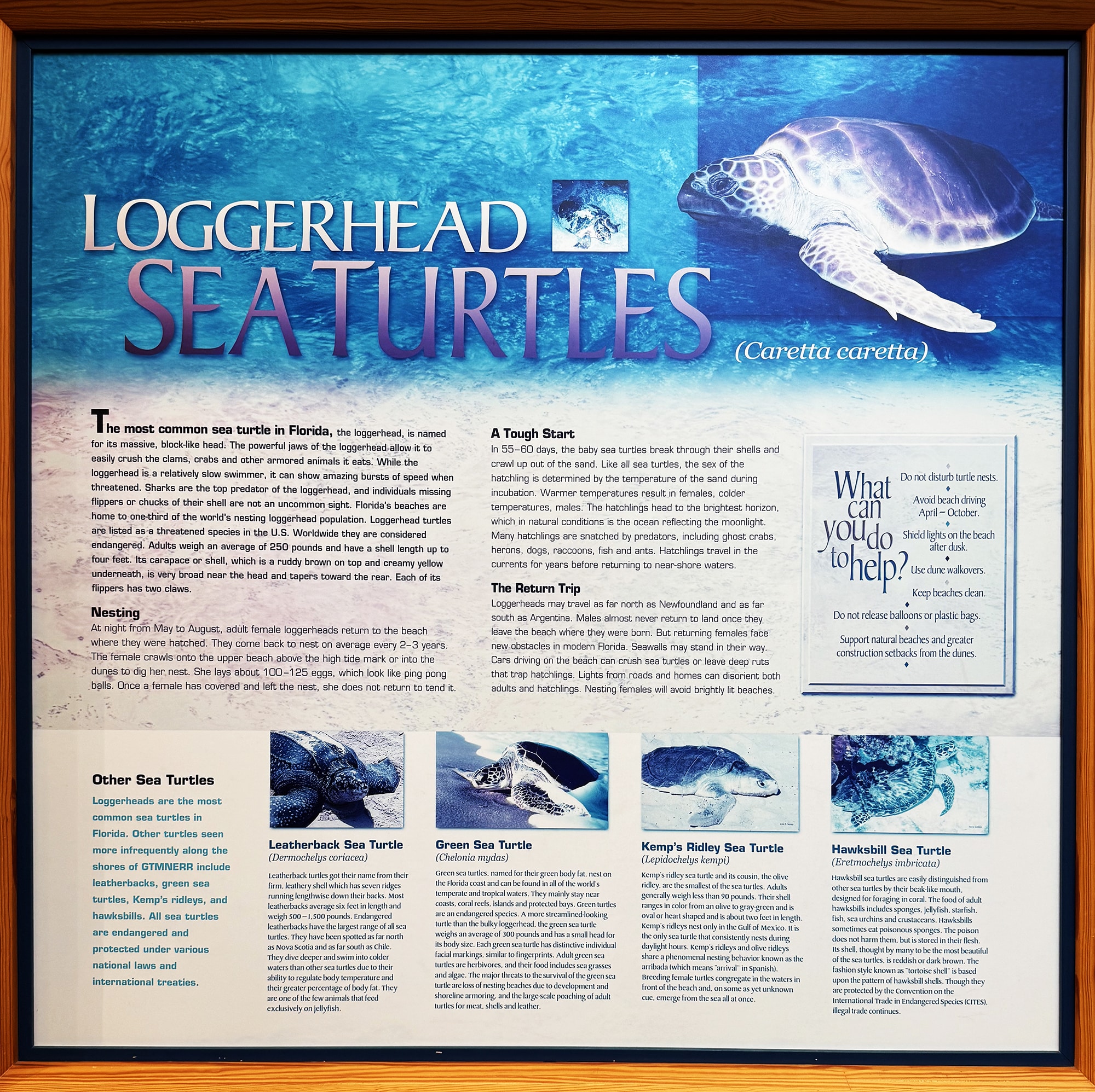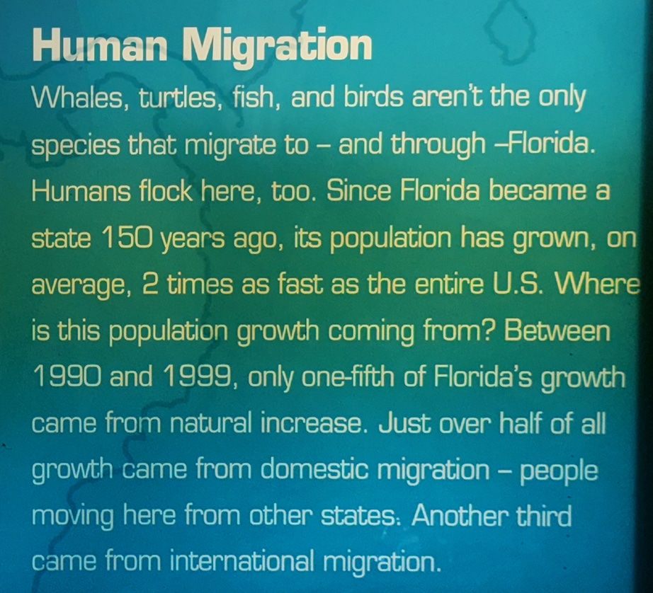 A fascinating interactive display paged through the migration habits of whales, sea turtles, birds, manatees, cobia, and manta rays. A map with plenty of arrows indicates their routes and the times of year that they are likely to arrive. The last species they refer to is humans and their migration to Florida – particularly in the winter months. We can relate to that.