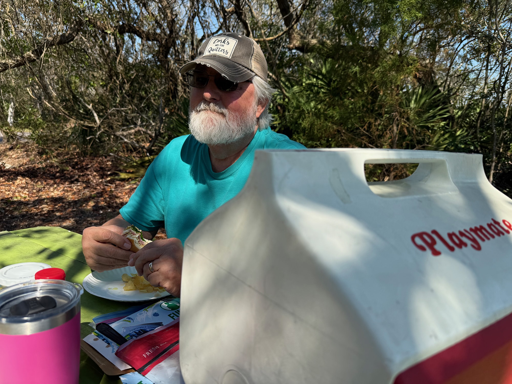 After our fantastic visit at the Visitor Center, we ventured outdoors to see the area near the water. Unfortunately at low tide there wasn’t a lot happening, and even the “Manatee Area” was mucky and yucky. But the pelicans are always a treat, and our Playmate cooler once again brought refreshment to a great day!