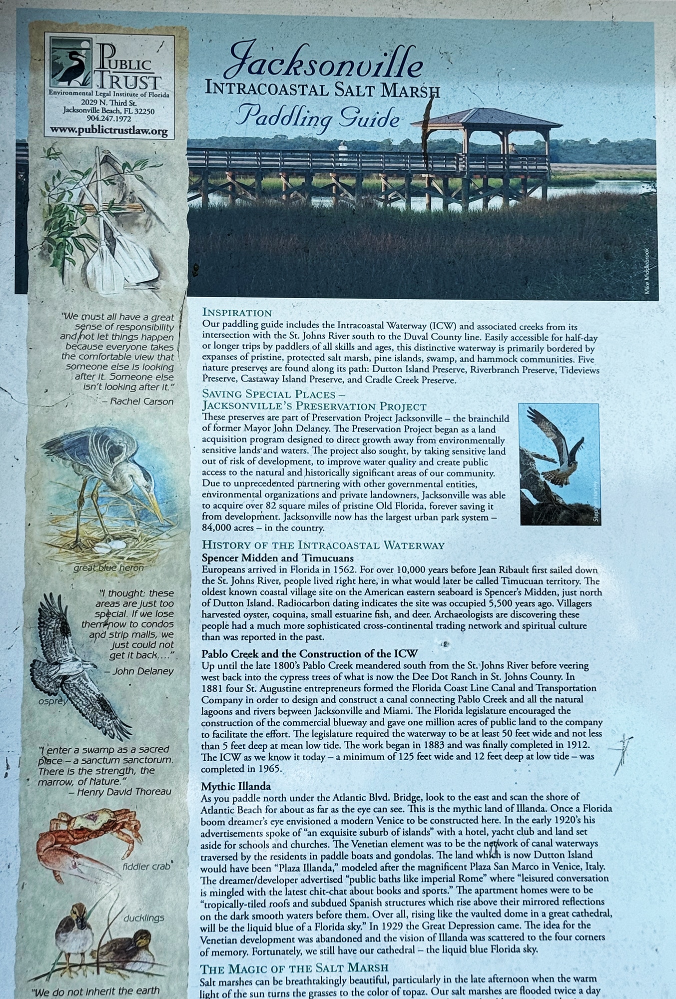“Castaway Island Preserve is located along the Intracoastal Waterway and is adjacent to an intricate salt marsh ecosystem that is ideal for spotting marshland wildlife. Visitors may stroll along the Preserve’s wooden boardwalk, take in a view from an observation platform overlooking the waterway, walk along the kid-friendly interpretive nature trail, use the kayak launch to explore the marsh, and explore the theater-style education center during scheduled programs.” ~ READ MORE