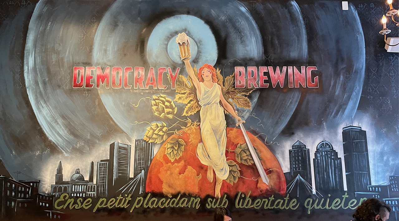 Boston artist Mark Grundig painted this mural and more wall decor at Democracy Brewing. The saying “Ense petit placidam sub libertate quietem” translates to: “With the sword he seeks a peaceful repose in freedom.”