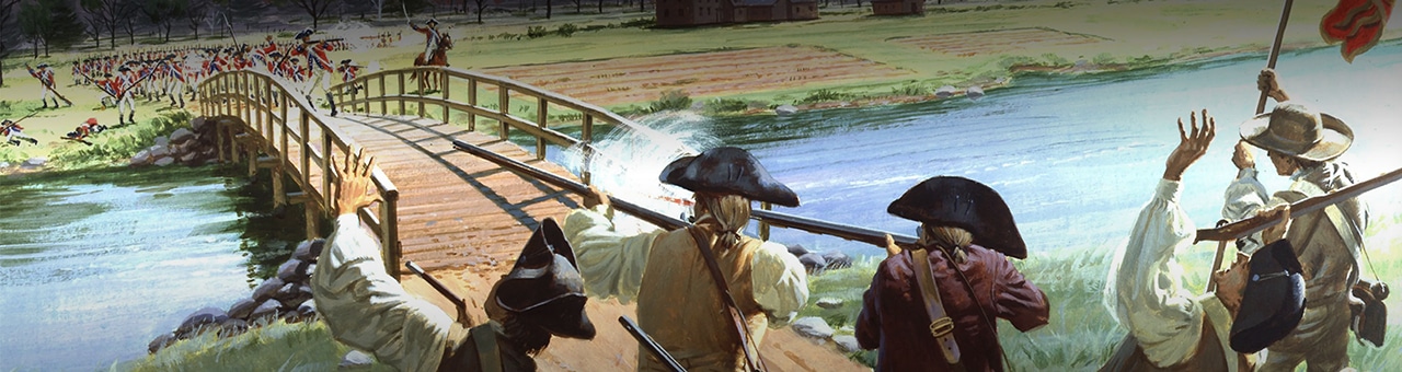 Many of the key events leading up to the Revolutionary War occurred in or near Boston and we are going to visit the locations of quite a few. We were at Concord and Lexington earlier today, which you can read at this link. At the link there is a current-day photo of the Old North Bridge, but the one just below looks cool with soldiers lined up on both sides of the Concord River.