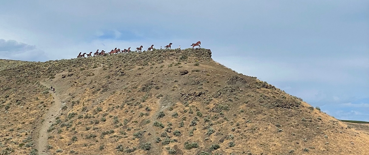 While headed to our next overnight in Spokane, I caught a glimpse of horses high up on a hill. I pulled right in to see what was going on. Turns out, the Wild Horse Monument is “a set of 15 life-size steel horses galloping across a ridge above the Columbia River”. There was a trail leading up to the monument, but since we had no time to explore any further, we enjoyed the view out over the river and then continued on down the road.