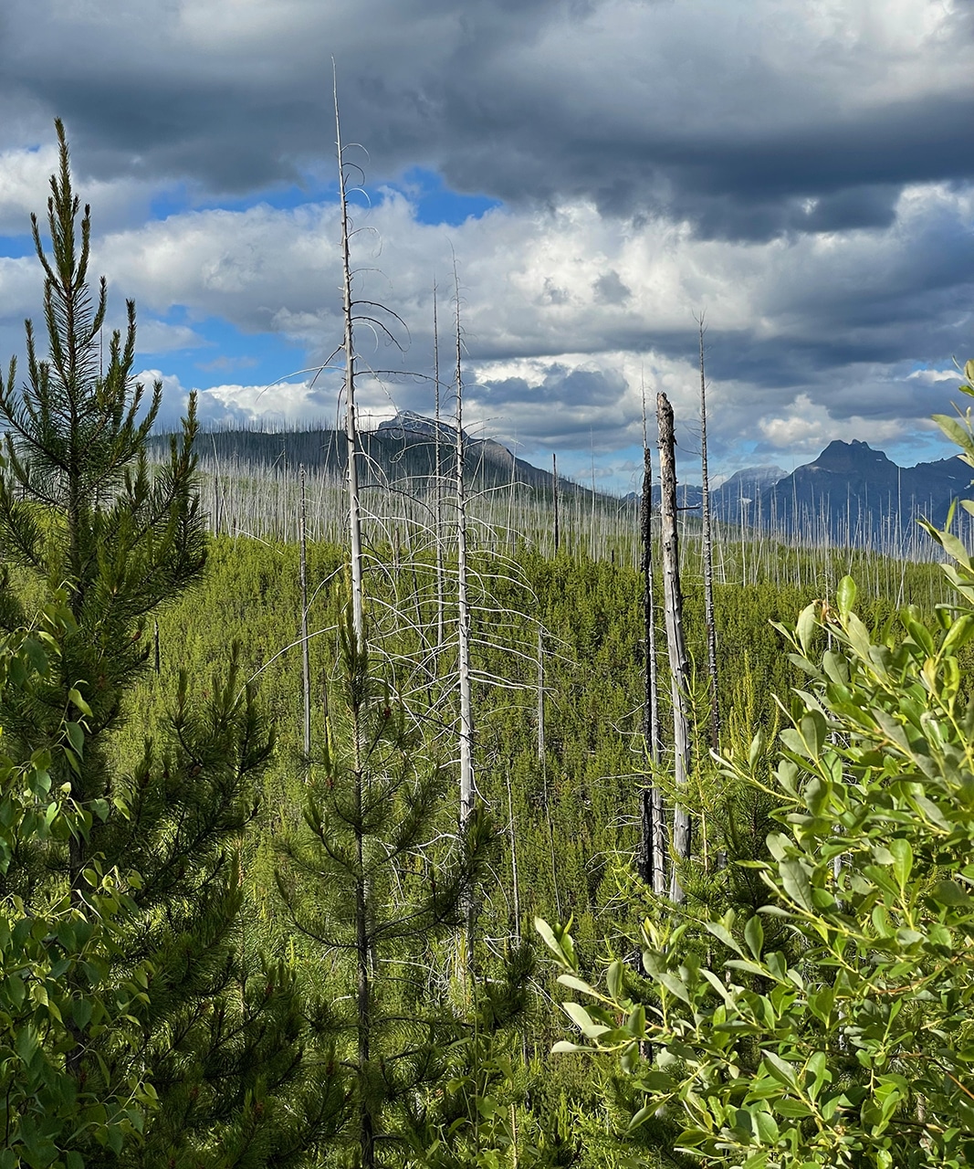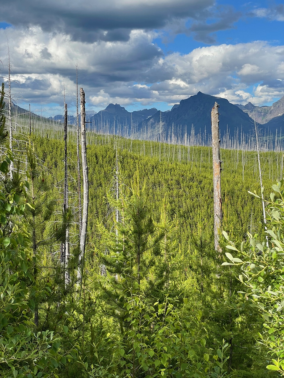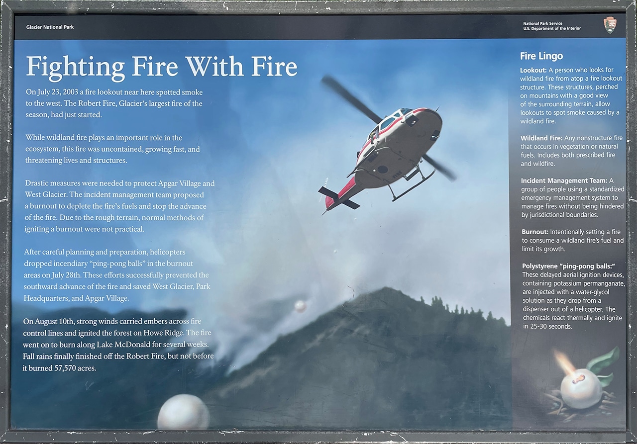 Along the way there were plenty of pullouts with “exhibits” (information plaques) which were very helpful when we noticed a lot of white tree trunks looming above newer growth. The video below shows the remnants of the Robert Fire that burned over 57,000 acres in the summer of 2003. There is also a (very) partial view of Lake McDonald and the surrounding peaks – which were stunning.
