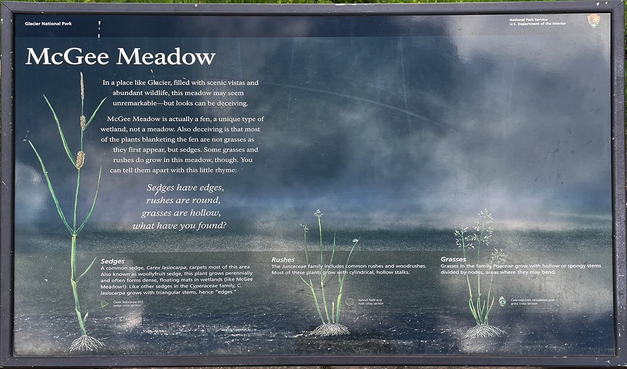 “In a place like Glacier, filled with scenic vistas and abundant wildlife, this meadow may seem unremarkable – but looks can be deceiving. McGee Meadow is actually a fen, a unique type of wetland, not a meadow at all.” ~ from the exhibit below