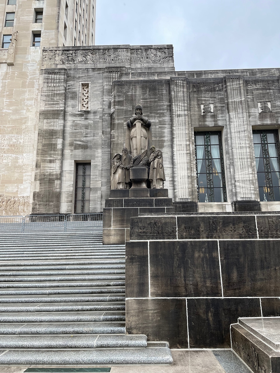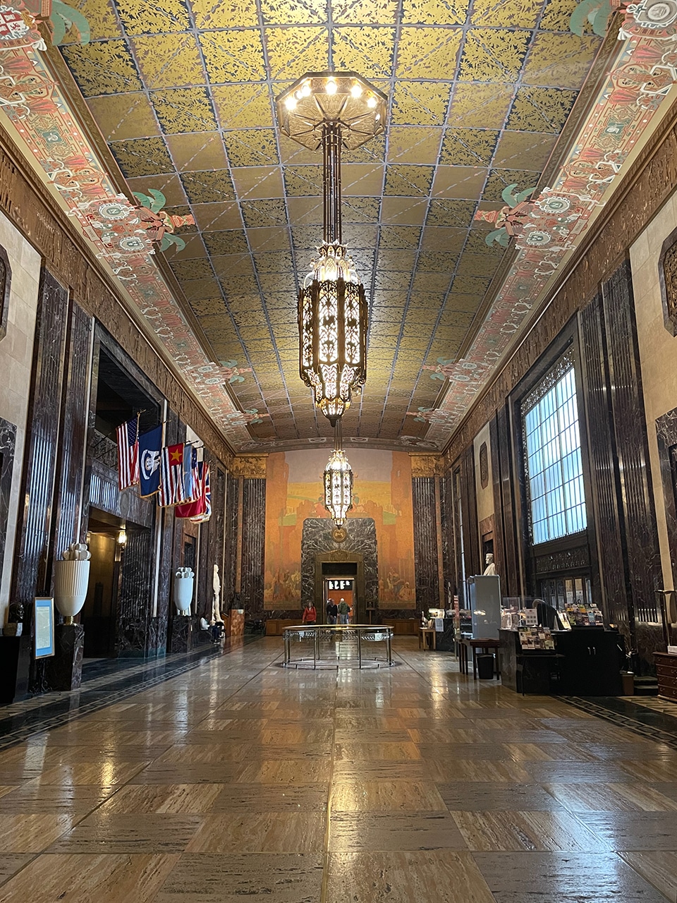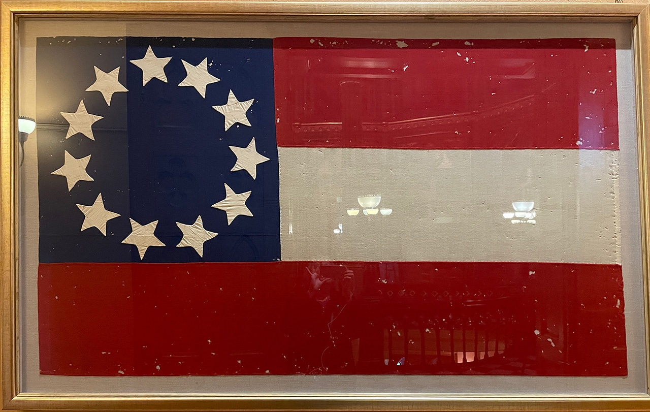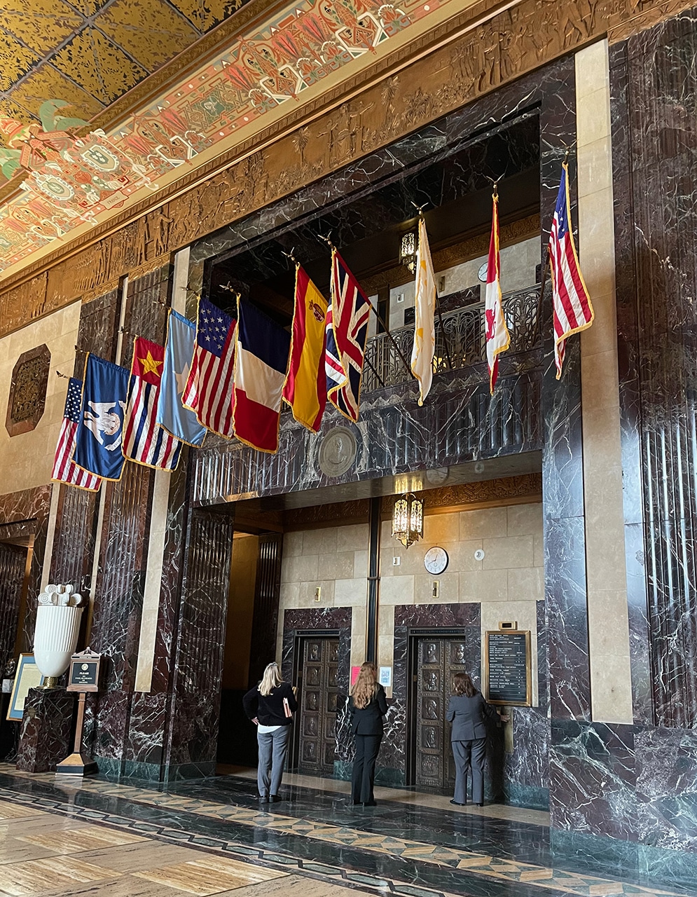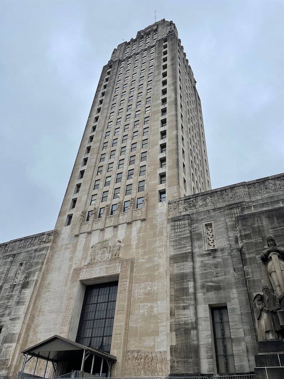 Waiting for the elevator was a treat, with its solid bronze doors that contain reliefs of Louisiana’s governors starting with William Claiborne and ending with Huey P. Long. Each flag that has flown over Louisiana flies above the elevator.