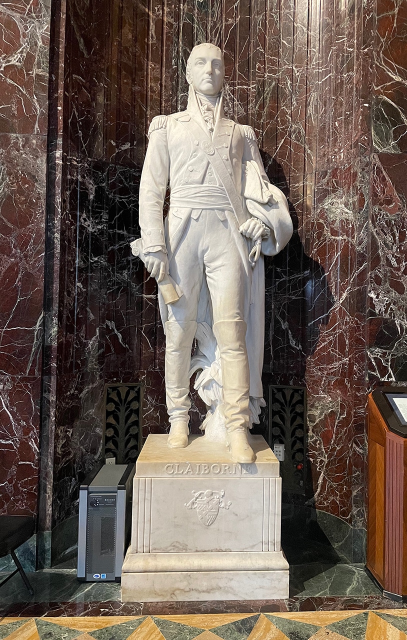 The second photo depicts William Claiborne, and is one of four white marble statues in the hall. “Claiborne supervised the transfer of French Louisiana to U.S. control after the Louisiana Purchase of 1803, governing the Territory of Orleans from 1804 to 1812, the year in which Louisiana became a state. He won the first election for Louisiana’s state Governor and served through 1816, for a total of thirteen years as Louisiana’s executive administrator. New Orleans served as the capital city during both the colonial period and the early statehood period.” ~ READ MORE