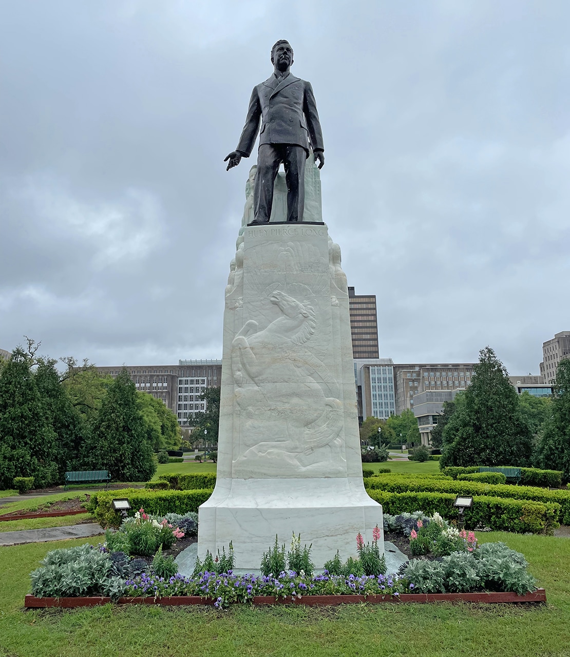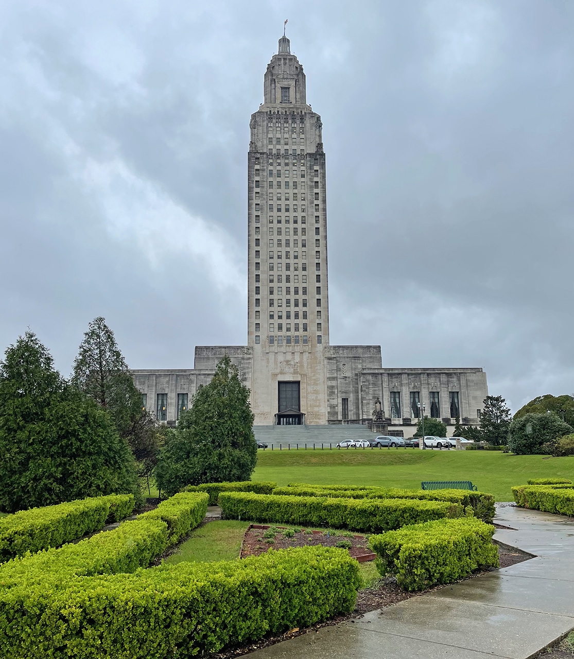 The Louisiana State Capitol grounds were very impressive, on 27-acres with perfectly manicured hedges and symmetrical walkways. Oaks and Magnolia trees provide a backdrop for bright pops of color when camellias and azaleas bloom a little later in the season. Benches were placed in strategic places, and had this been a nicer day (with flowers blooming) I definitely would have taken advantage of those.