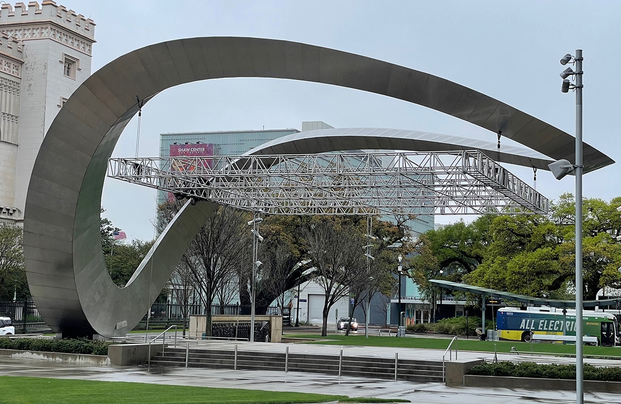 Galvez Plaza and its Crest sculpture (a.k.a. the Galvez Stage) “has received several national and international design, engineering and construction awards. It serves as a suspended truss system that is assembled during the Spring and Fall events as part of the backdrop for the outdoor stage where people go to listen to live music, dance, eat, drink and enjoy!”
