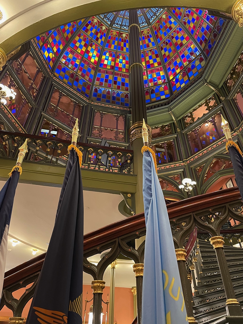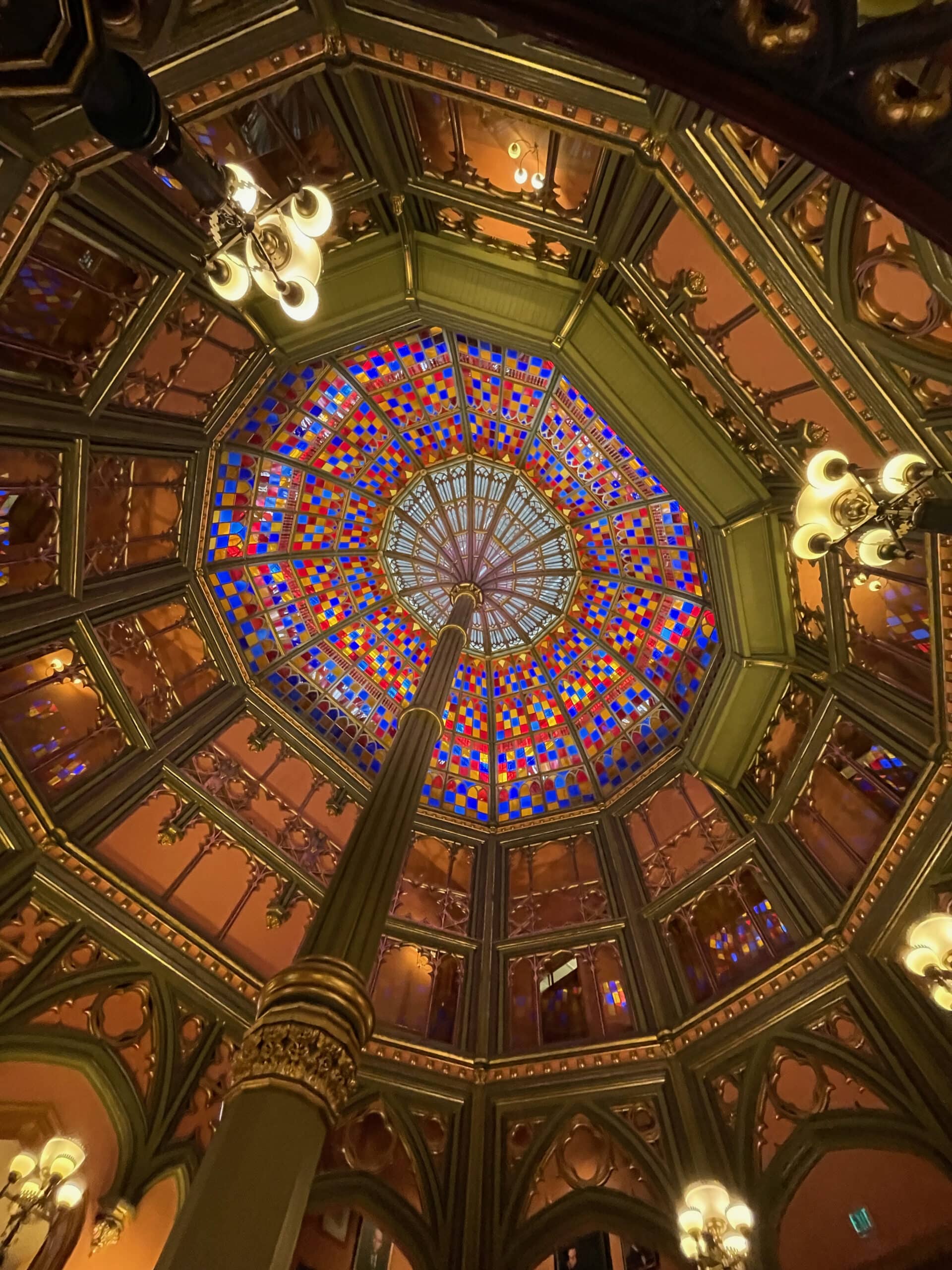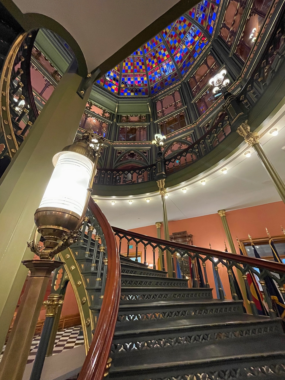 After breakfast at the hotel the next morning, we checked out and headed over for our free self-guided tour of the Louisiana Old State Capitol. As if the outside wan’t magnificent enough, the first thing we saw when we walked in was the amazing spiral staircase leading to a magnificent stained glass dome!