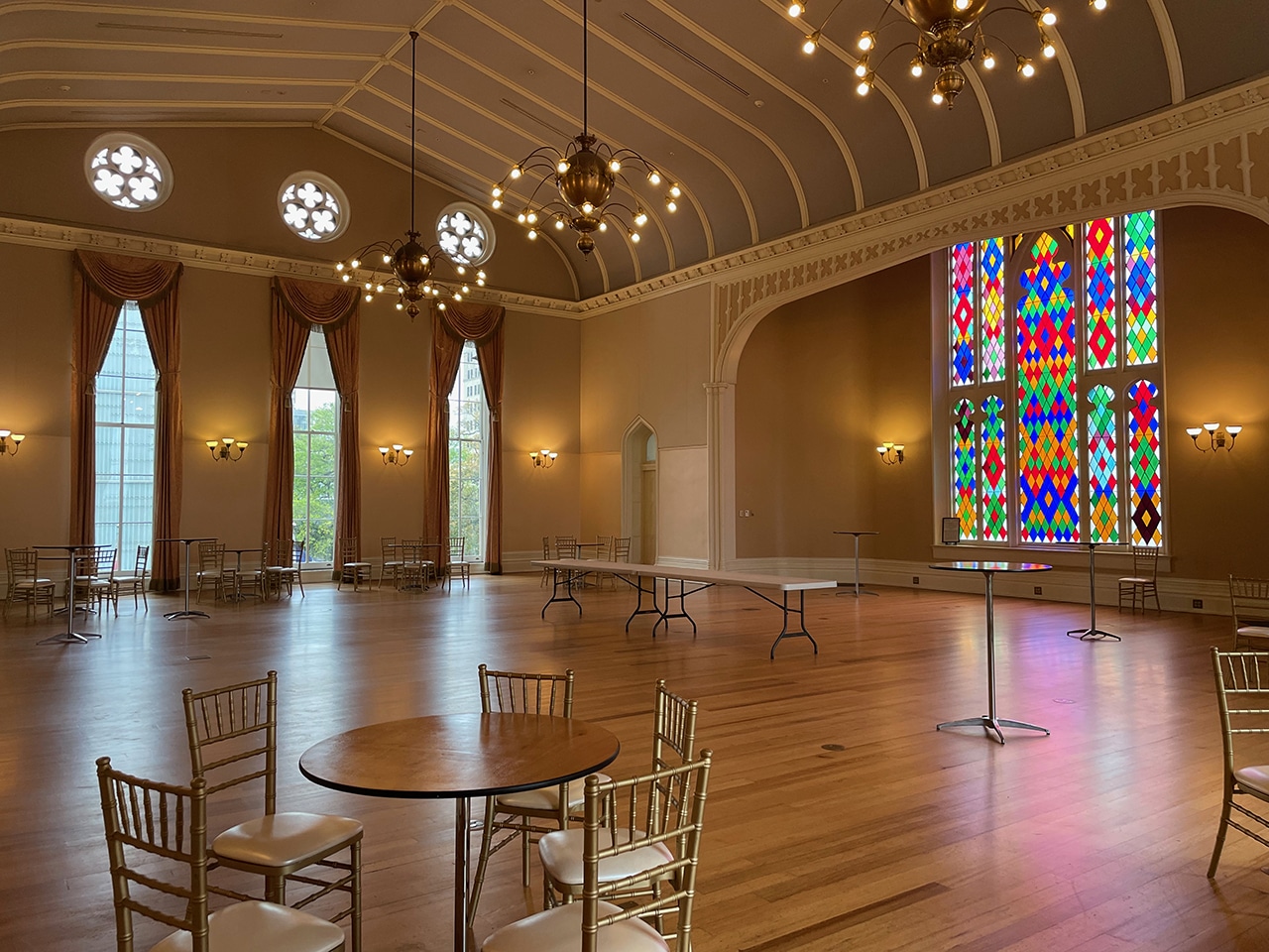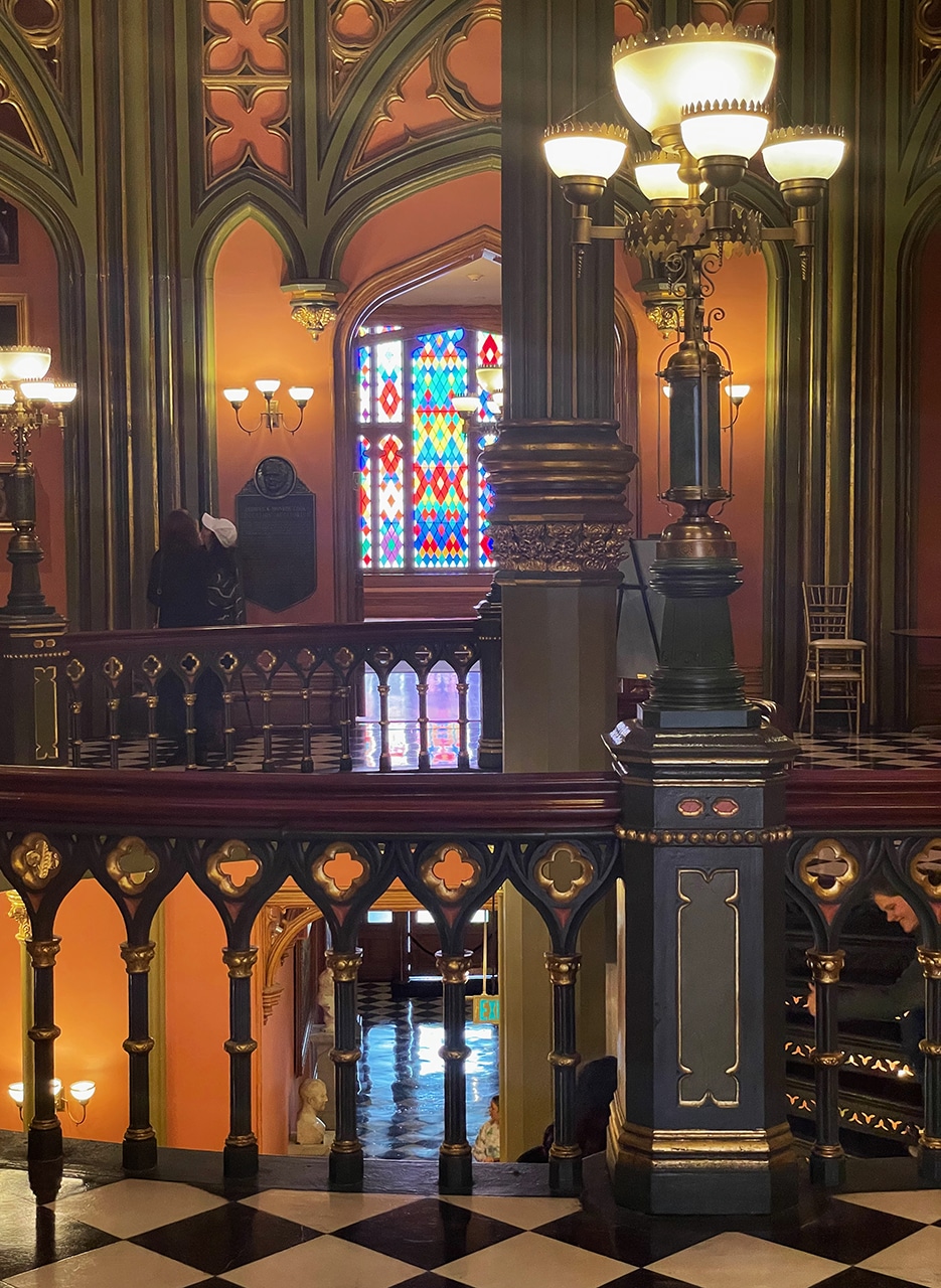 “Constructed between 1847 and 1852, this imposing structure on a natural levee overlooking the Mississippi River has the appearance of a medieval fortress. The interior, however, is decorated in marble and rich wood paneling, with a commanding cast-iron spiral staircase and an awesome display of stained glass in the main gallery and in the overhead dome.