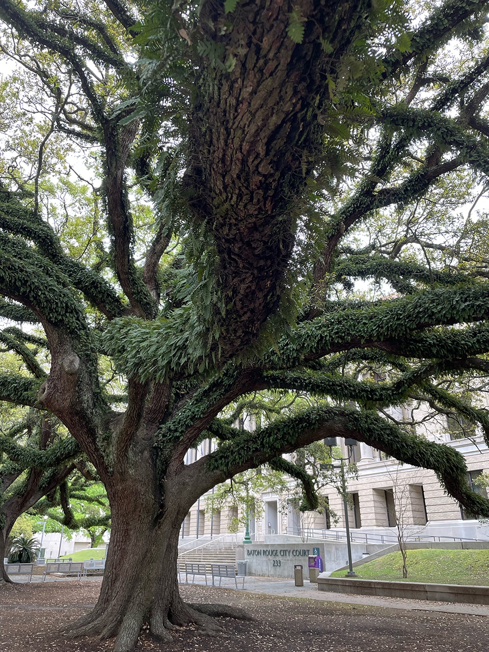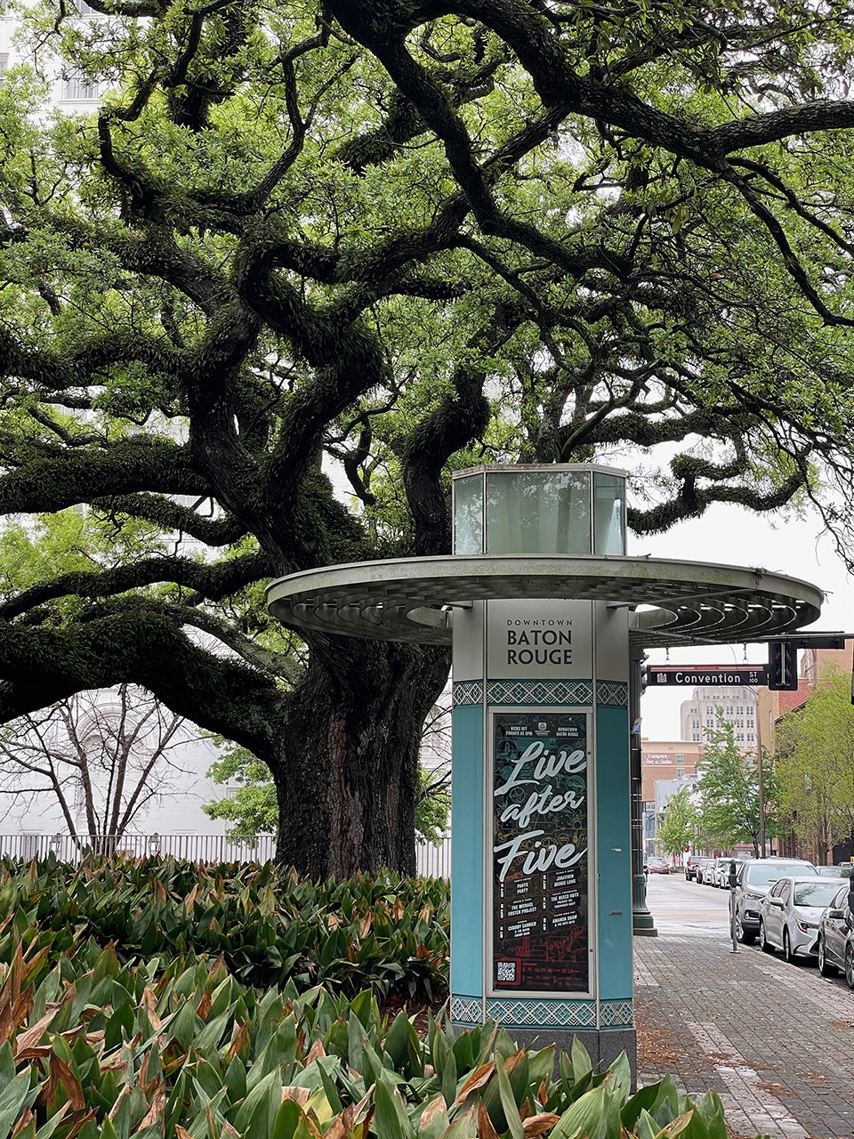 I have to stop anytime I come upon a park where the oak trees are fantastic, and today had the benches not been so wet, I would have stayed a lot longer. A very cool circular sign gave a listing of what’s happening “Live After Five.” I couldn’t find the name of this park, but it was located across the street from Baton Rouge City Court.