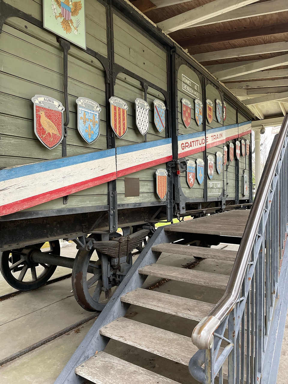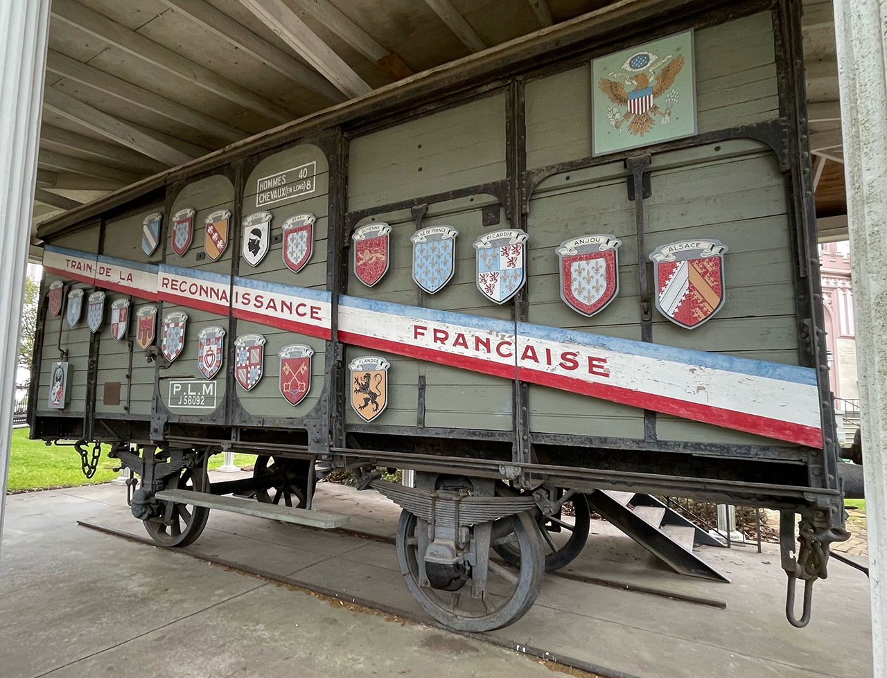 From the sign at right > The French military used boxcars called forty-and-eights to transport goods and soldiers, first in WWI and again in WWII. The boxcars could hold 40 men or 8 horses, hence the name…