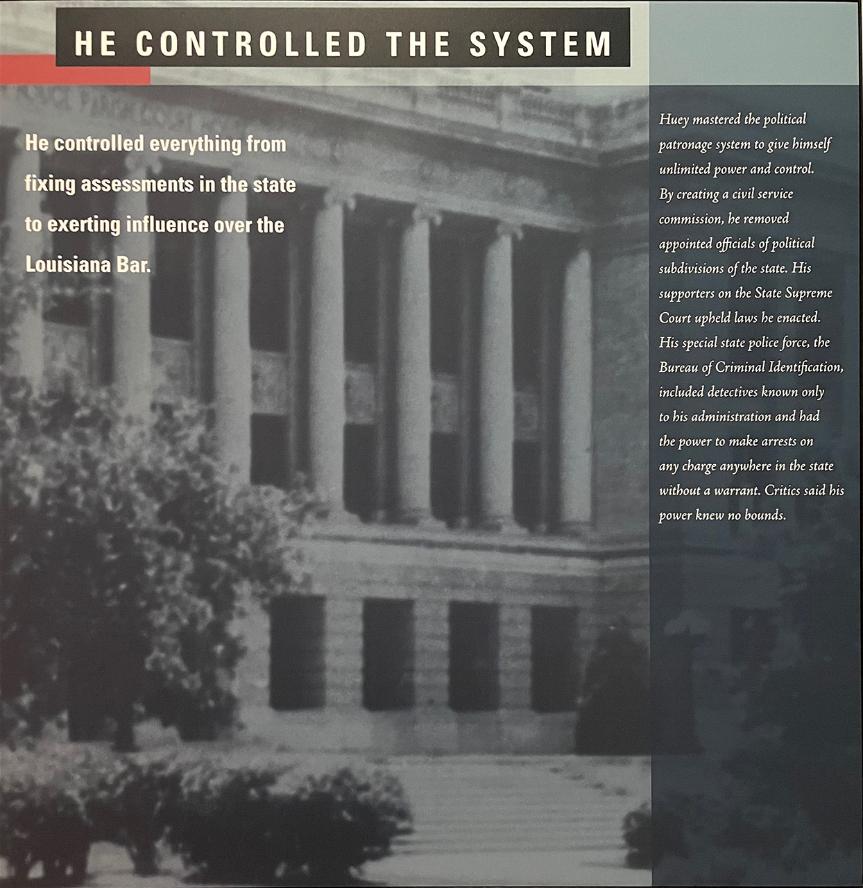 In order to fend off local challenges to his control in 1934, he effected radical changes in the Louisiana government, abolishing local government and taking personal control of all educational, police, and fire job appointments throughout the state. He achieved absolute control of the state militia, judiciary, and election and tax-assessing apparatus, while denying citizens any legal or electoral redress.” ~ READ MORE