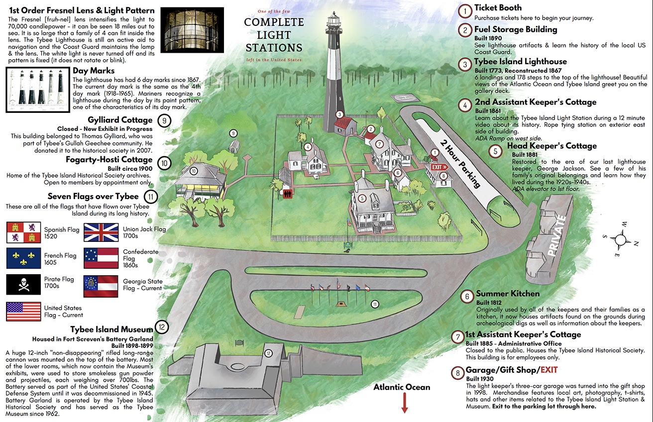 “The Fresnel [fruh-nel] lens intensifies the light to 70,000 candlepower – it can be seen 18 miles out to sea. It is so large that a family of 4 can fit inside the lens. The Tybee Lighthouse is still an active aid to navigation and the Coast Guard maintains the lamp & the lens. The white light is never turned off and its pattern is fixed (it does not rotate or blink).” ~ from the map above