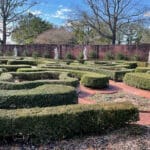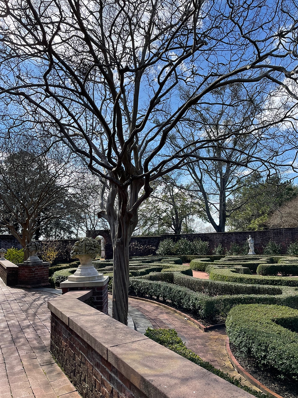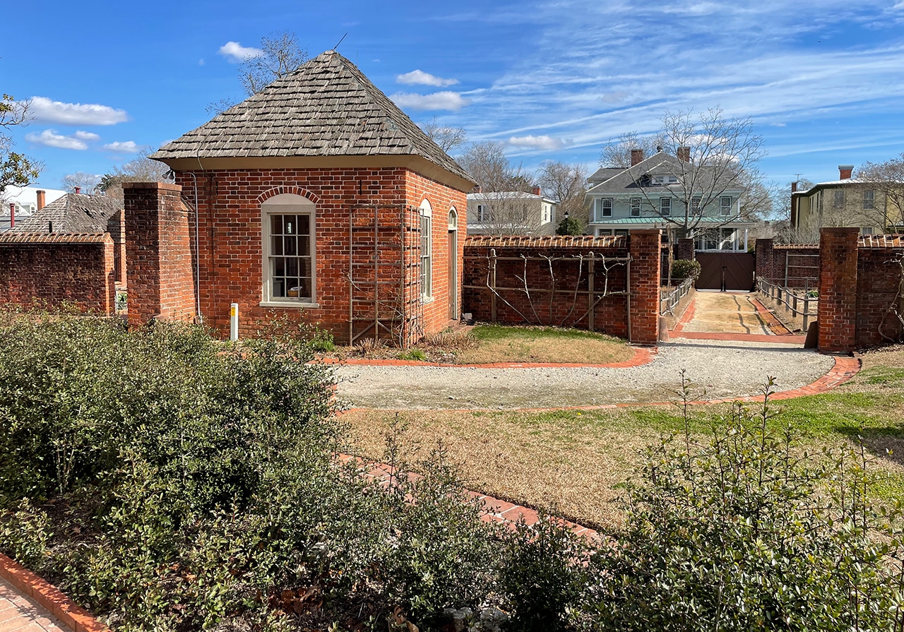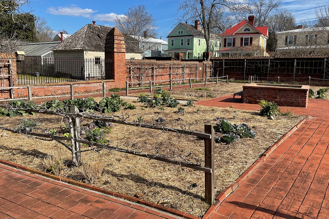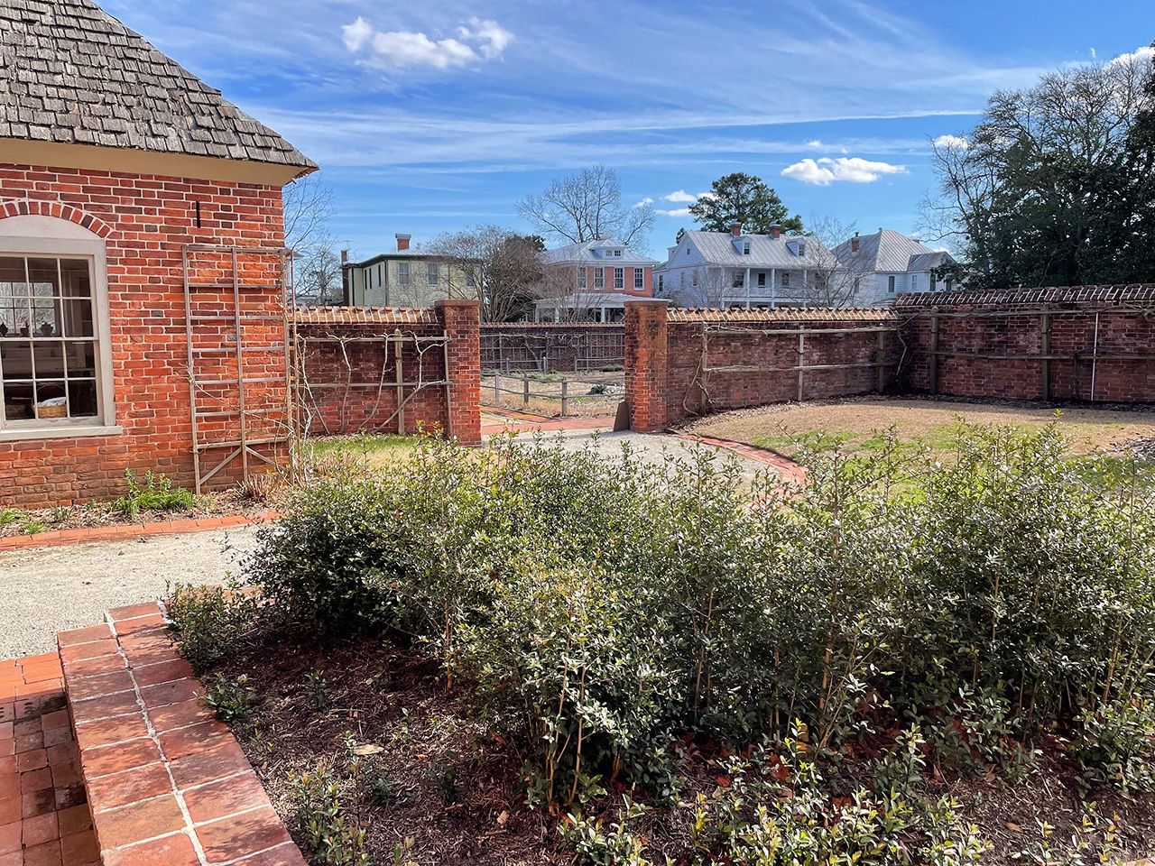 In this area, it was very evident that the Palace today has neighbors – who wouldn’t have been here in William Tryon’s time at the Palace. Although our visit in late January didn’t have much in the way of bounty from the gardens, the red brick buildings were just beautiful. Stakes in the ground indicate which vegetables and herbs are grown when it’s a little warmer.