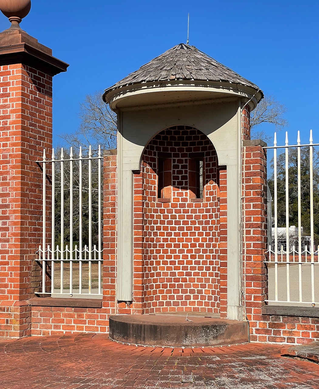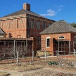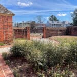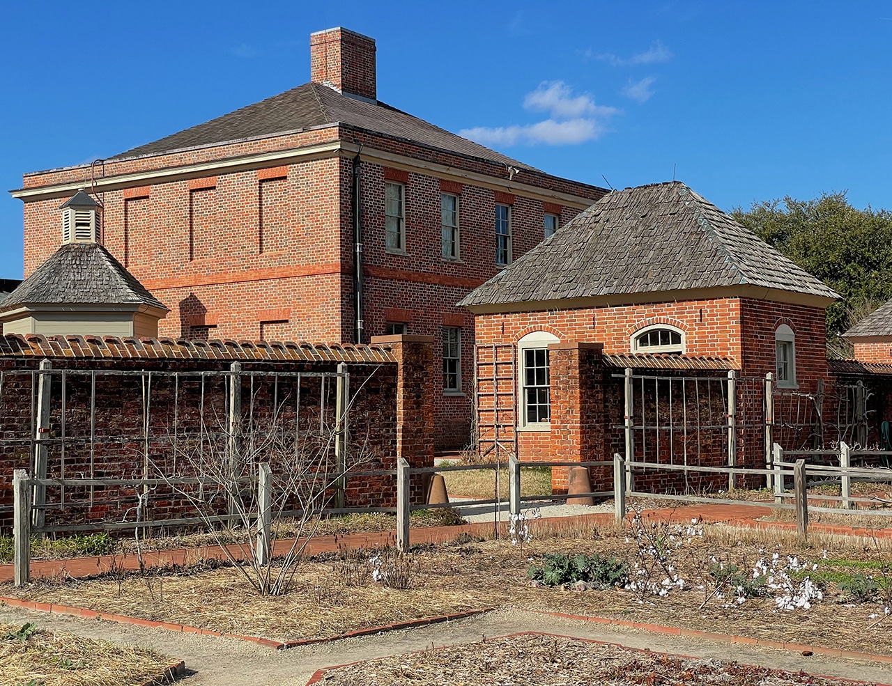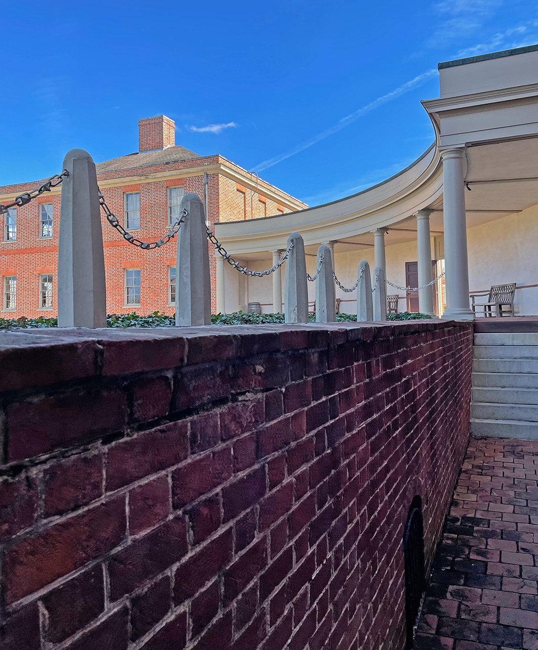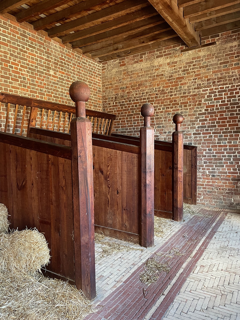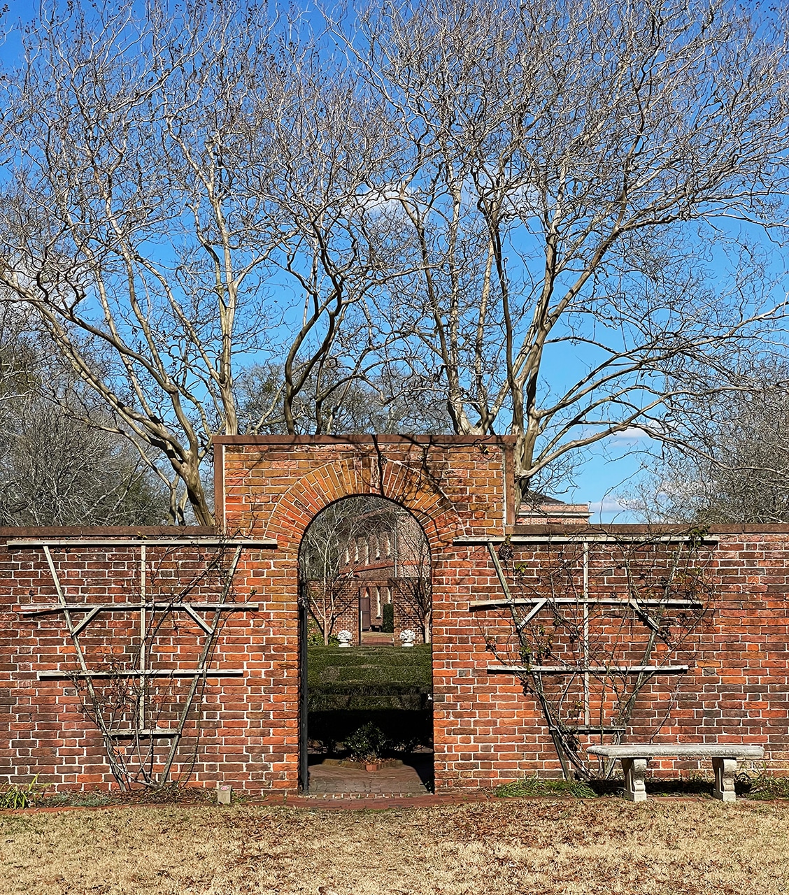 In this area, it was very evident that the Palace today has neighbors – who wouldn’t have been here in William Tryon’s time at the Palace. Although our visit in late January didn’t have much in the way of bounty from the gardens, the red brick buildings were just beautiful. Stakes in the ground indicate which vegetables and herbs are grown when it’s a little warmer.