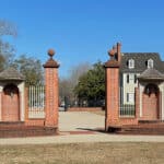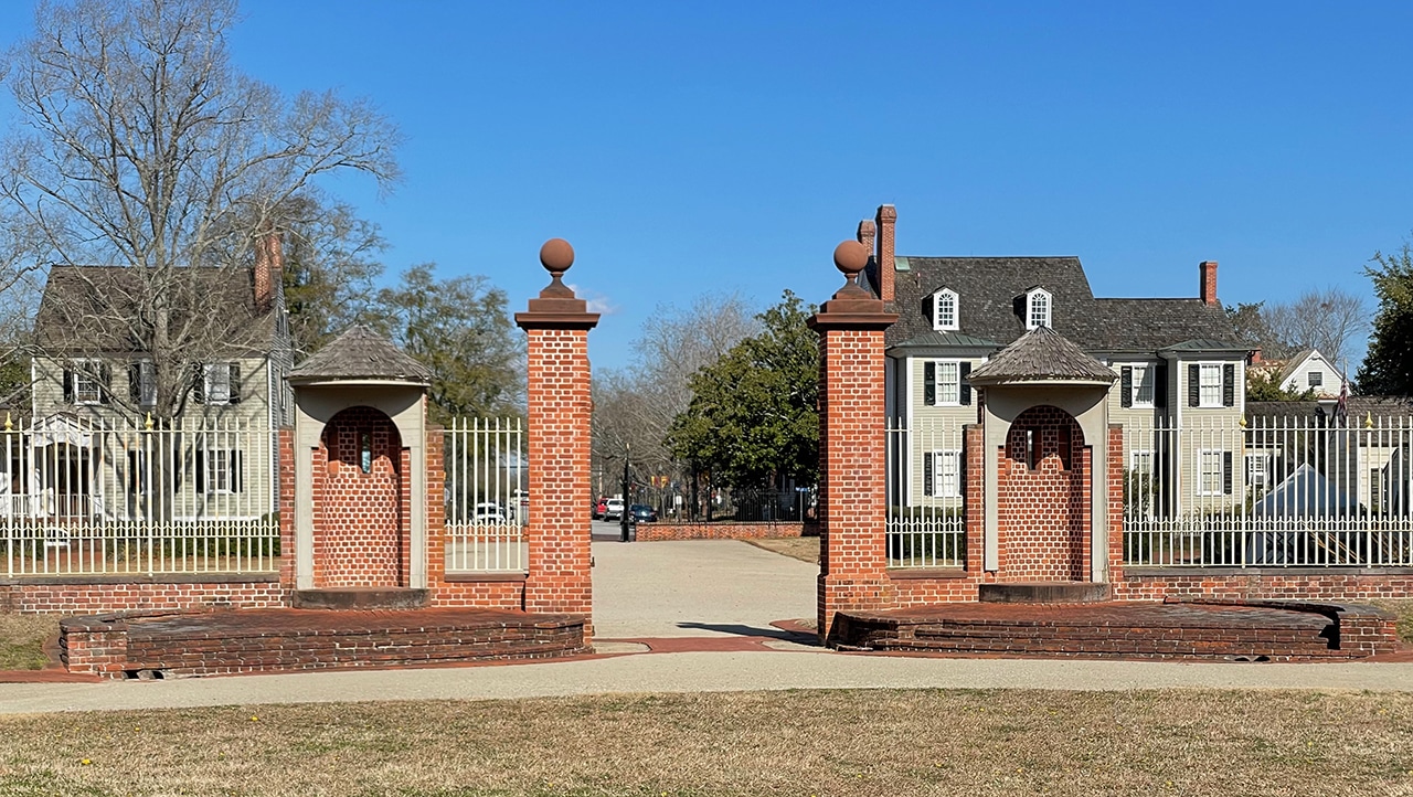 We checked in at the North Carolina History Center, which was a short walk to the entrance of the Palace through a residential neighborhood. As we turned to enter the grounds, we had the full-front view of the house above – the Kitchen Office (left) and the Stable Office (right). We walked from the street, between the white houses in the second photo below and through the gate, as visitors would have entered in carriages in 1770. I must say it was pretty impressive.