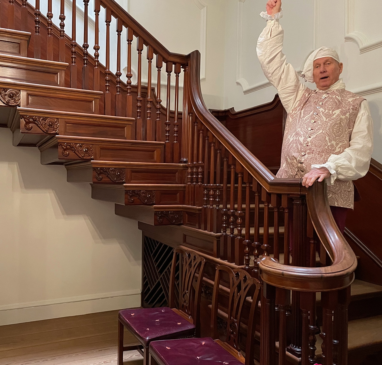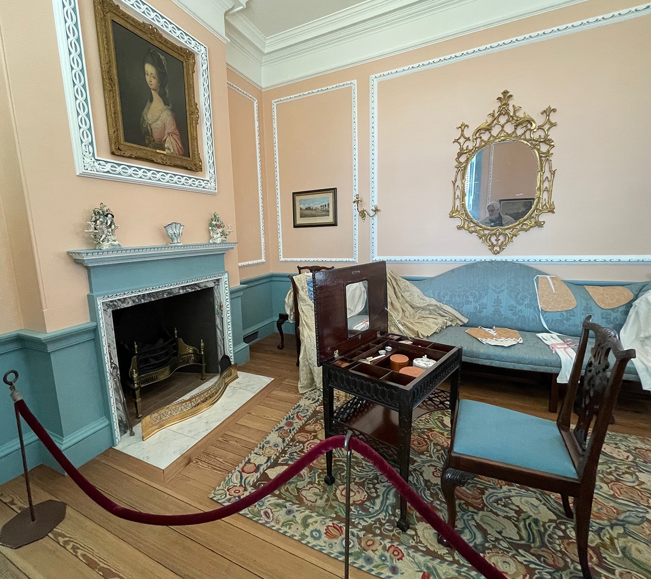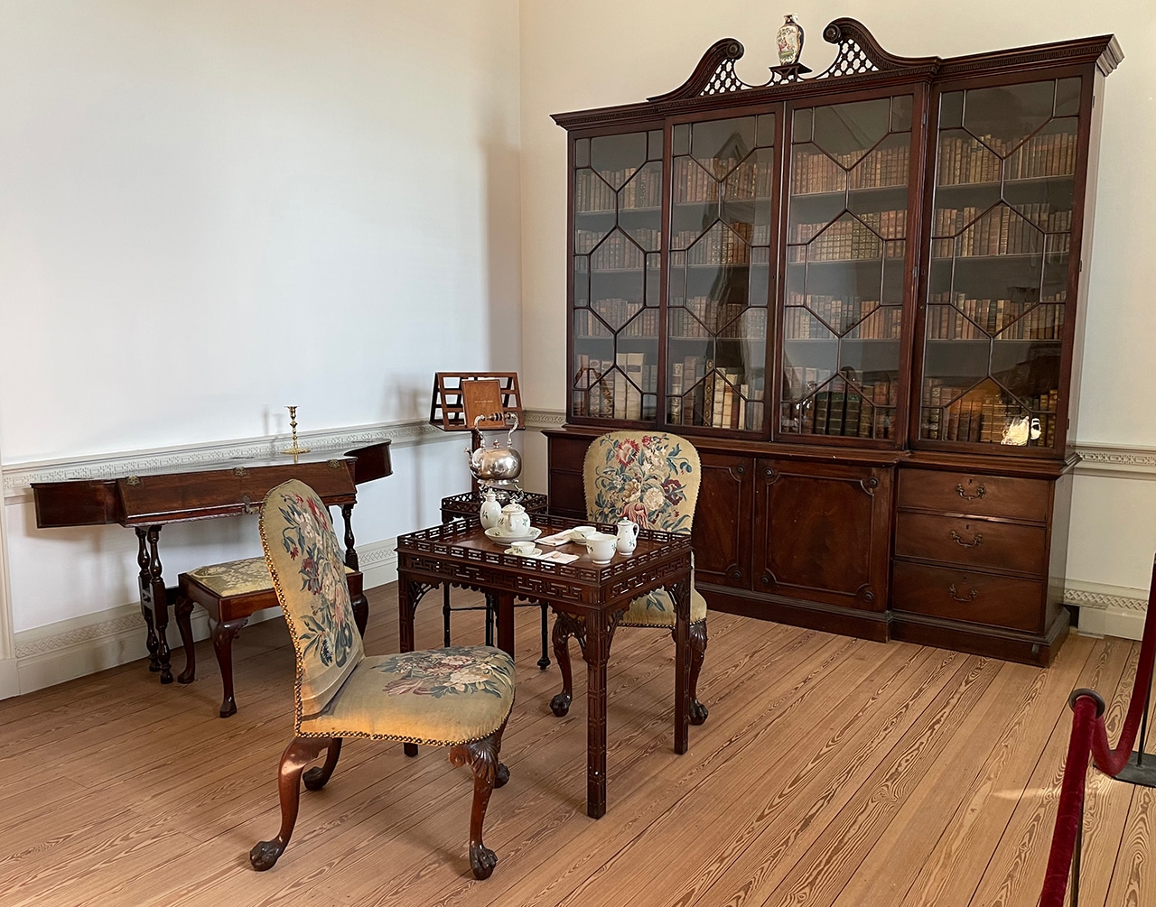 Our next room was set up for a cup of tea, or a card game before or after dinner. Thanks to an extensive list of the house’s contents for insurance purposes, during the restoration most of an extensive collection of Governor Tryon’s books were replaced with the exact same books – some, right down to the print edition. Skylights were a new idea at the time, and very helpful in dark stairways. Shall we go upstairs?