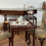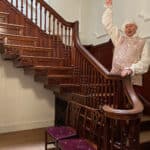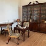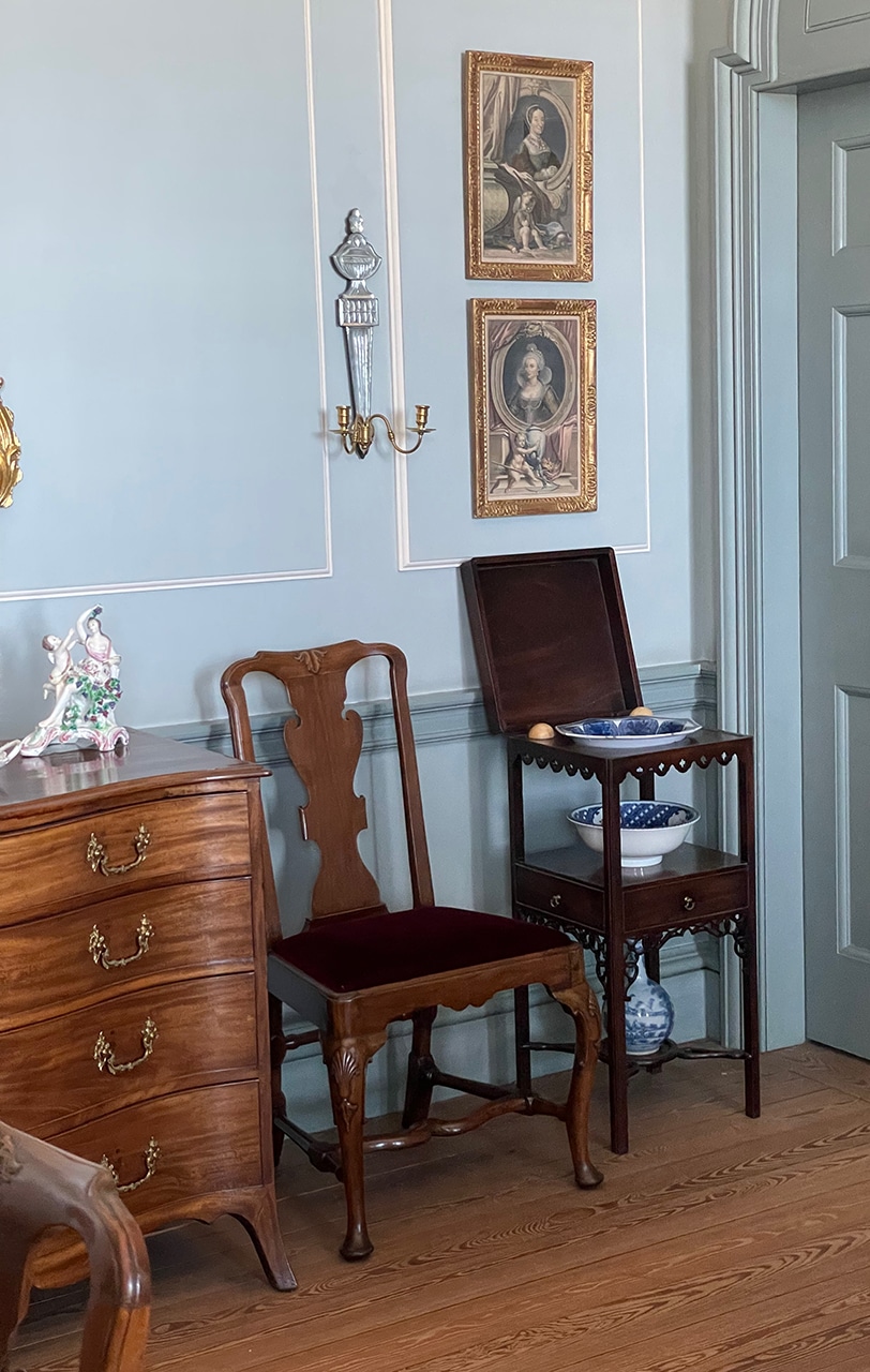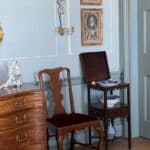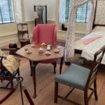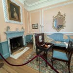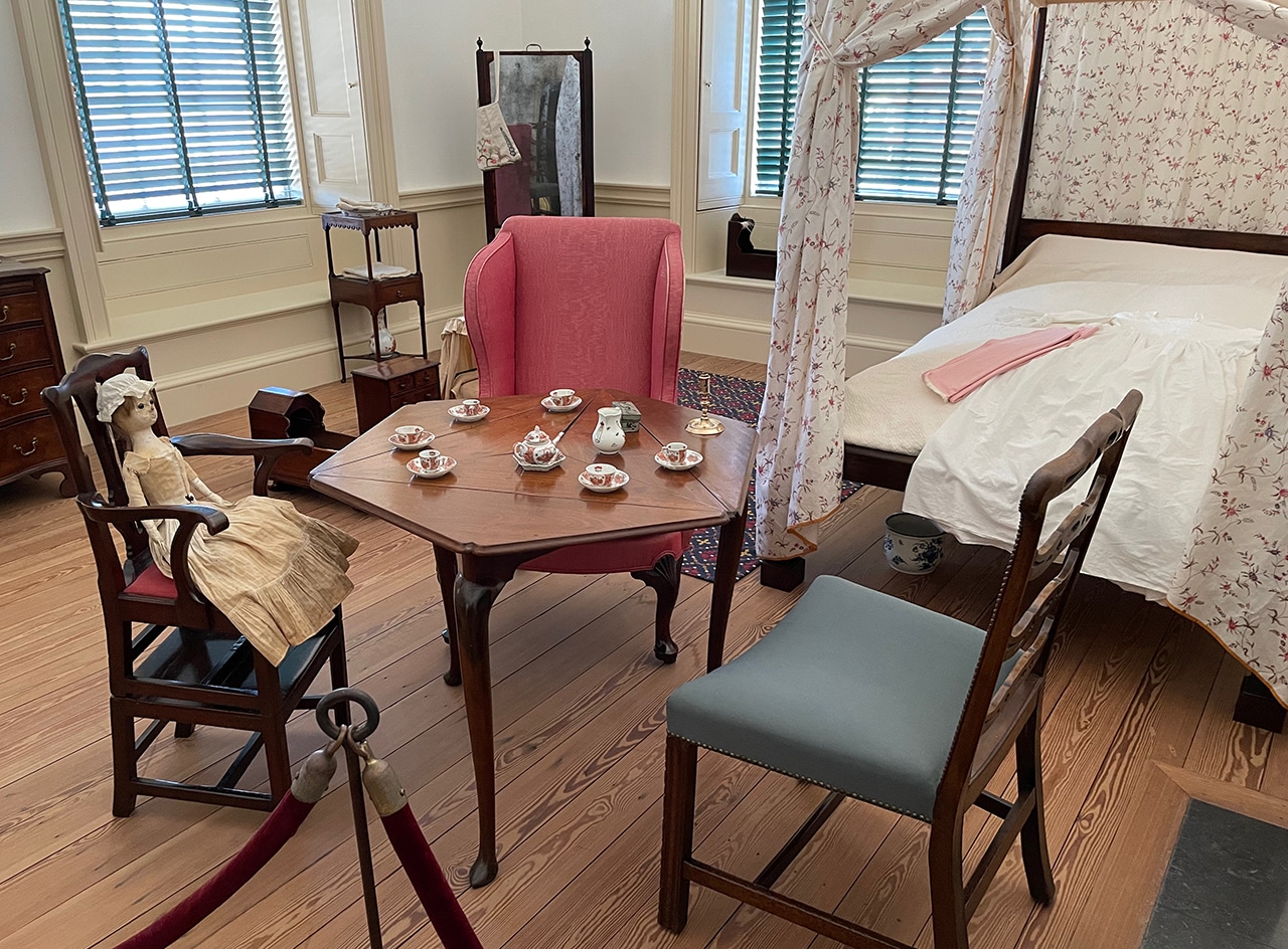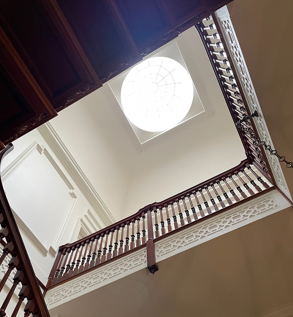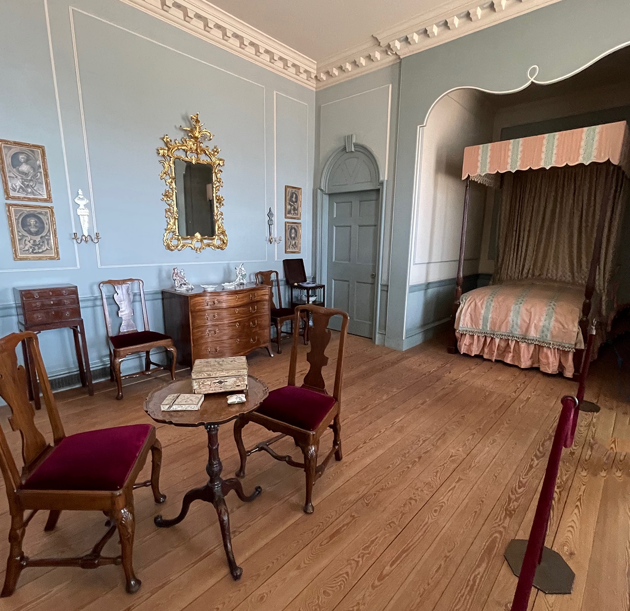 Our next room was set up for a cup of tea, or a card game before or after dinner. Thanks to an extensive list of the house’s contents for insurance purposes, during the restoration most of an extensive collection of Governor Tryon’s books were replaced with the exact same books – some, right down to the print edition. Skylights were a new idea at the time, and very helpful in dark stairways. Shall we go upstairs?