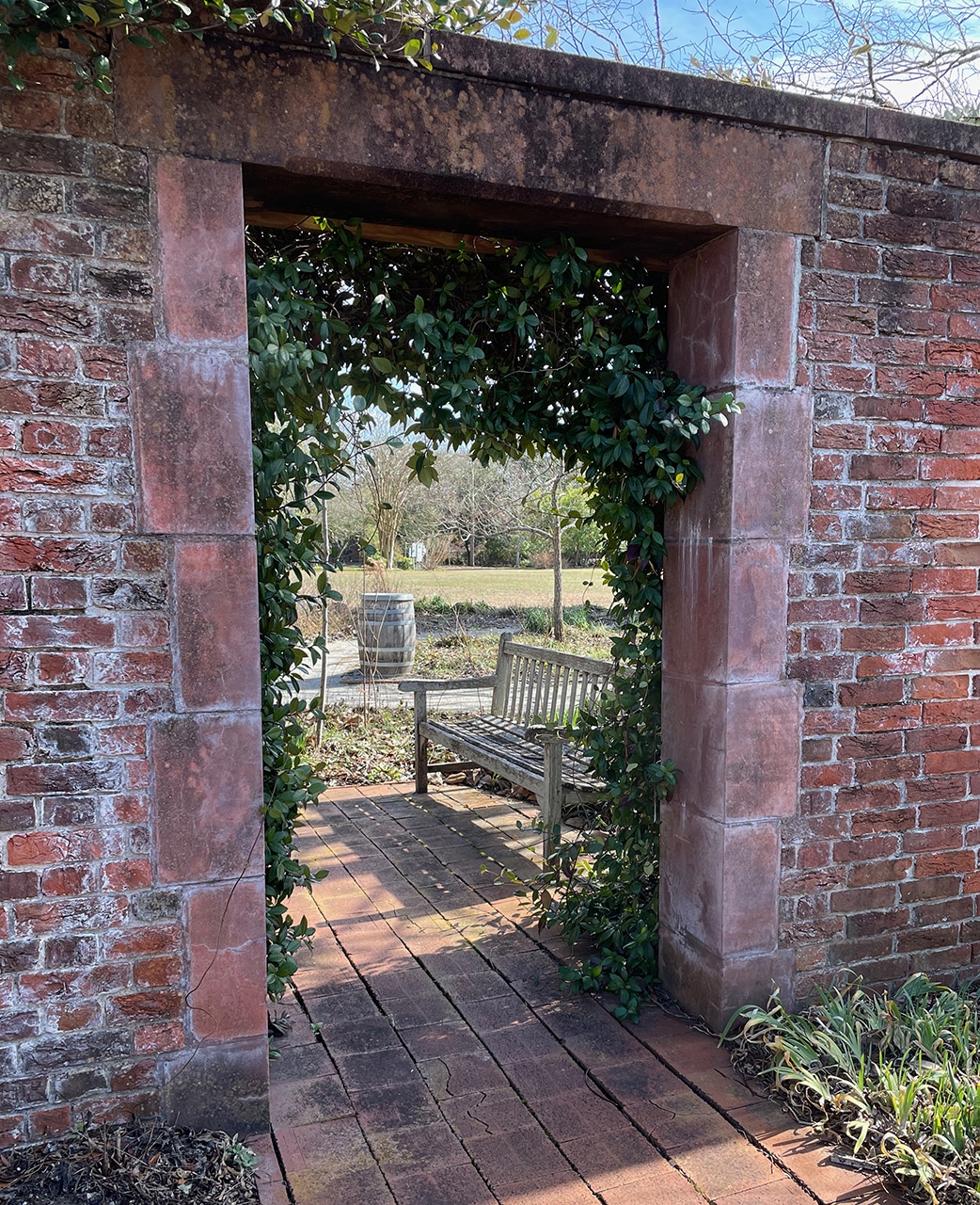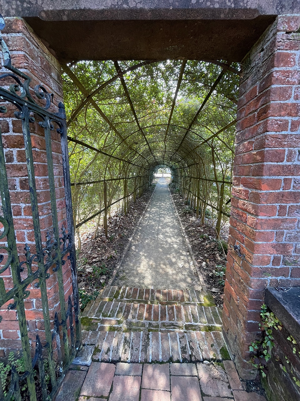 Again, our late January visit didn’t offer much in the way of flowers, but the greenery was beautiful and the arches and entryways were lovely. The sun was in a terrible position for photos of the open area behind the gardens, so I scanned a more aerial photo from the brochure for an idea of the lovely view of the Trent River that the Tryons had from their property.