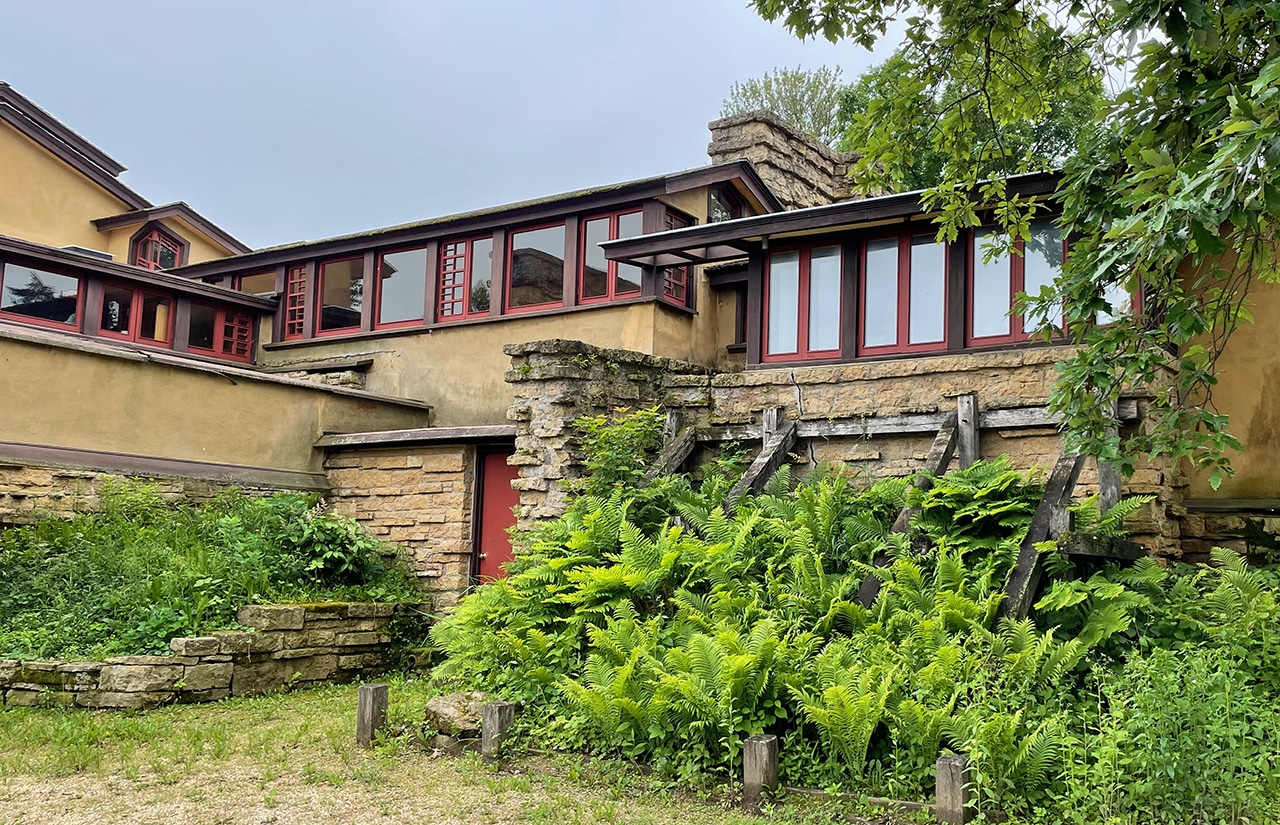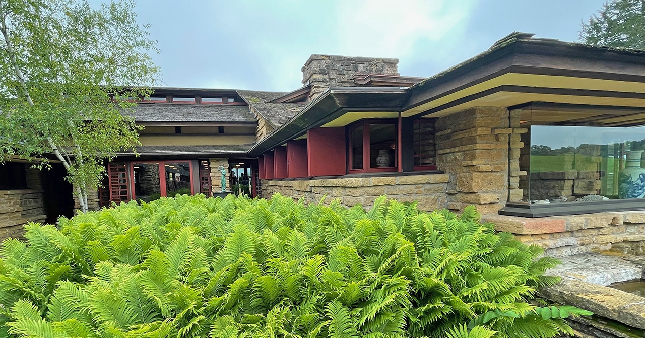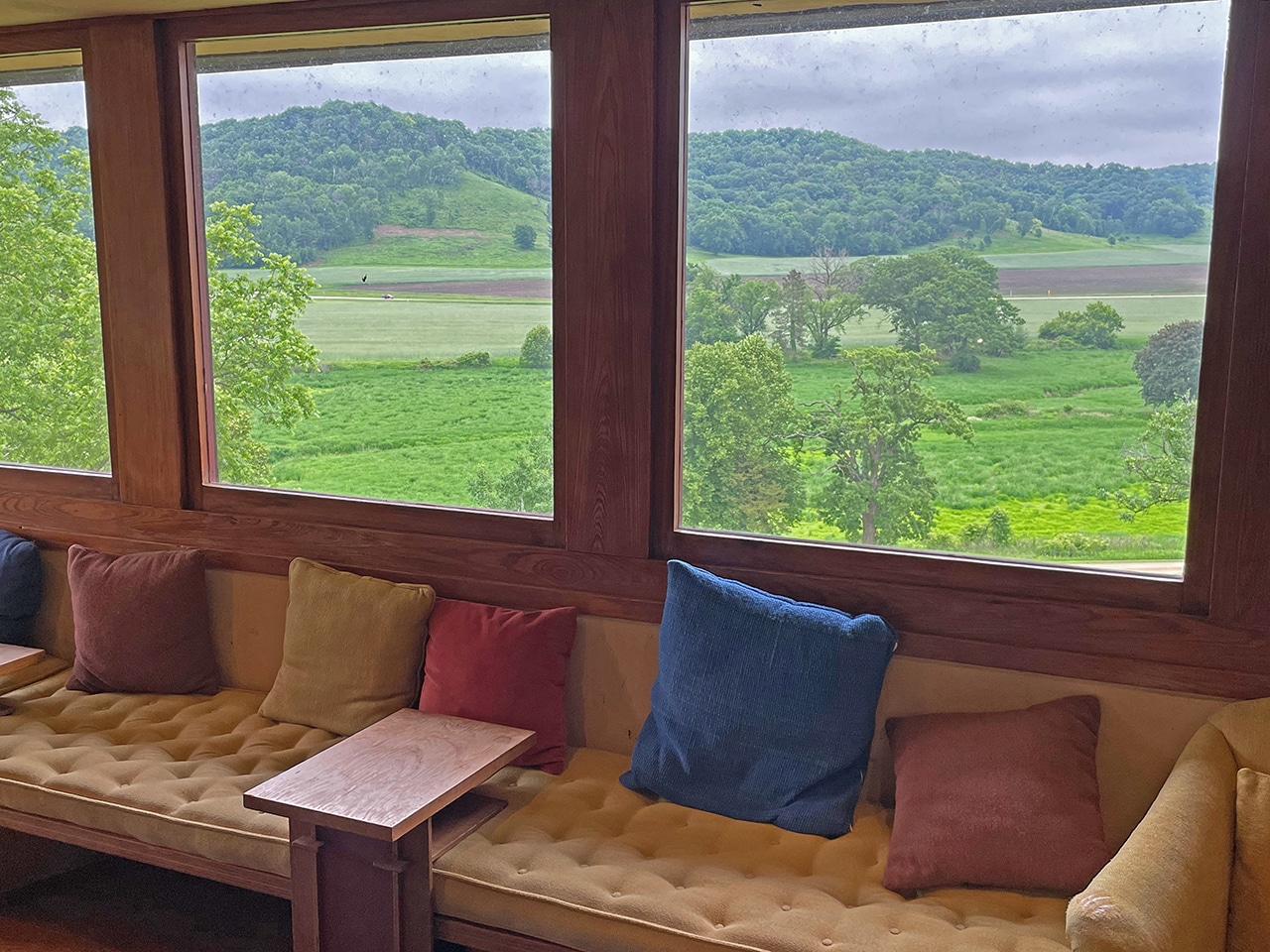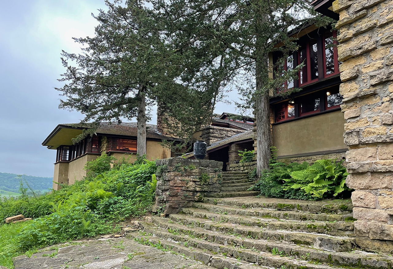 As we say goodbye to Taliesin one more time, we see in the distance the Romeo and Juliet Windmill and Tan-y-Deri – Welsh for “Under the oaks”. Wright designed this house for his sister and her family – Jane and Andrew Porter in 1908. Looks like we haven’t seen everything quite yet! This house can be seen on the four-hour Estate Tour!