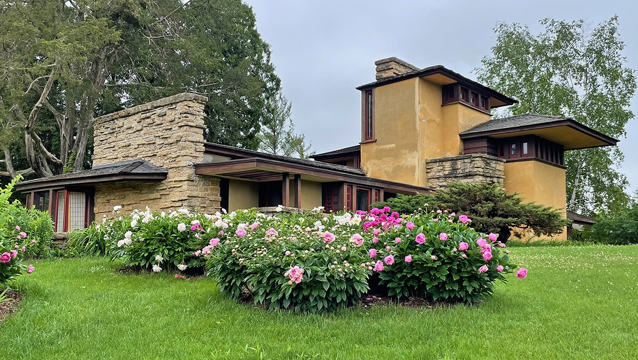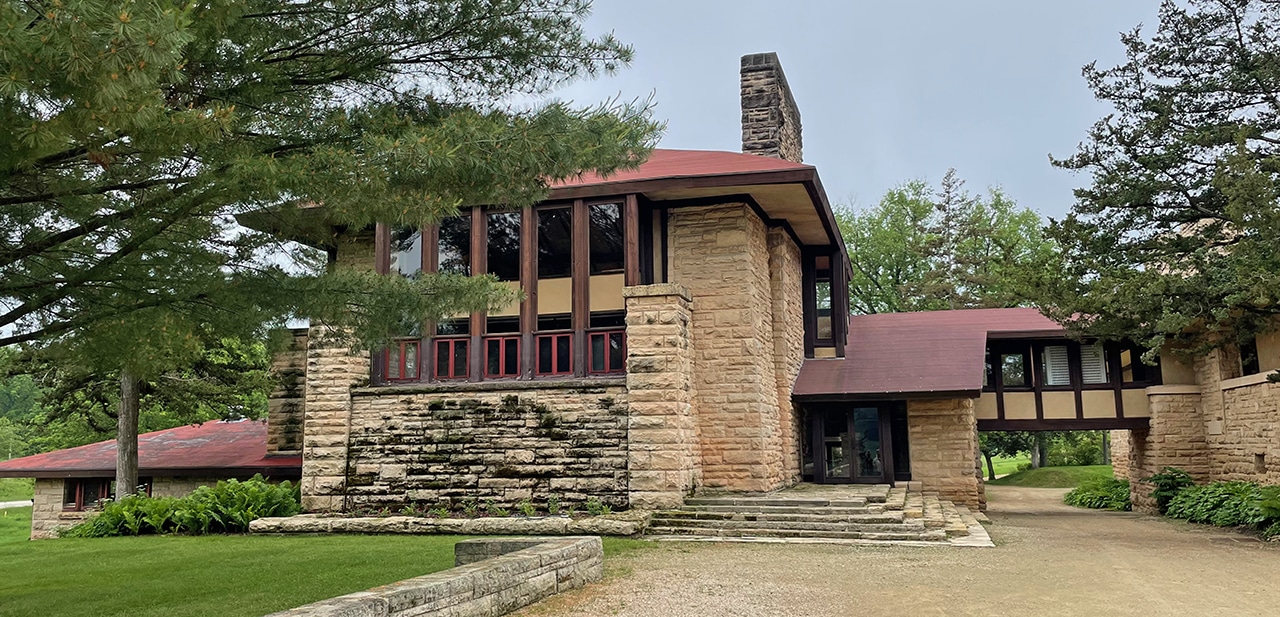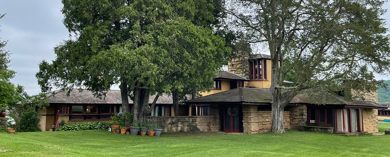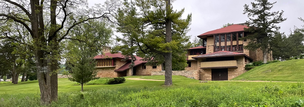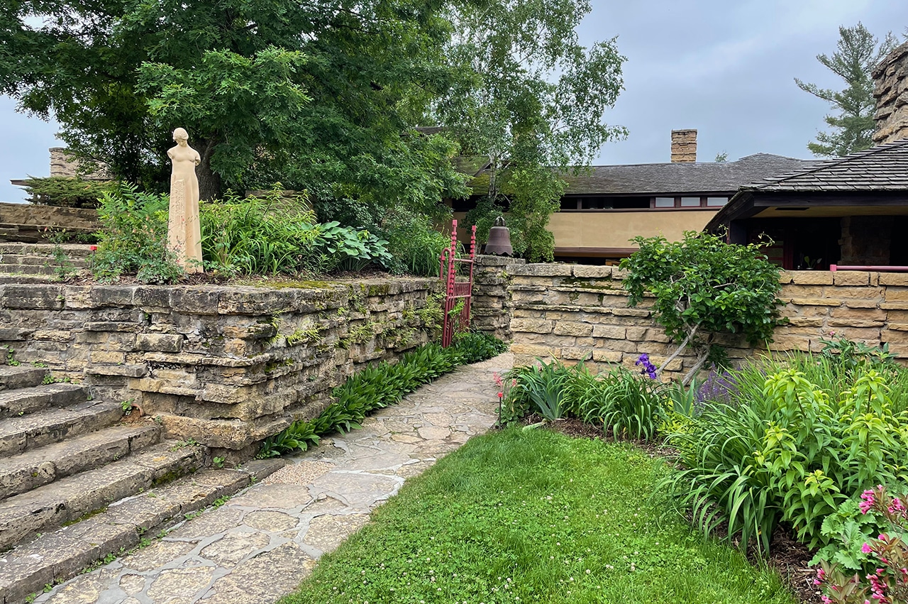 As we say goodbye to Taliesin one more time, we see in the distance the Romeo and Juliet Windmill and Tan-y-Deri – Welsh for “Under the oaks”. Wright designed this house for his sister and her family – Jane and Andrew Porter in 1908. Looks like we haven’t seen everything quite yet! This house can be seen on the four-hour Estate Tour!