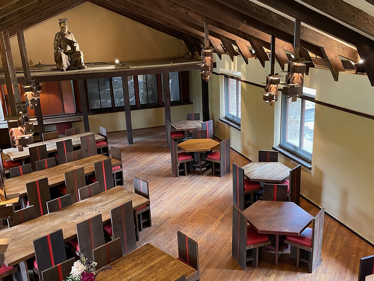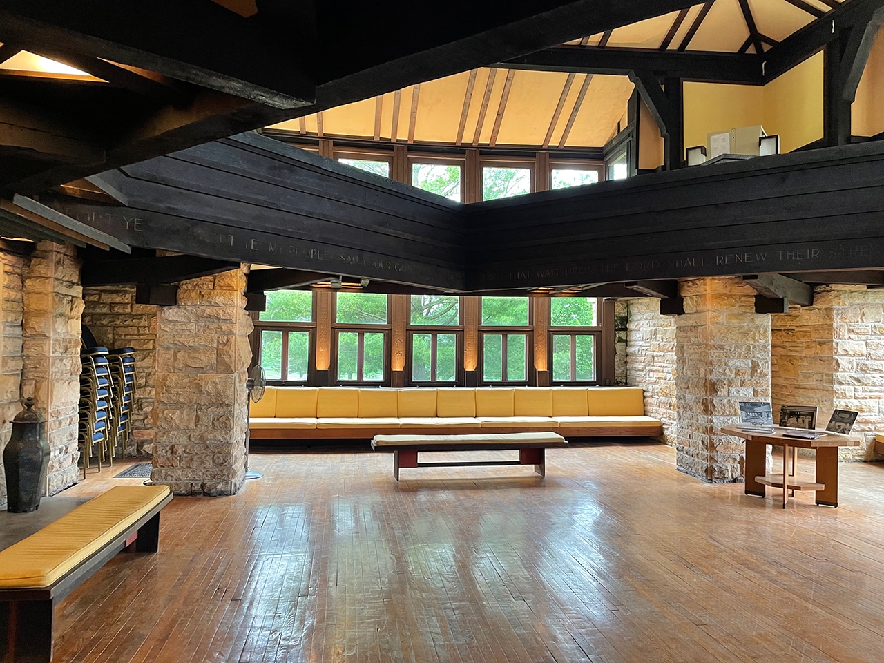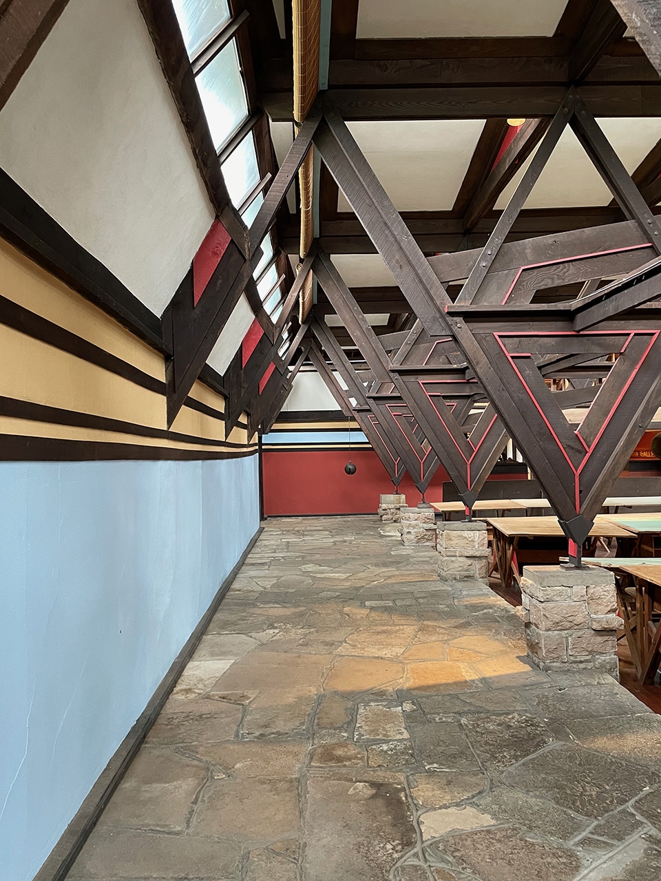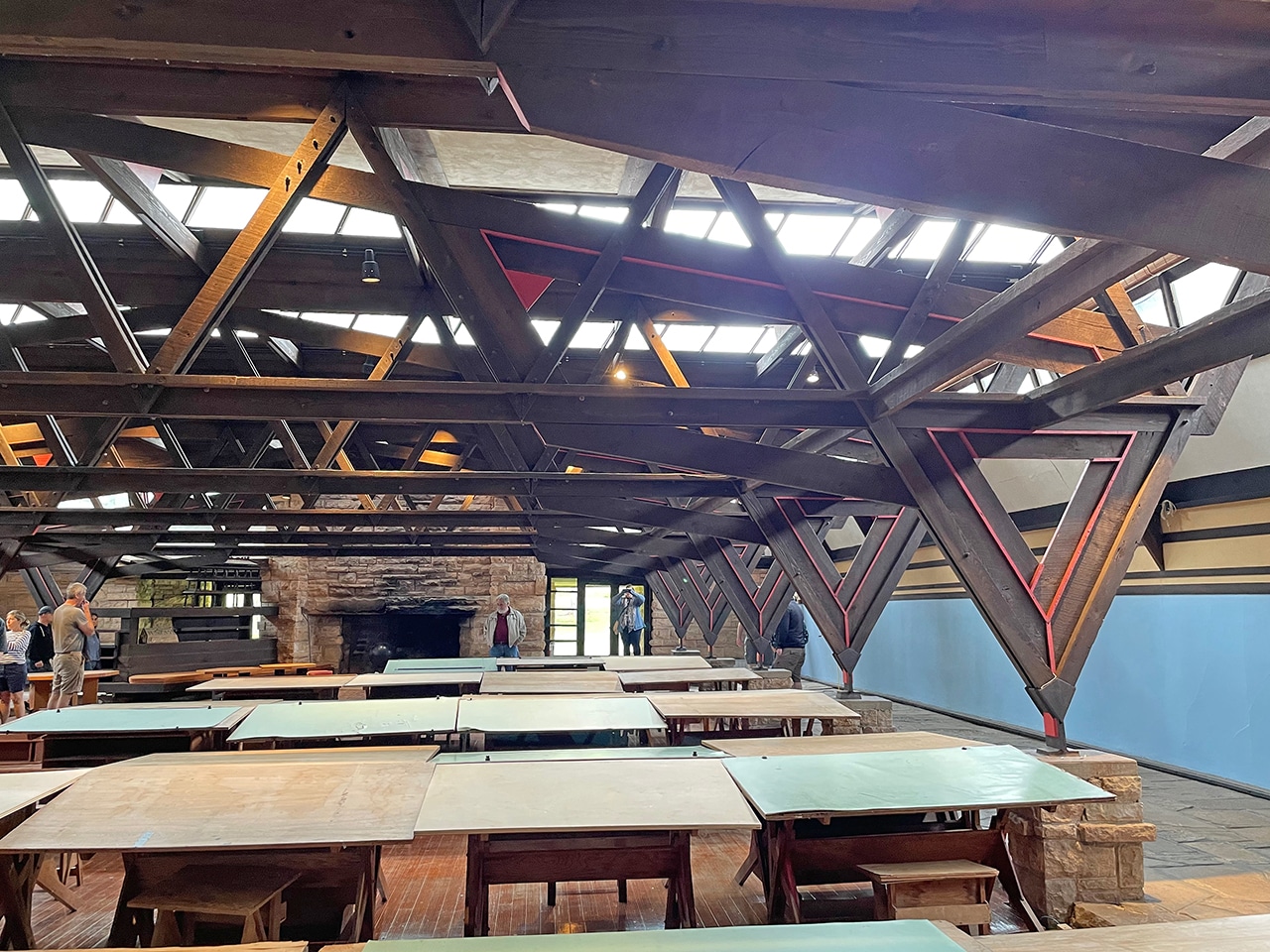 With the inspiration and help of a young and eager group of apprentices, Wright remodeled and expanded the school over and over again – each time trying out new ideas. Pictured below are the Assembly Hall and the Fellowship Dining Room.