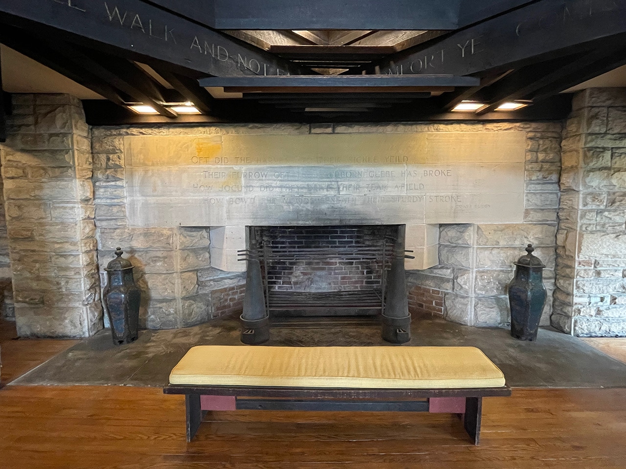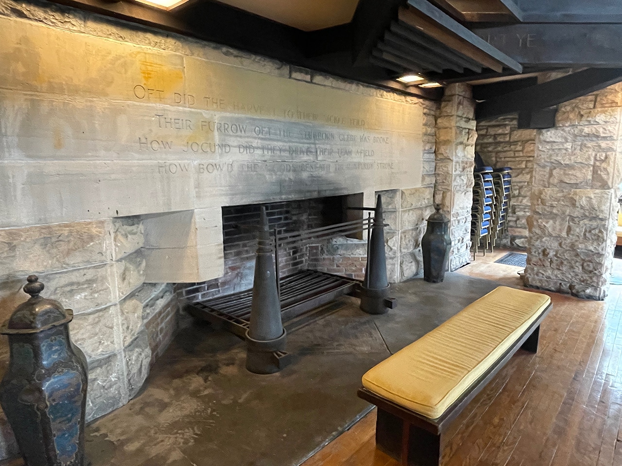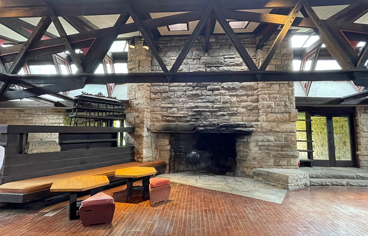 The ceiling in the Assembly Hall above was another of Wright’s ways to bring the outside in. Stripping off the leaves and some of the smaller branches, he was able to create the feeling of a forest for his 5,000 sq. ft. drafting studio. The windows set up high let in the light as it may jut through the leaves in a forest. Wright’s buildings were always situated correctly on their site to collect the sunlight during different times of the day. And of course there would be a fabulous fireplace with seating for everyone!