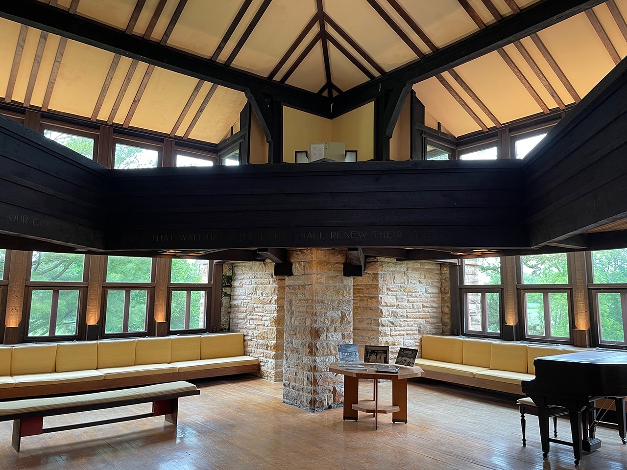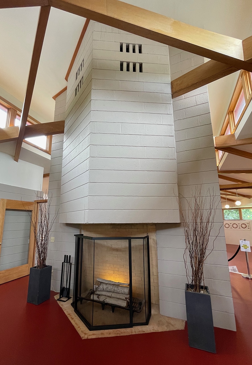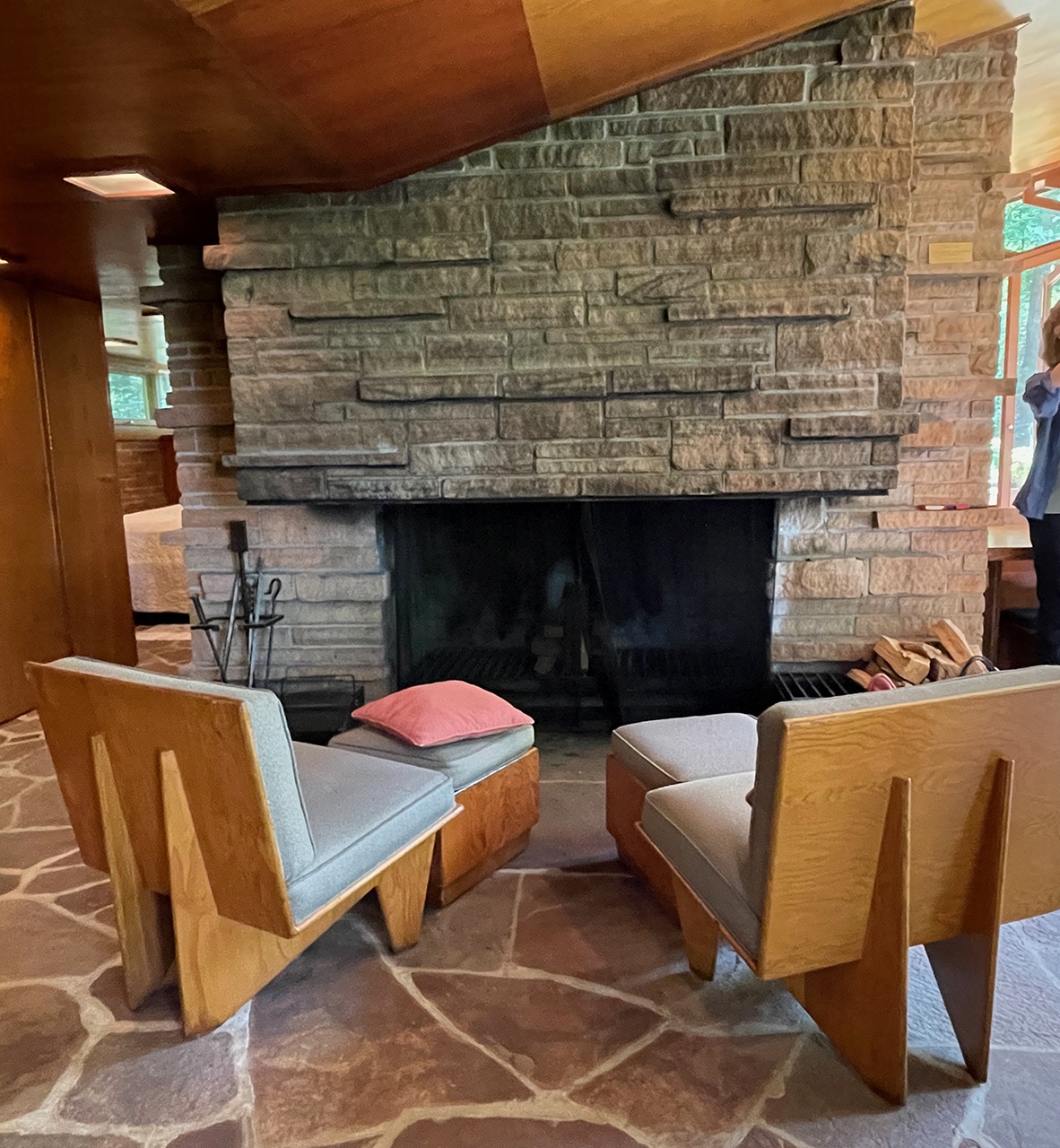 The ceiling in the Assembly Hall above was another of Wright’s ways to bring the outside in. Stripping off the leaves and some of the smaller branches, he was able to create the feeling of a forest for his 5,000 sq. ft. drafting studio. The windows set up high let in the light as it may jut through the leaves in a forest. Wright’s buildings were always situated correctly on their site to collect the sunlight during different times of the day. And of course there would be a fabulous fireplace with seating for everyone!