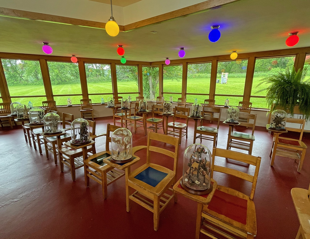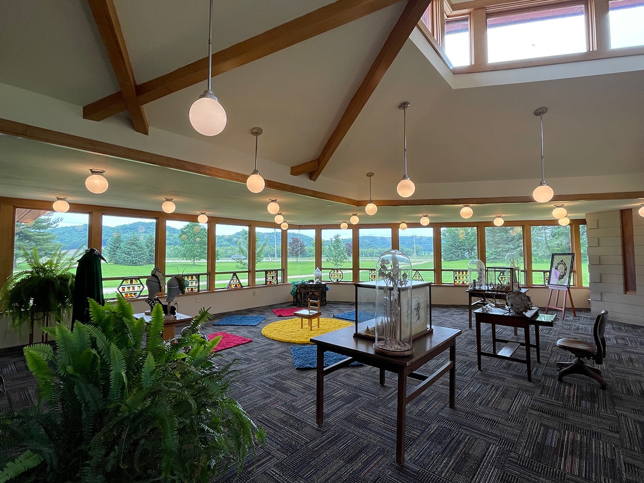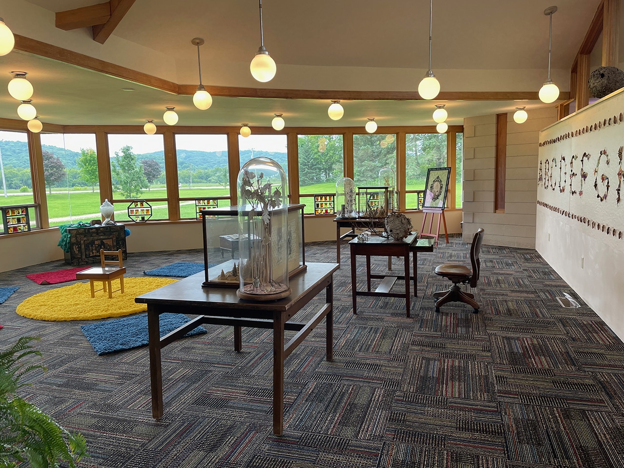 This exhibition was a great opportunity to see this building after its major renovation. Just three miles south of Taliesin in Spring Green, Jennifer’s installation is “educational, interactive, and a perfect fit for this historic school.” She was thrilled to have her first installation in a Frank Lloyd Wright space, and she called it “inspiring.”