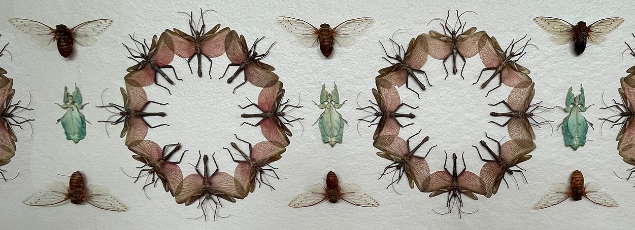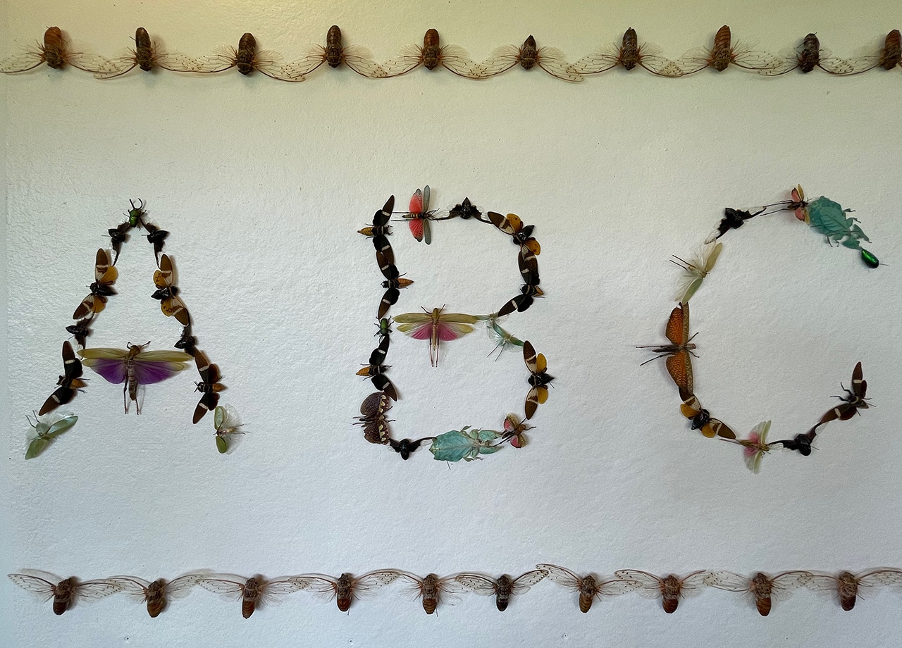 Jennifer Angus is a professor in Design Studies at the University of Wisconsin – Madison, and her medium is insects! The entire school was filled with bugs! Although most were under bell jars, some were right out there in the open and displayed in fascinating ways. The first two photos below look like they could be wallpaper or a stencil for your wall, but the canvas was decorated with actual bugs.