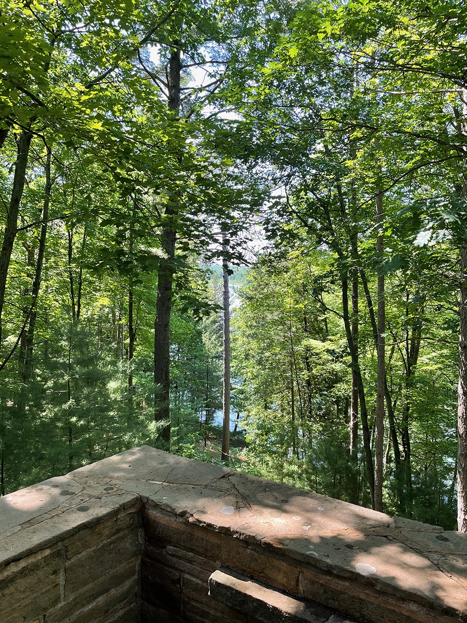 “This 880 square foot Cottage is balanced just on the edge of the steep wooded hill that plunges down to Mirror Lake. Framed by strong terrace buttresses of local Wisconsin sandstone, and with walls of the same stone, the building possesses a monumentality that is surprising to find in such a small structure.