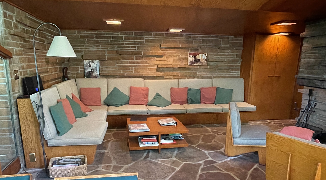 The massive chimney and walls of the building, rising two stories over the bathroom and kitchen, are strong vertical elements that anchor and offset the energetic wedge of the roof. The great flying roof, seeming to hang in space without support, frames the principal views to the west and south. The flagstones used to pave the outside terrace continue inside the building as the cottage floor, manifesting Wright’s philosophy of making little distinction between the outside and inside worlds in which we live.”