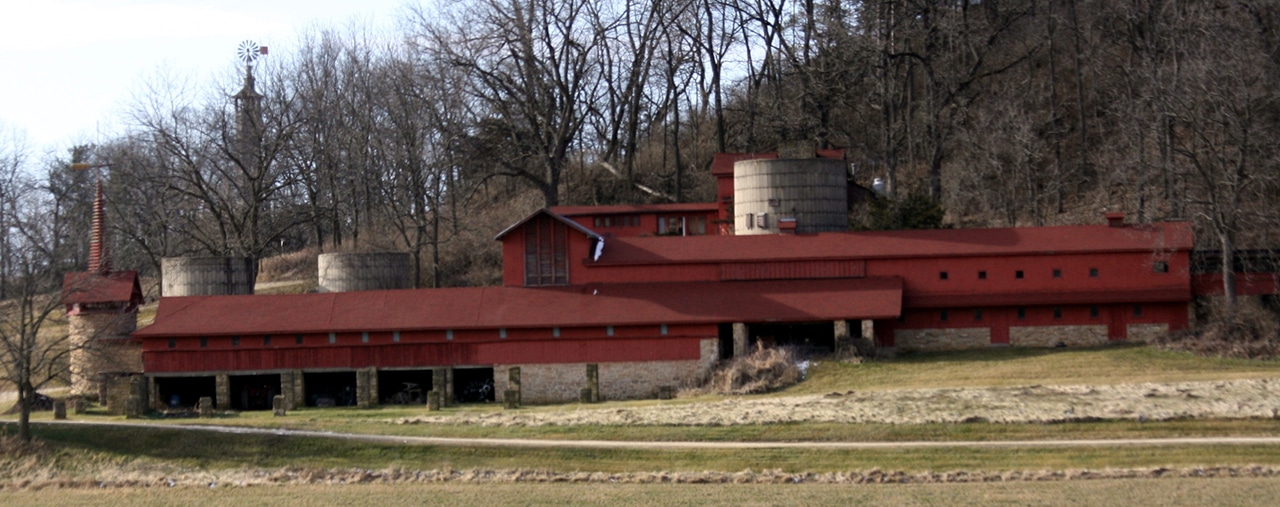 On our way to the residence we were driven through the scenic Taliesin estate past Midway Farm, Taliesin’s former farming complex. Midway Barn was in quite a state of disrepair, so we didn’t even make a stop here. I’ll spare you my crappy picture through a dirty shuttle-bus window and show you a beautiful one from Wikipedia. I will pay attribution to the author here.