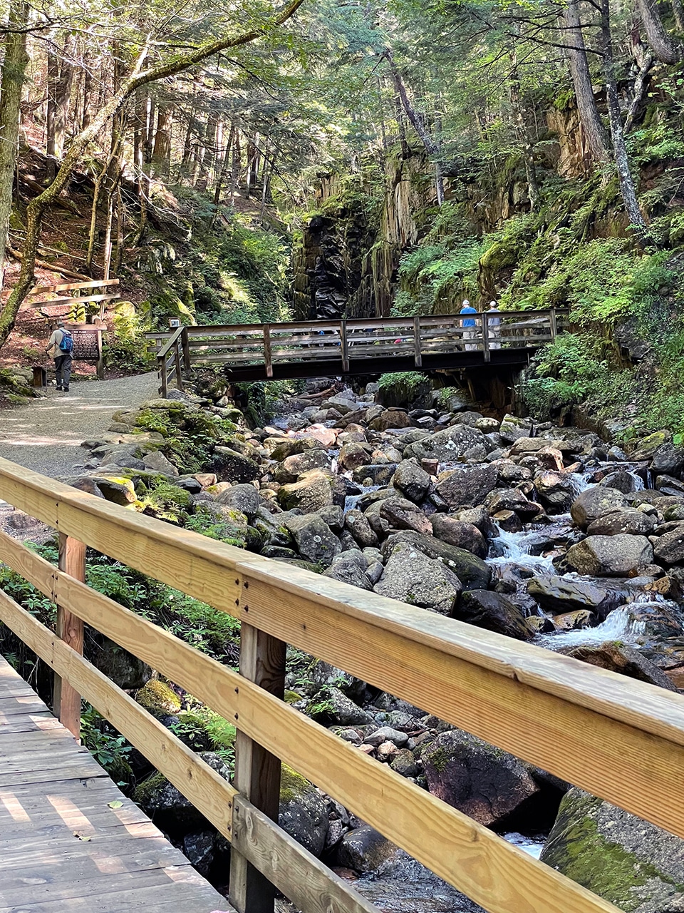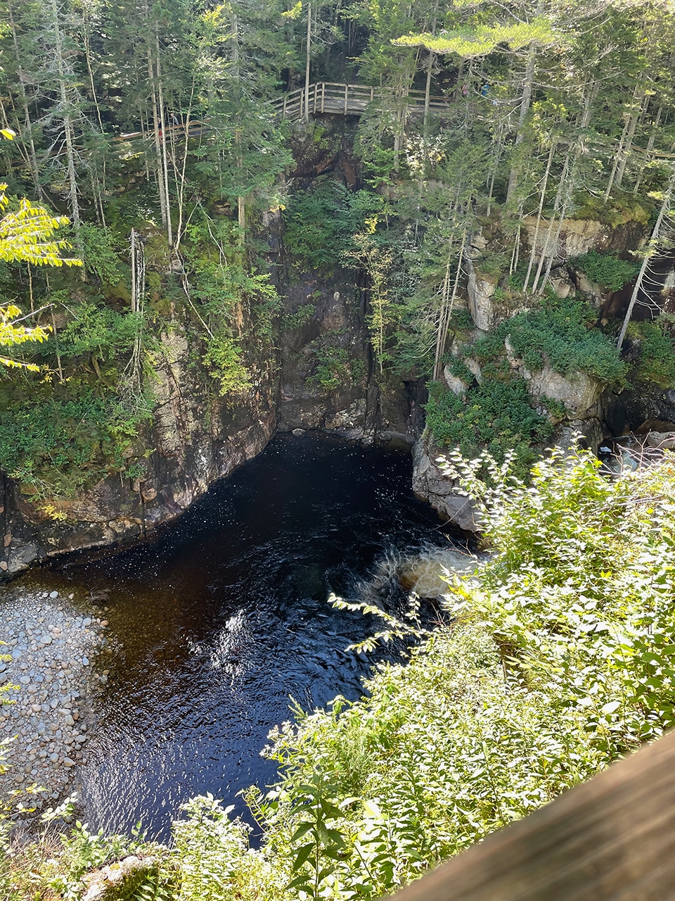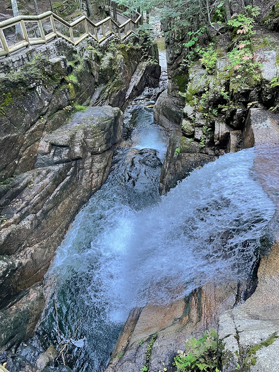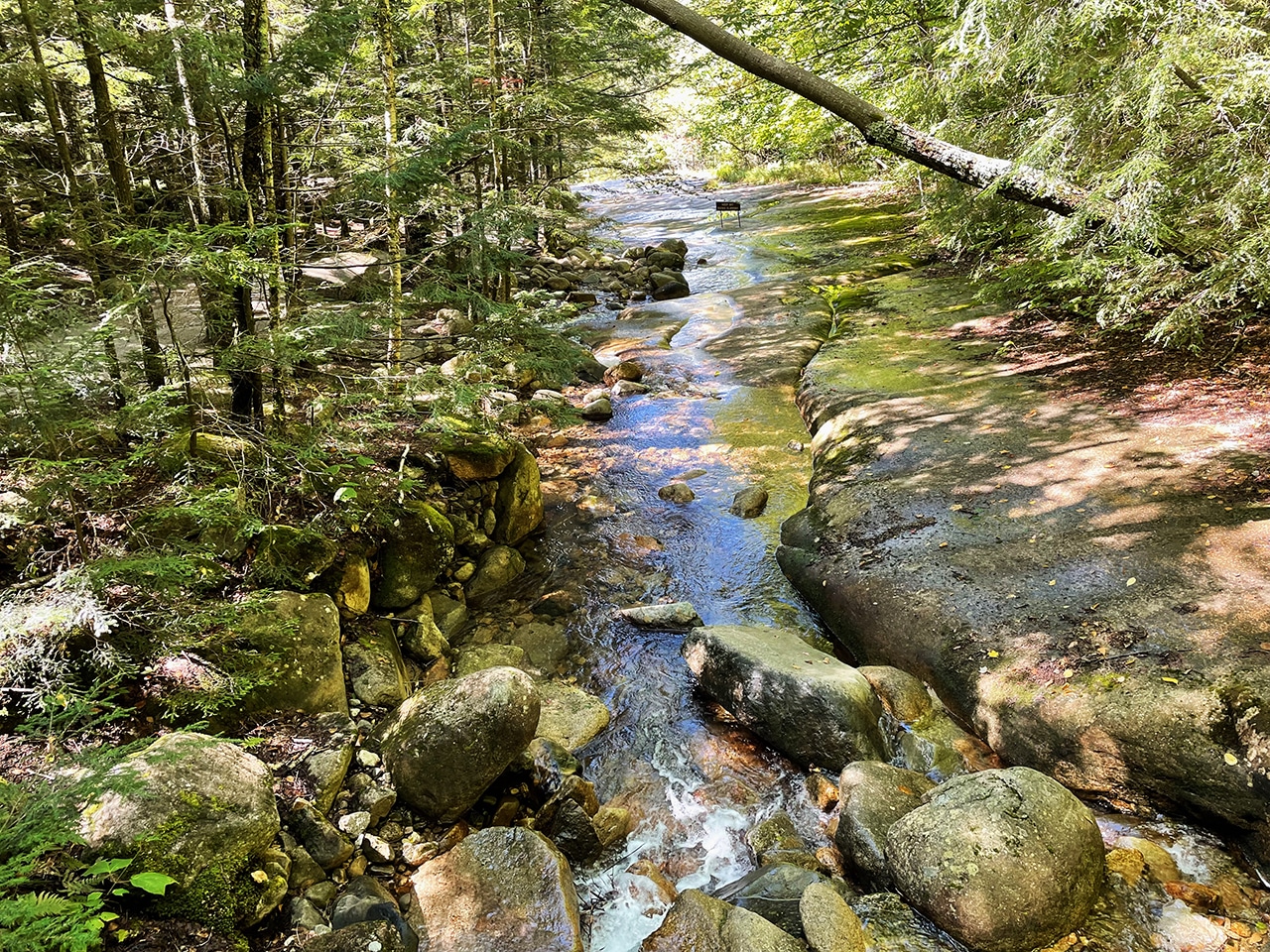 “Beneath this point in the Pemigewasset River is a deep basin. Formed at the time of the ice sheet 25,000 years ago by a silt-laden stream flowing from the glacier. The cliffs surrounding The Pool are 80 feet high, the bowl is 150 feet in diameter, and 40 feet deep.” ~ from a sign nearby