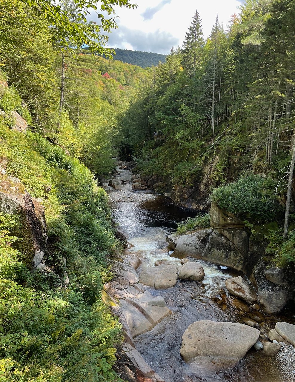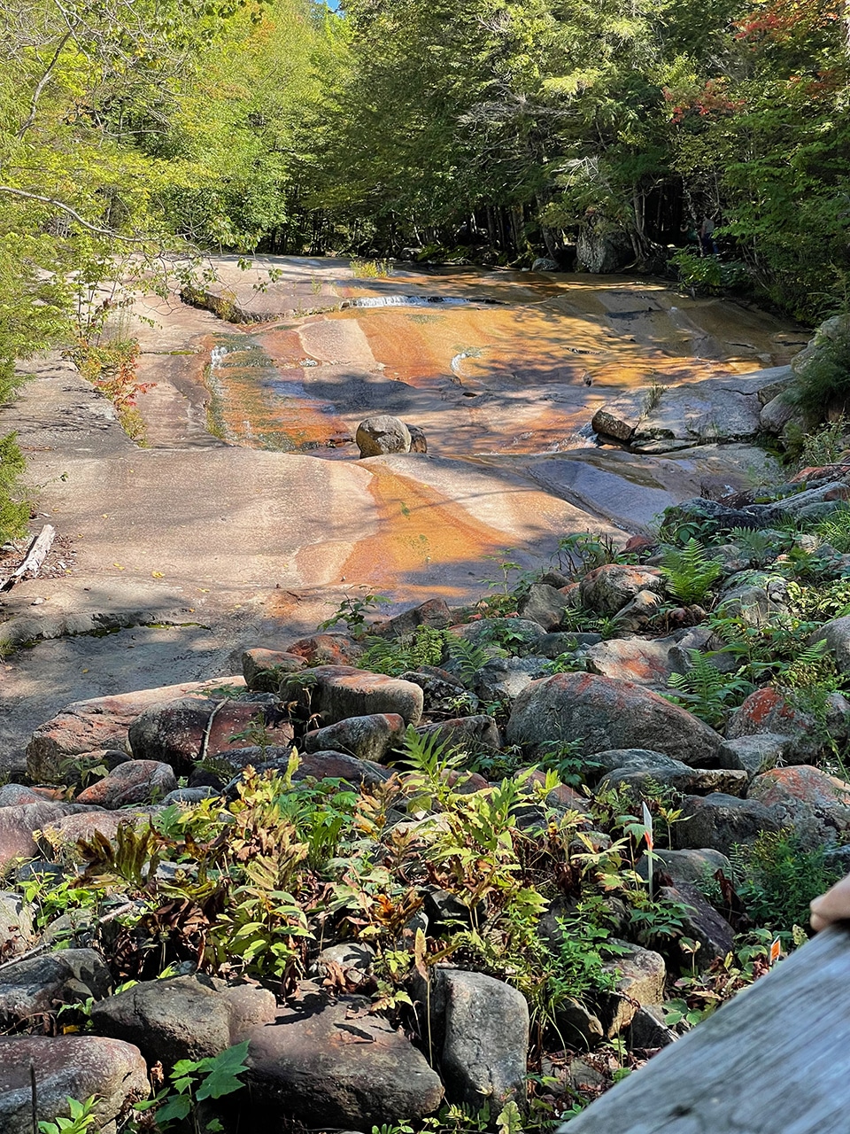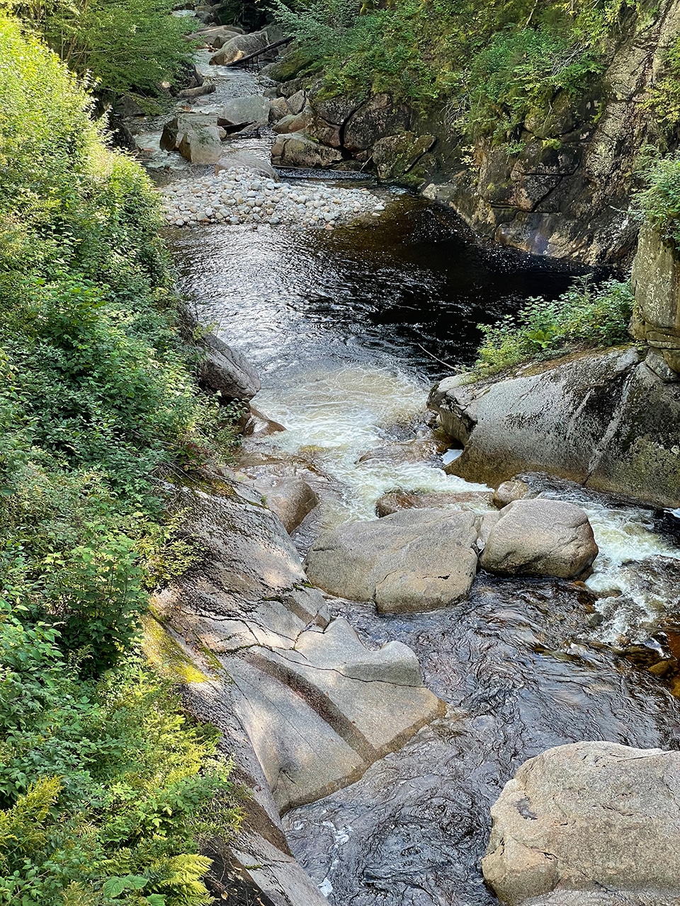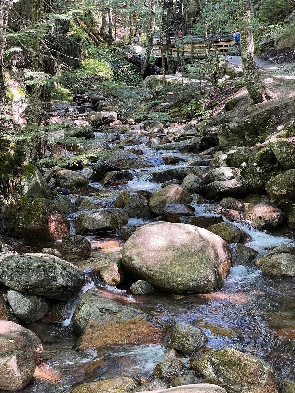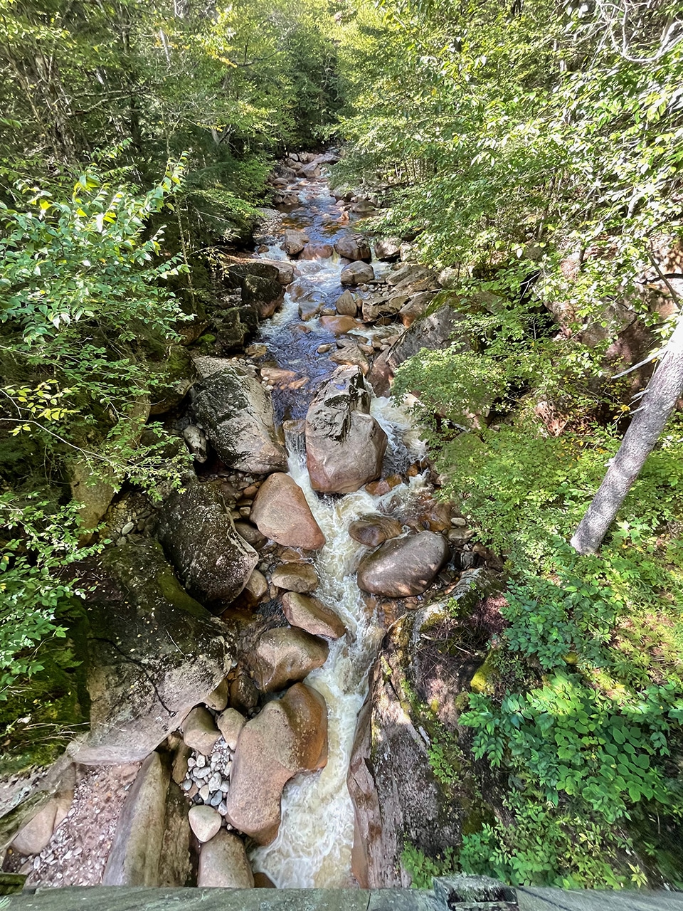 “Beneath this point in the Pemigewasset River is a deep basin. Formed at the time of the ice sheet 25,000 years ago by a silt-laden stream flowing from the glacier. The cliffs surrounding The Pool are 80 feet high, the bowl is 150 feet in diameter, and 40 feet deep.” ~ from a sign nearby