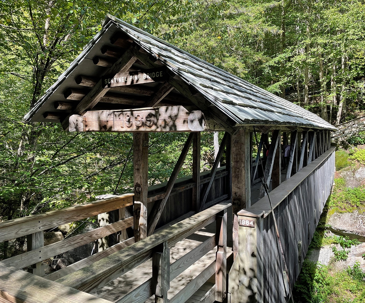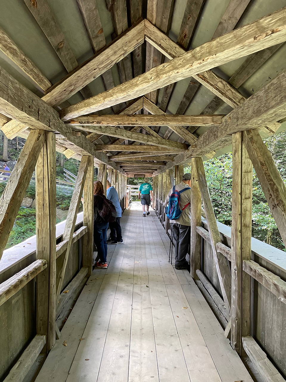 Near The Pool we passed right by a small cave called the Wolf Den, because crawling on all fours is not in our wheelhouse anymore. Covered bridges are, however, just in case you don’t know that by now. Our first glimpse of the Sentinel Pine Bridge is shown below!