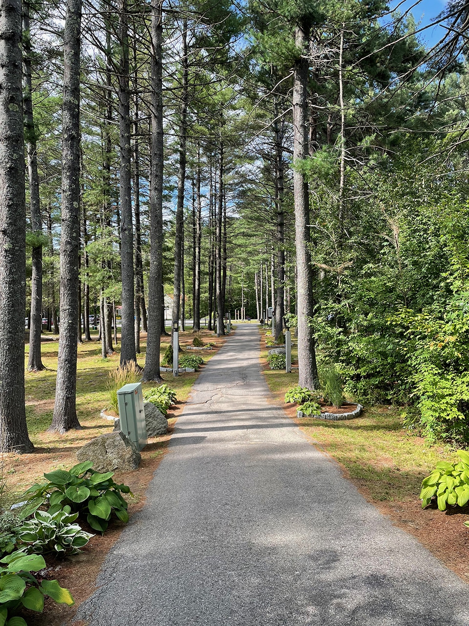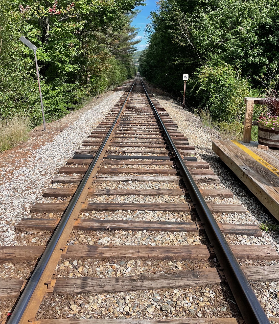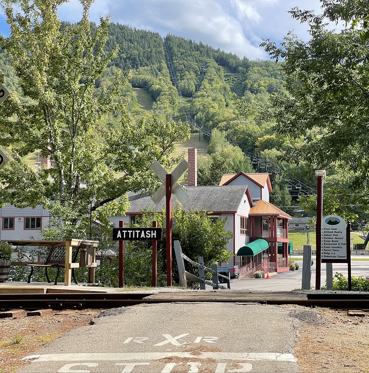 We arrived before checkin at the Attitash Mountain Village – our second week at an RCI resort of this month-long trip. In this case our wait was a very pleasant one. We were told there was a restaurant/bar onsite where we could have killed some time, but it was a lovely day and we decided to explore the resort a little. A quick walk on a wooded path took us back to the condos, and we wondered which one would be ours. We ended up on a bench at the whistle stop.