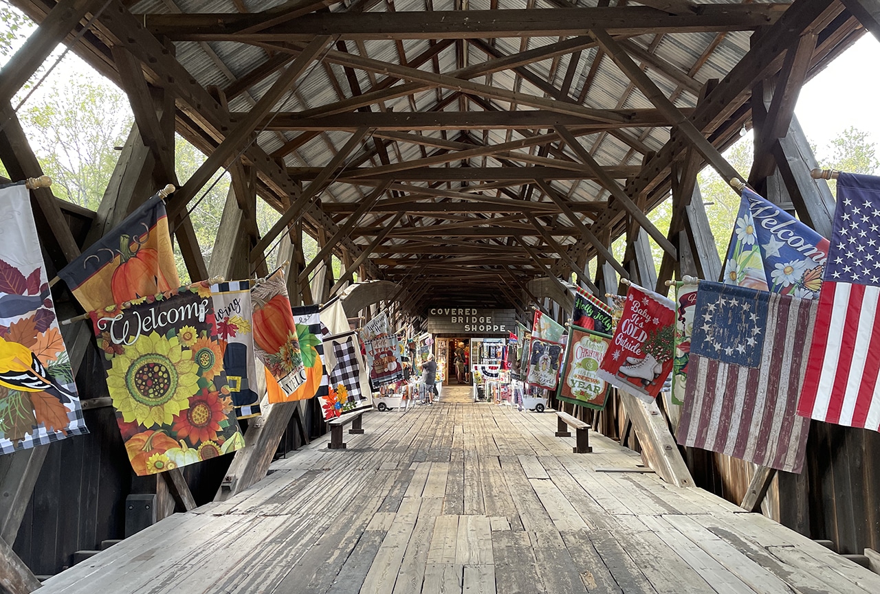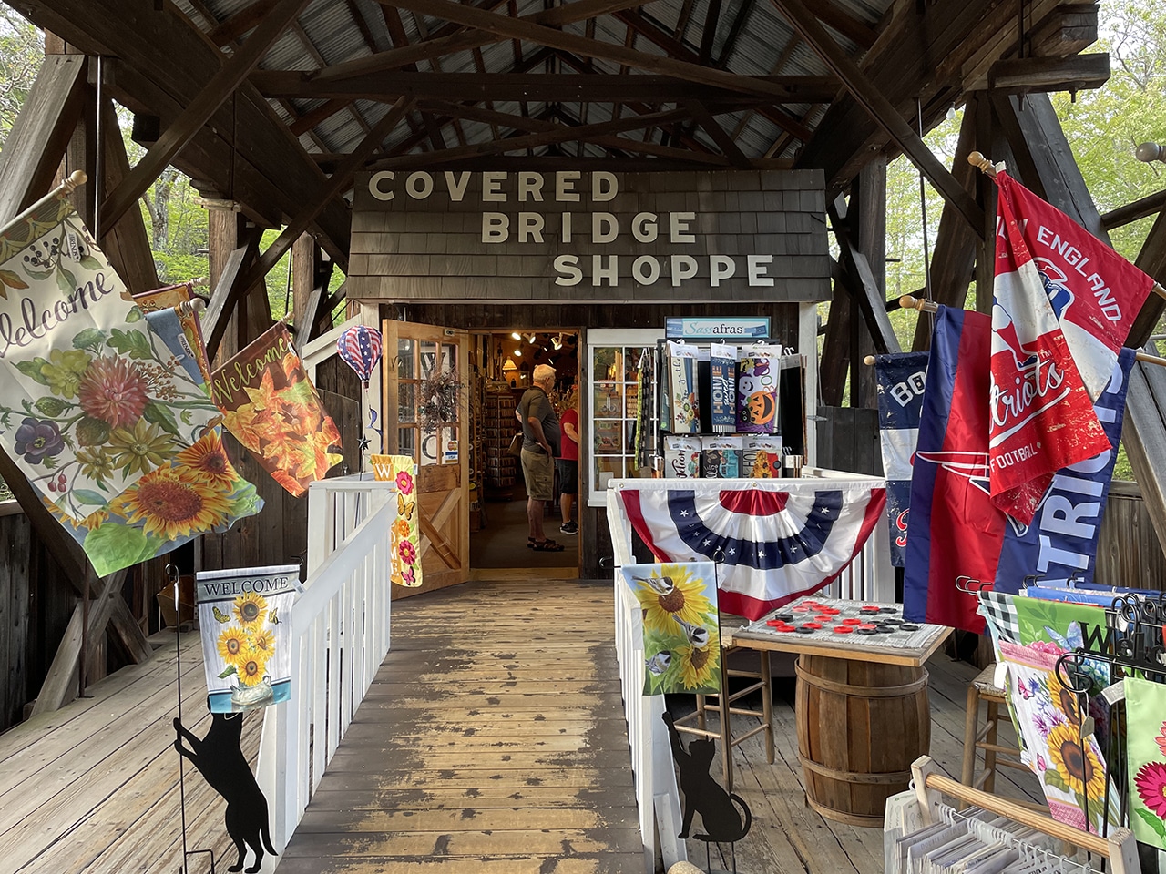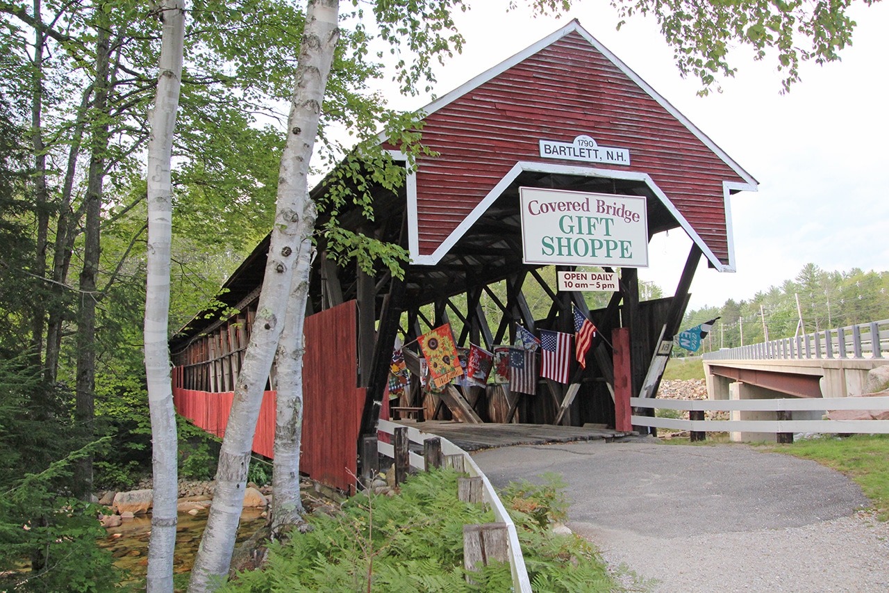 Our last historic covered bridge (of the day) is located right in Bartlett. Built in 1850, it was strengthened for vehicular traffic in the 1920’s. This bridge carried traffic over the Saco River for more than 80 years until it was replaced by a steel bridge in 1939. In 1965, the bridge and the land around it were sold and this gift shop was built inside. The fourth owners of this historical property plan to maintain its condition for future generations to enjoy. Click on the link to get more history and more information about the Bartlett Covered Bridge Gift Shoppe.