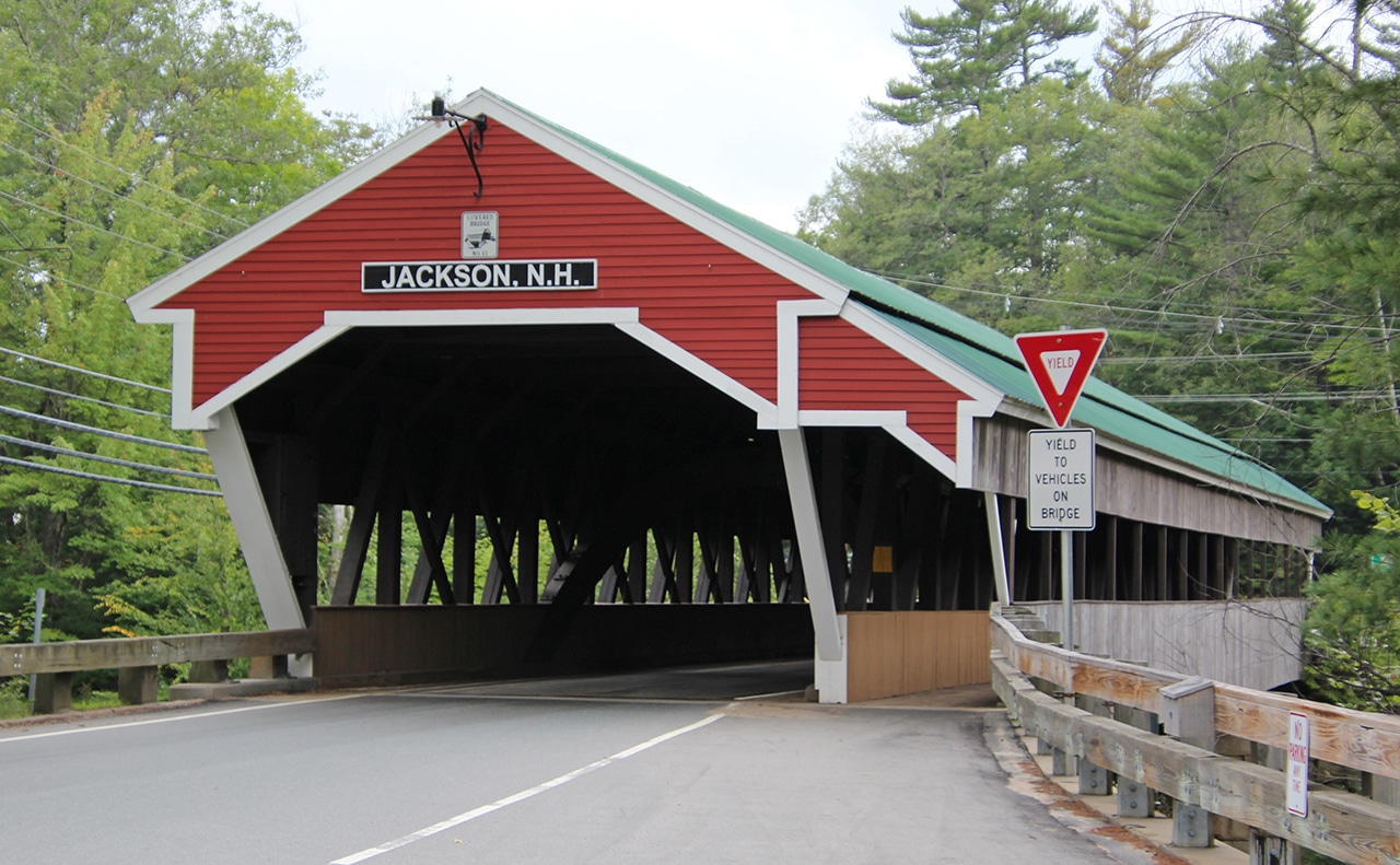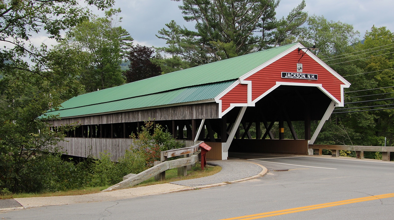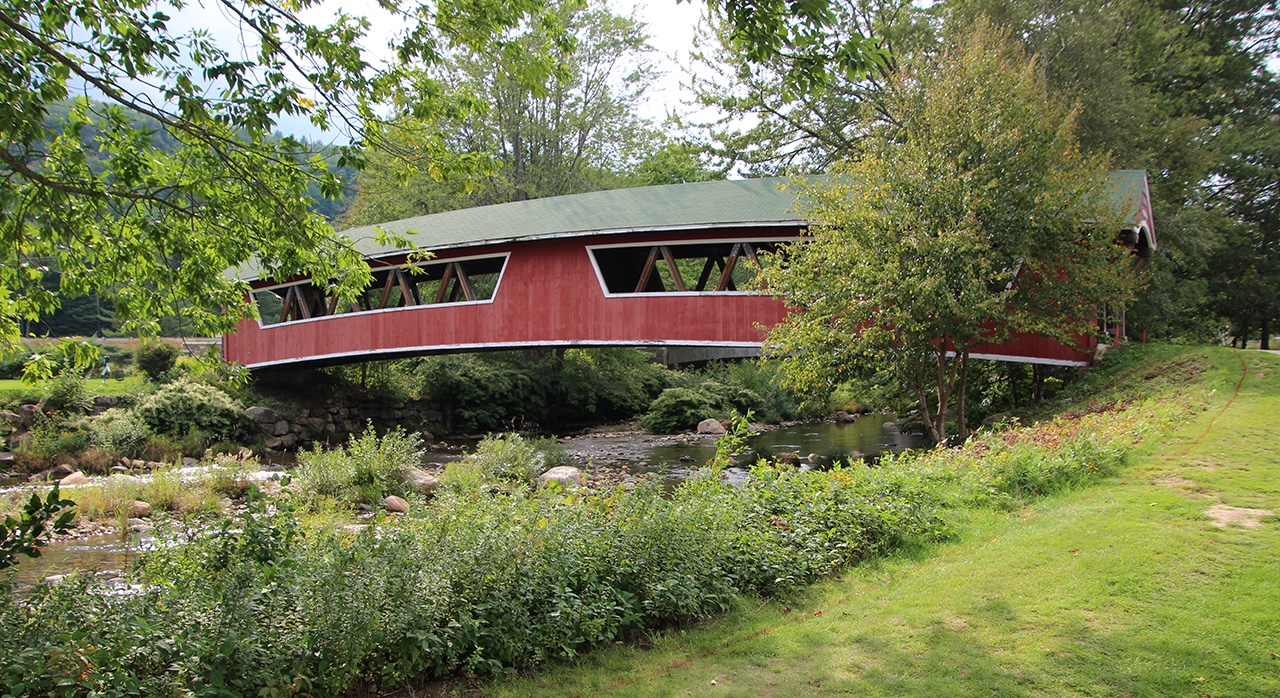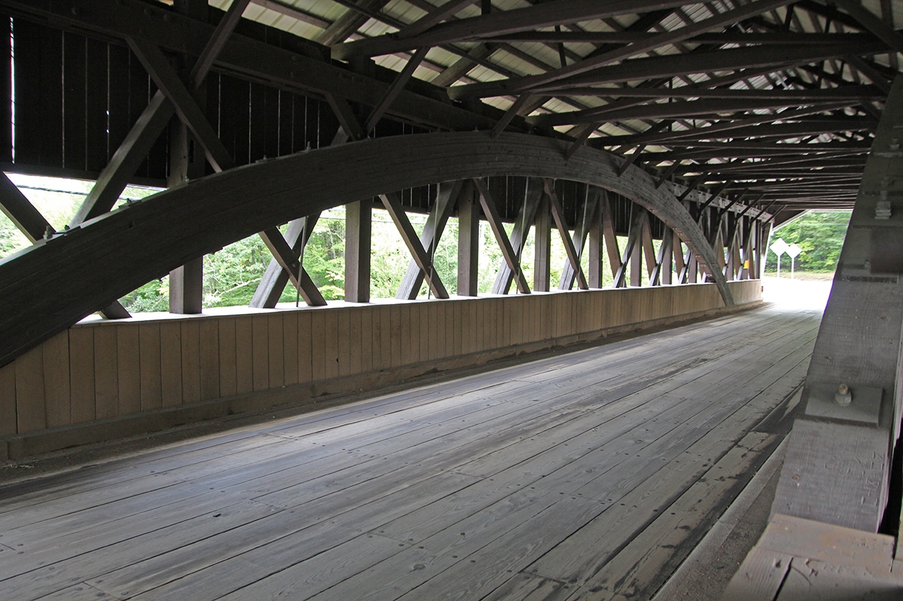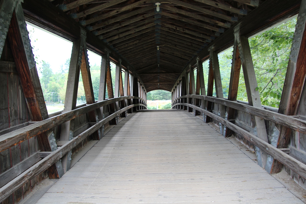 This covered bridge was built by Charles Broughton and his son. During the Civil War Charles was a sergeant in the 18th Regiment of the New Hampshire Volunteers, Company E. He was a finish carpenter, an avid fiddler, and a skillful bear hunter. For ten years he was an agent for the Swift River Lumber Company in Albany, New Hampshire. According to town records, the sidewalk was added in 1930. Originally, the trusses were more exposed than they are today. In 1965 the approach from N.H. Route 16 was rebuilt to improve visibility and to provide parking. The Honeymoon Bridge is eligible for listing on the National Register of Historic Places.