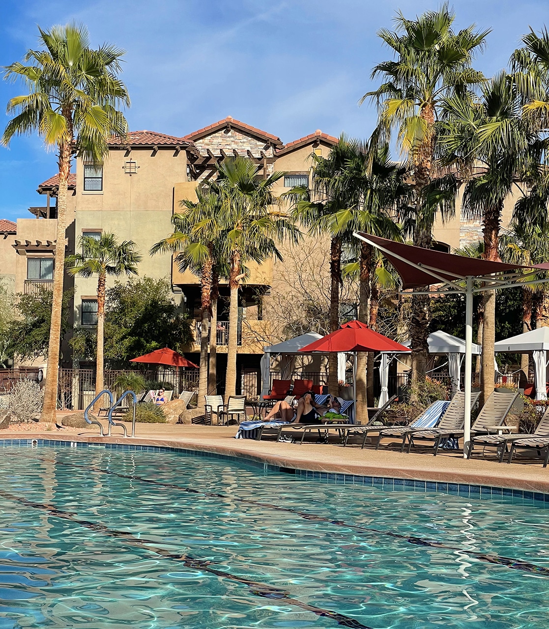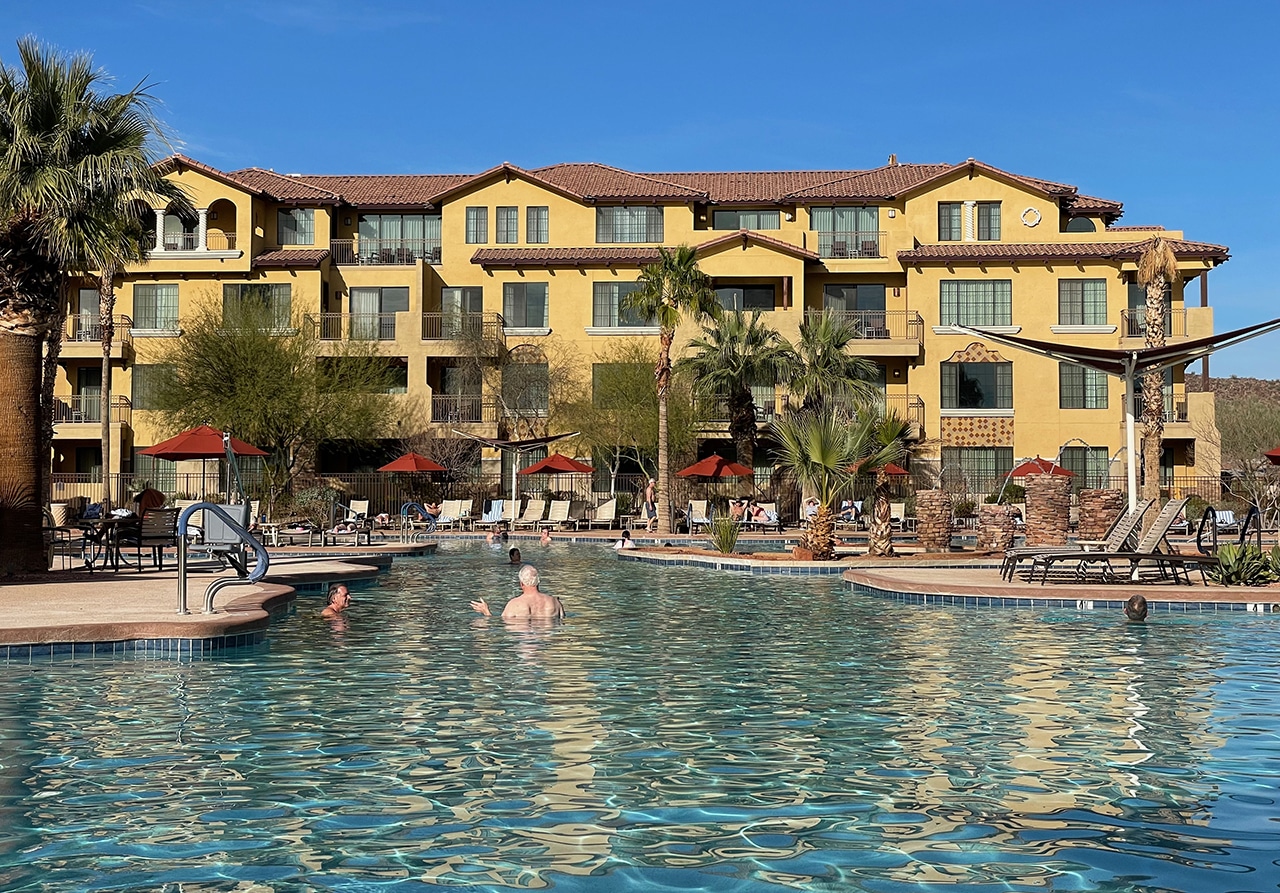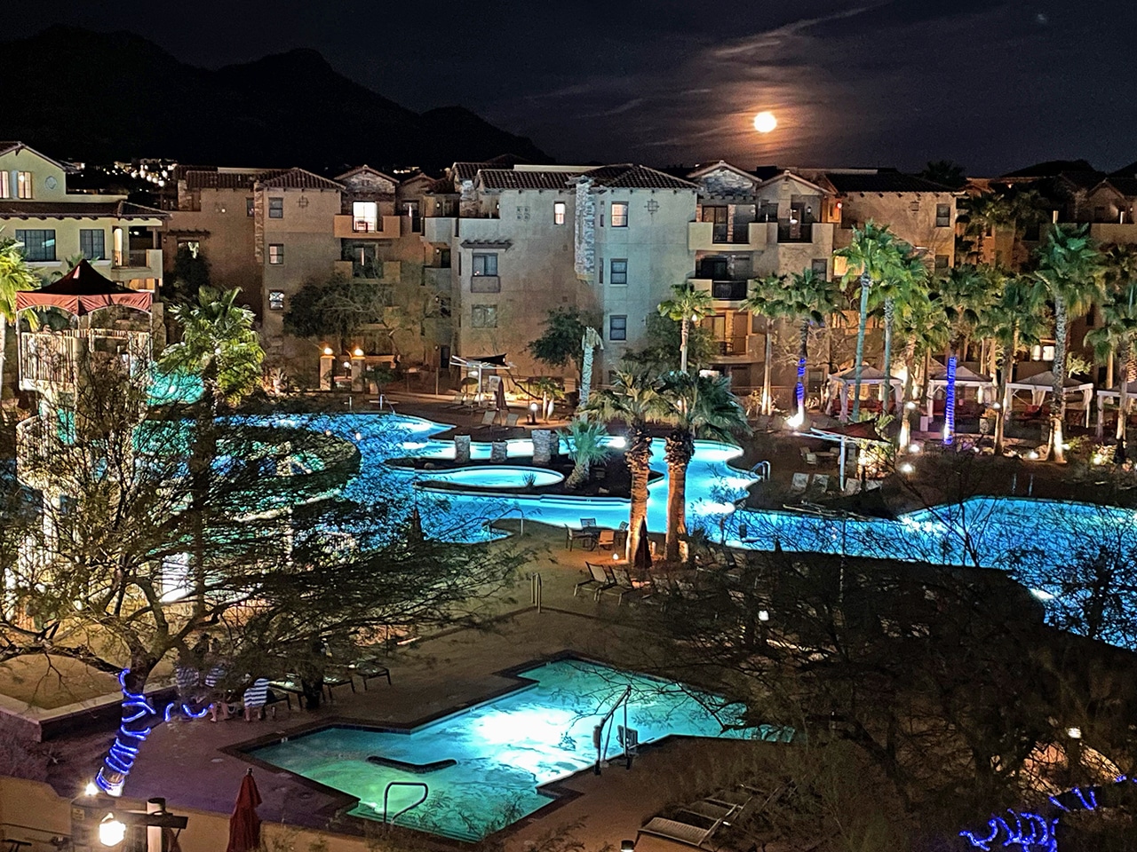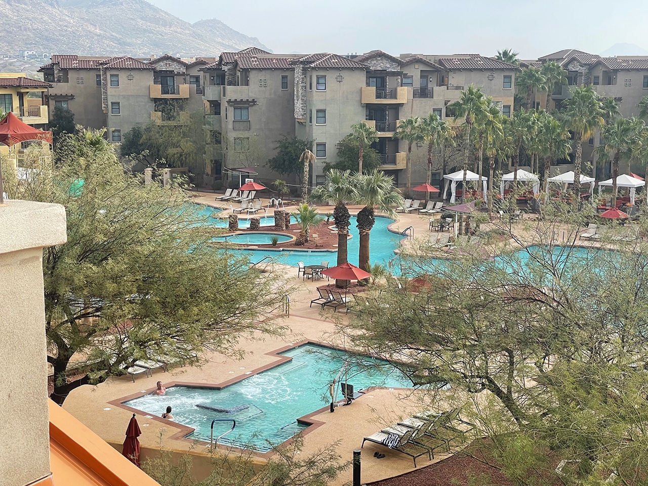 I’m still not a fan of the adobe patios that render any views futile when we’re seated, but we leaned over the edge several times a day to check out the activity at the pool and hot tub and sat by the pool when we wanted outside time. We even had an owl visit on several evenings, although we only heard and never saw it. Our stay was all pretty tough to take!