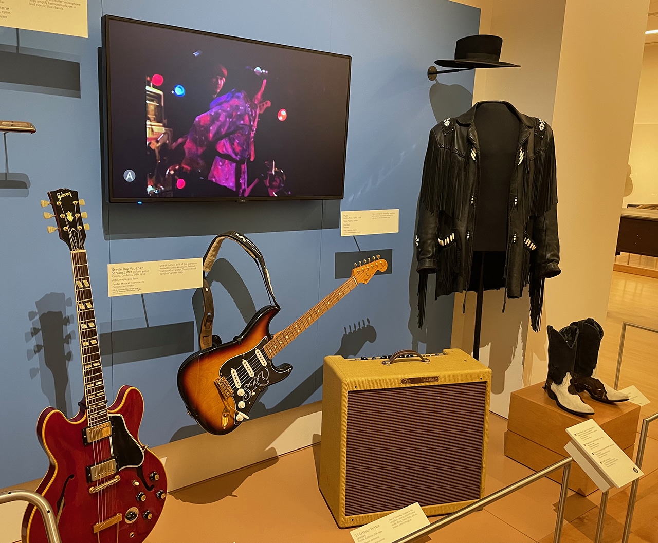 The second photo shows Stevie Ray Vaughan’s Fender Stratocaster (and his guitar strap), his jacket and signature wide-brimmed hat. Of course there was a segment on the flat screen of Stevie and Double Trouble playing “Texas Flood“. The video also scrolled through Otis Spann on piano and singing “Blues Don’t Like Nobody“, Muddy Waters playing guitar and singing “I’m Your Hoochie Coochie Man“, and The Paul Butterfield Blues Band playing “Juke“. It was worth the price of admission just to see these blues legends alive and well and doing what they do best!
