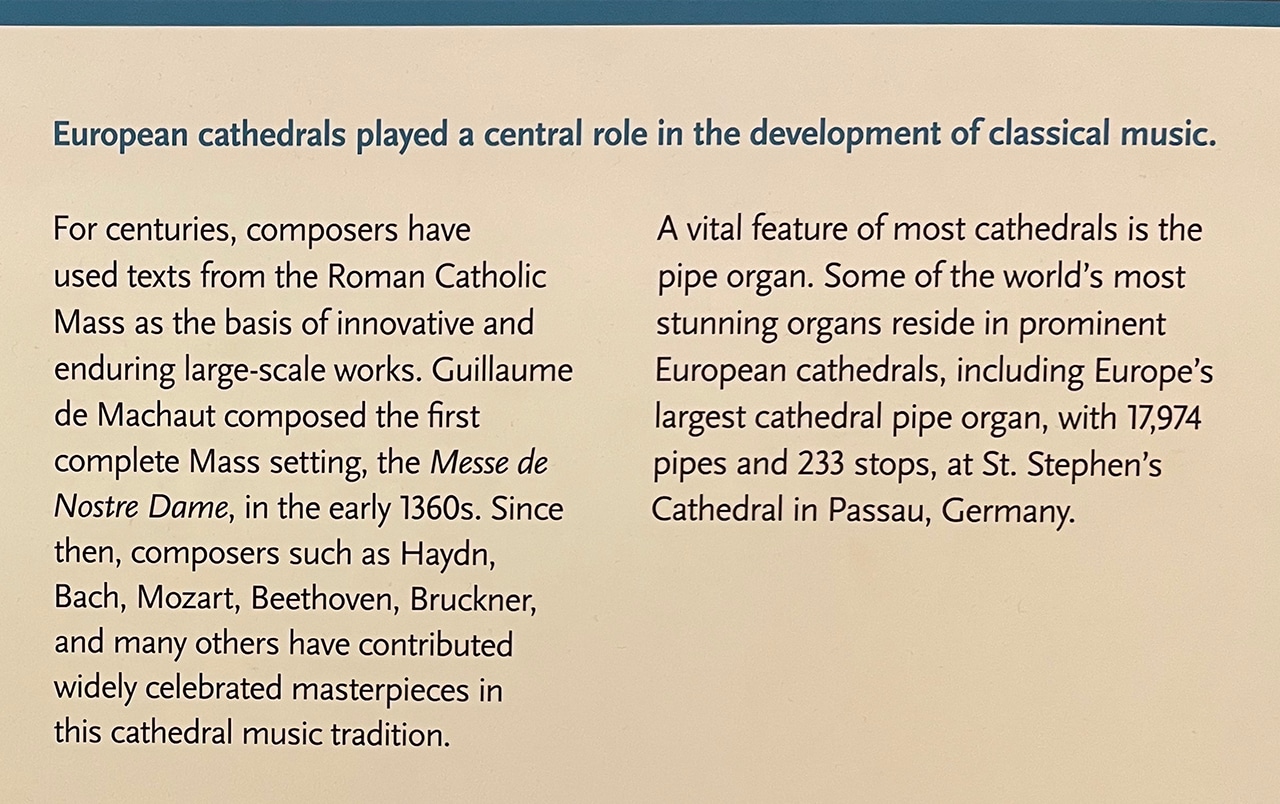 Nearing the end of our visit, another exhibit had a sign that spoke about the largest cathedral pipe organ in Europe. This caught Jim’s eye because we actually saw this one! The third photo below is my photo of the massive pipe organ in St. Stephen’s Cathedral in Passau, Germany! If you’d like to see more photos of this magnificent cathedral, visit my blog: Passau, Germany.