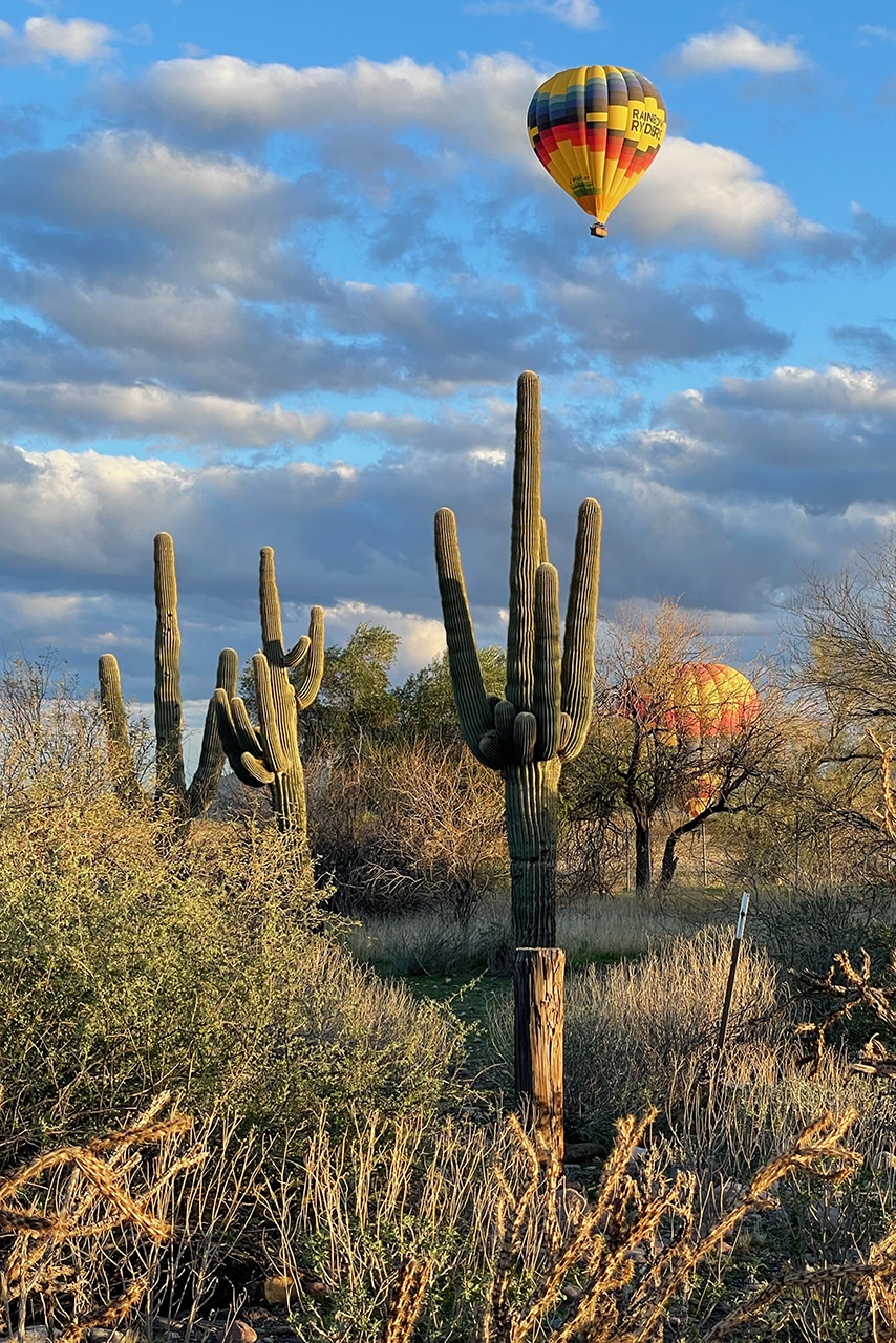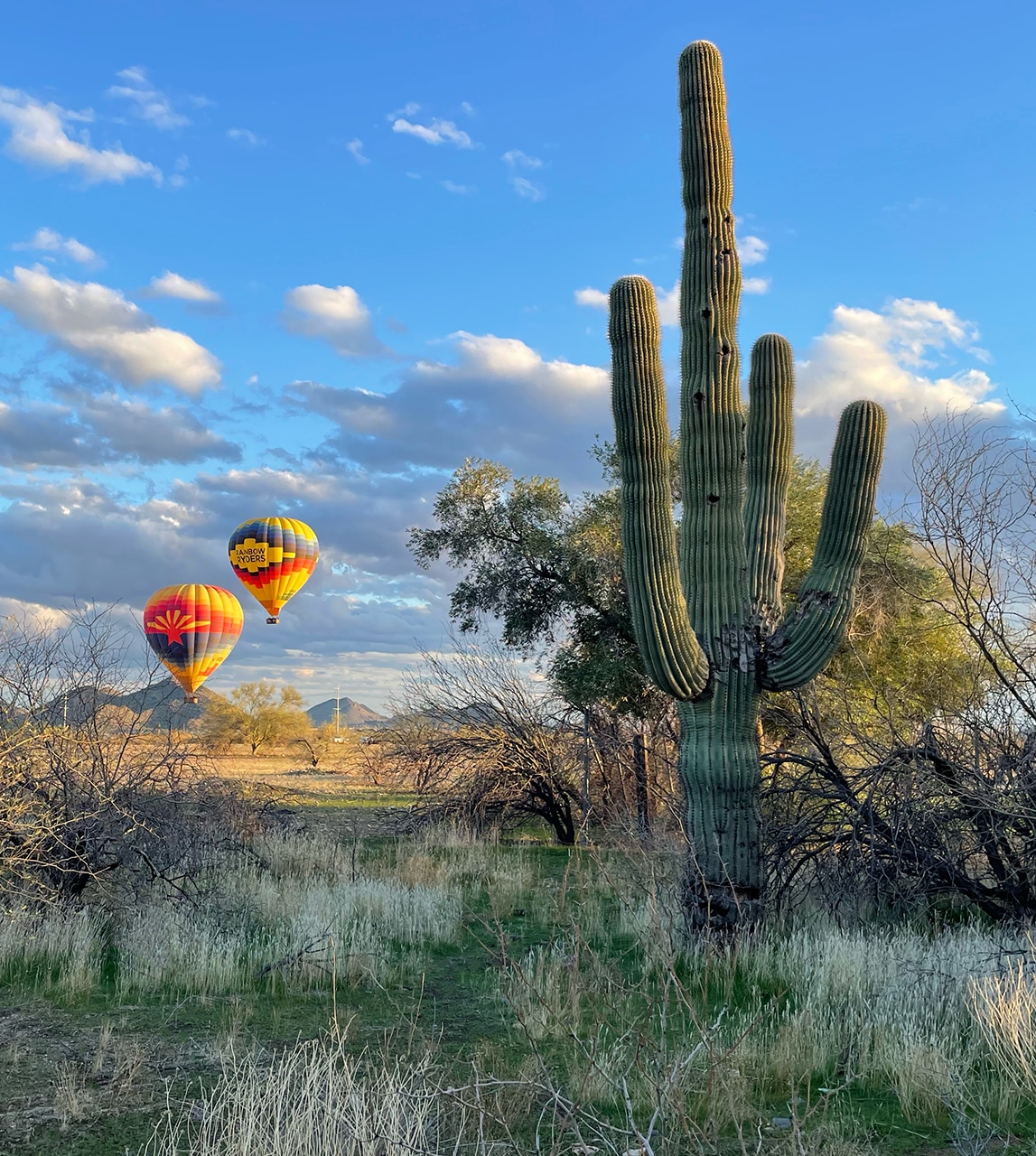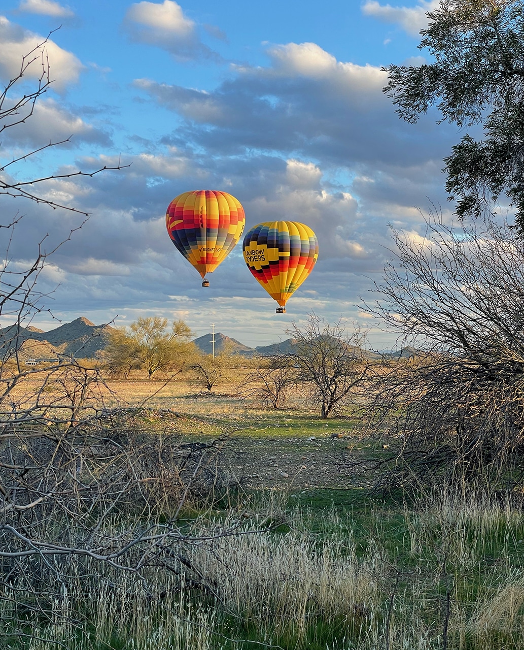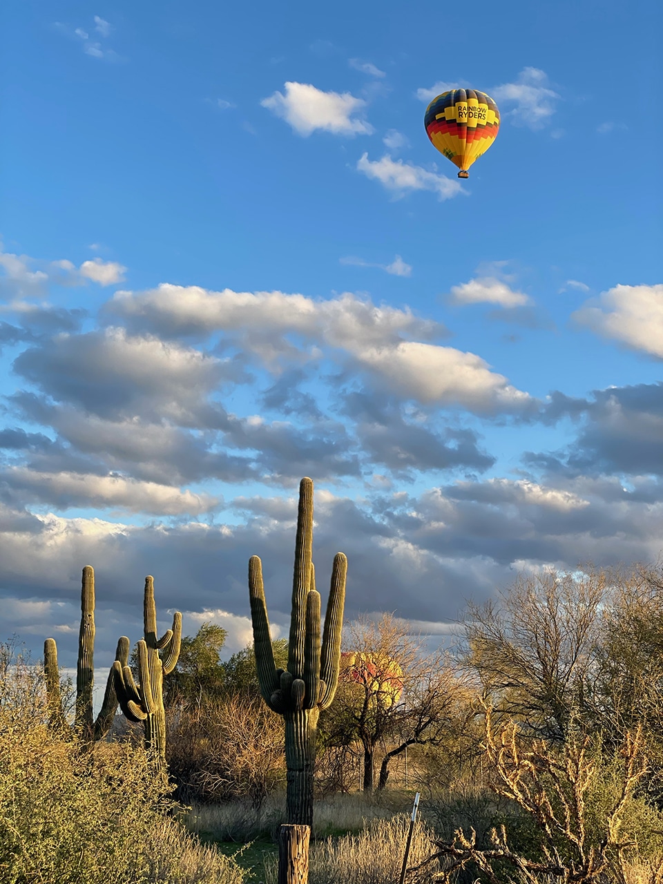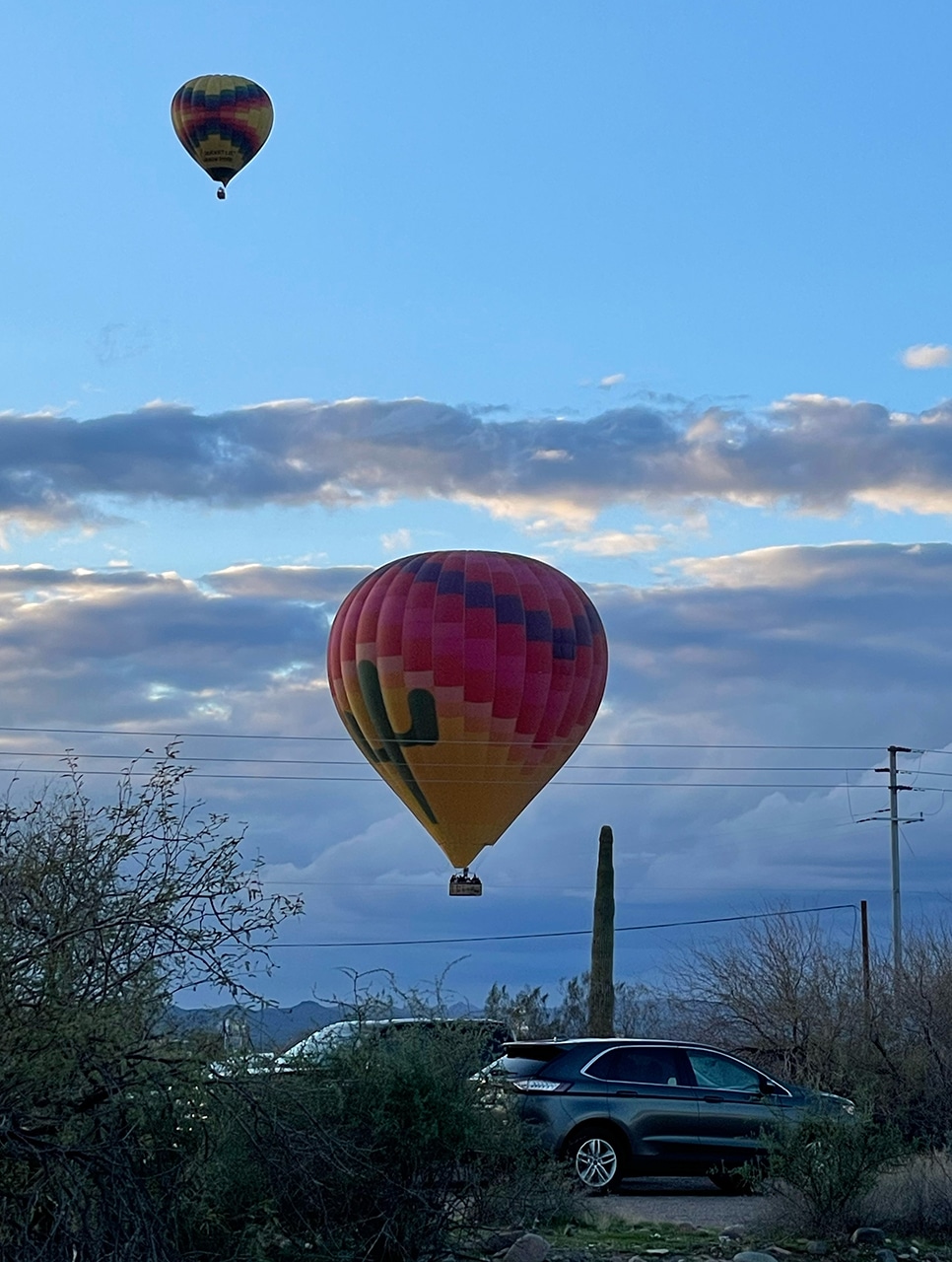As I’m driving up North Lake Pleasant Parkway, I see a hot-air balloon, and then another. And another! Since it was getting close to sunset and a few more were getting pretty low in the sky not far ahead, I bypassed our condo and hauled ass to The Wild Horse (our favorite burger joint!). I was amazed at my timing, and the beautiful lighting of this fabulous sunset on my last day in Phoenix! Too bad I didn’t have time for one last cheeseburger.