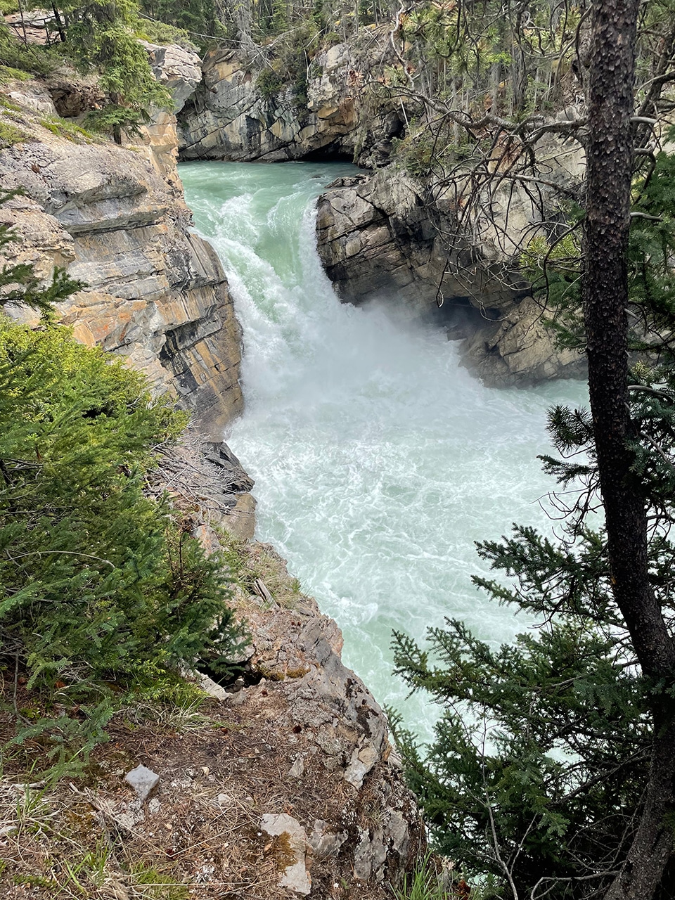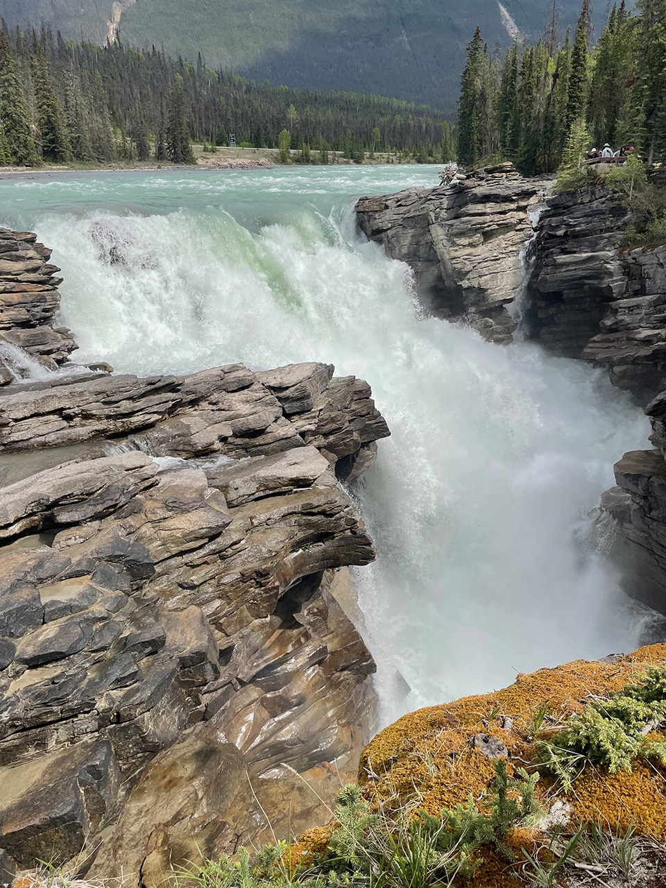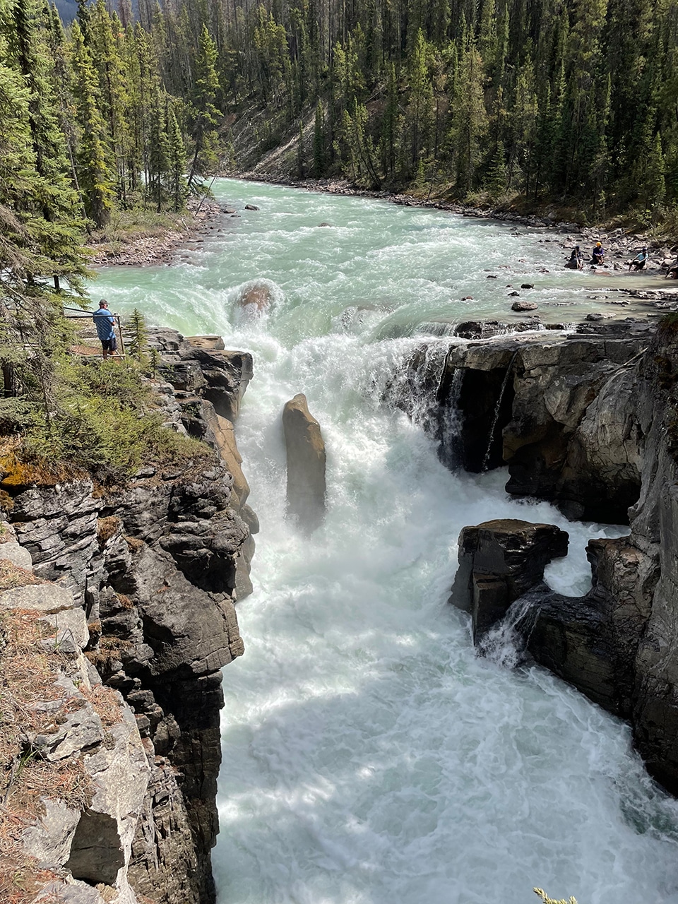 Fed by the Athabasca Glacier, the Upper Sunwapta Falls are easily accessed from the viewpoint parking lot. The walk to the falls starts out pretty beautiful as the water swoops around the curve. As we got a little closer, we realized that the river comes around both sides. It actually flows around a small island covered with tall pines just before it makes its drop!