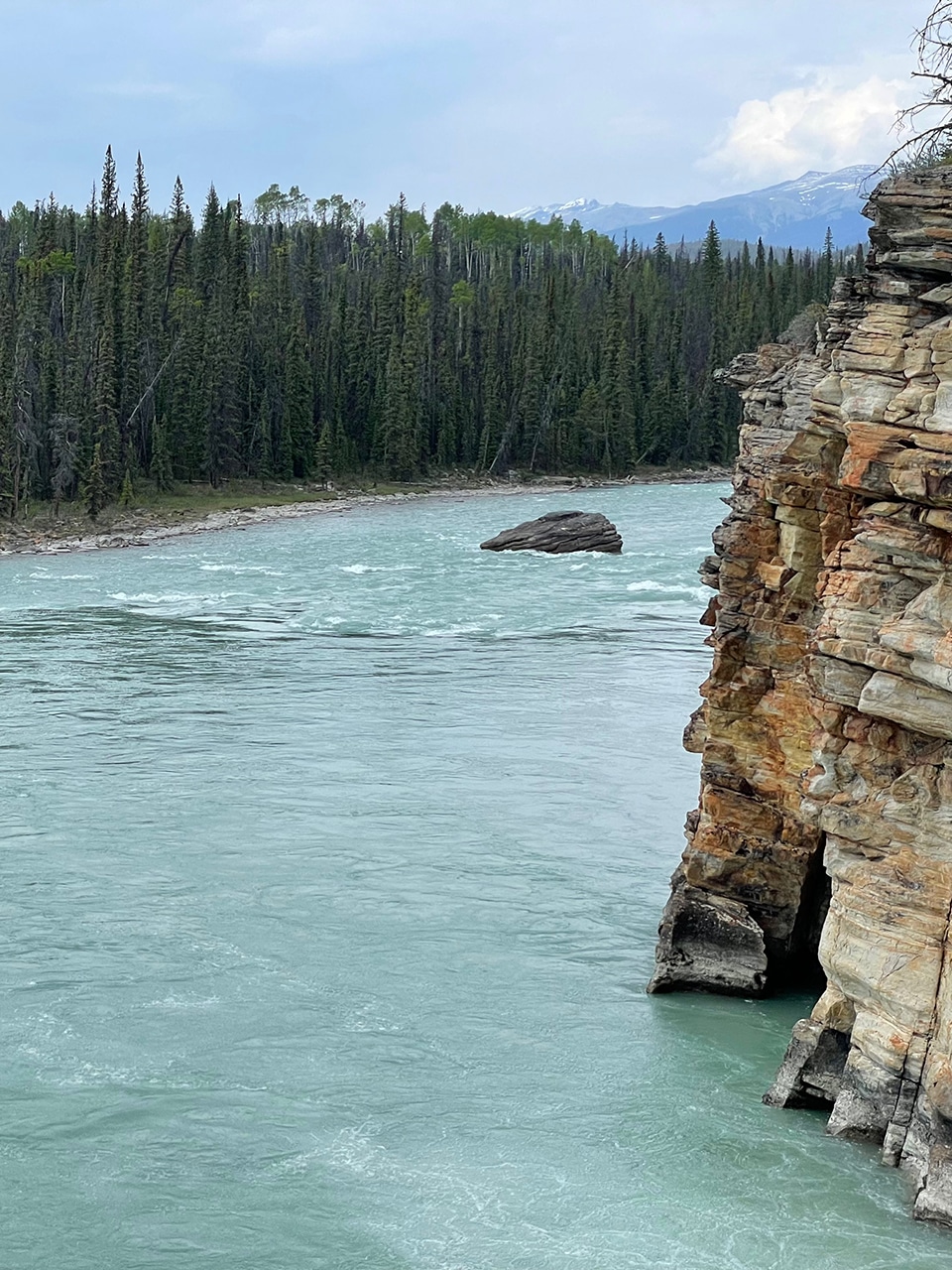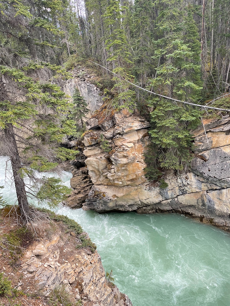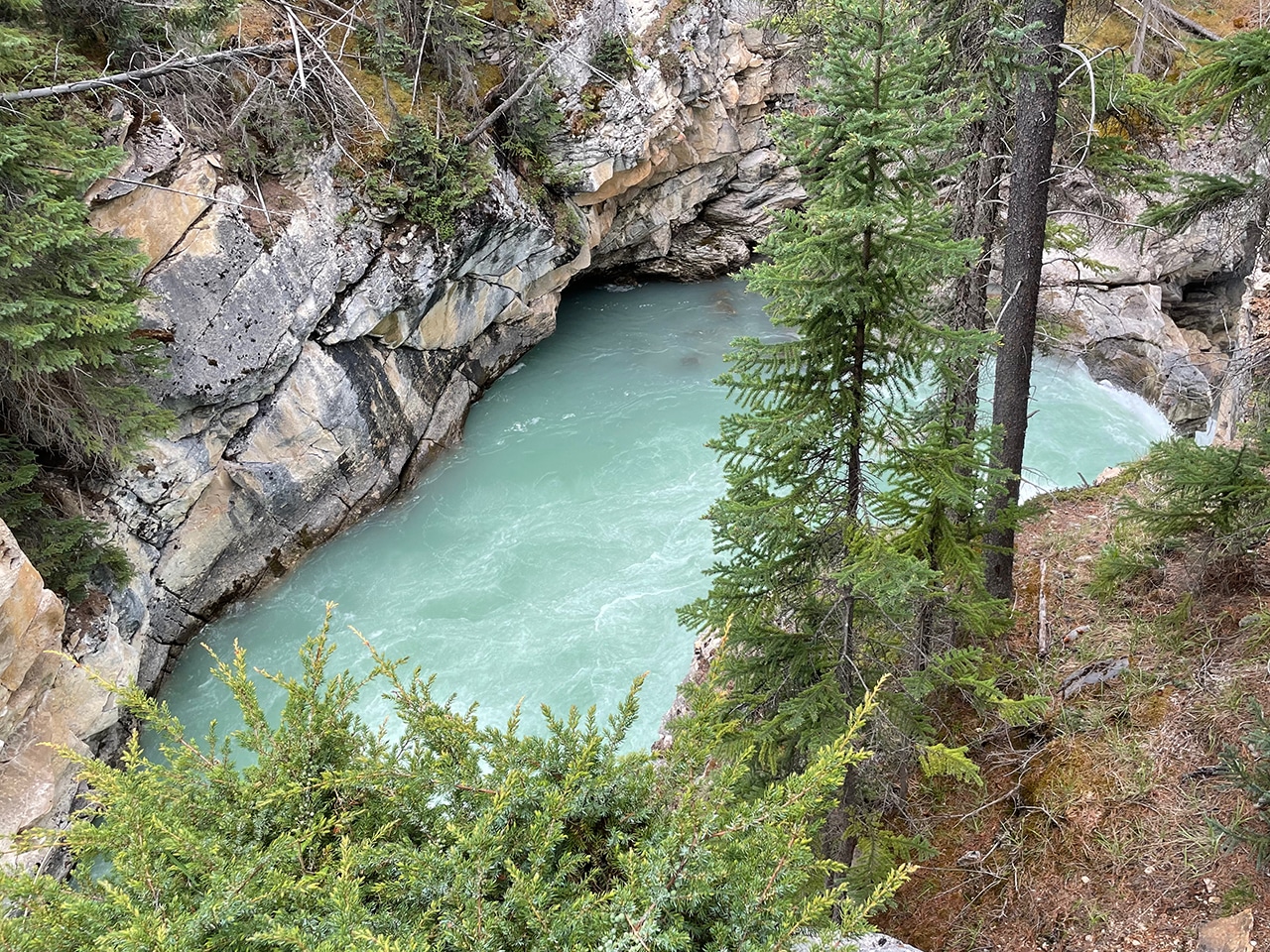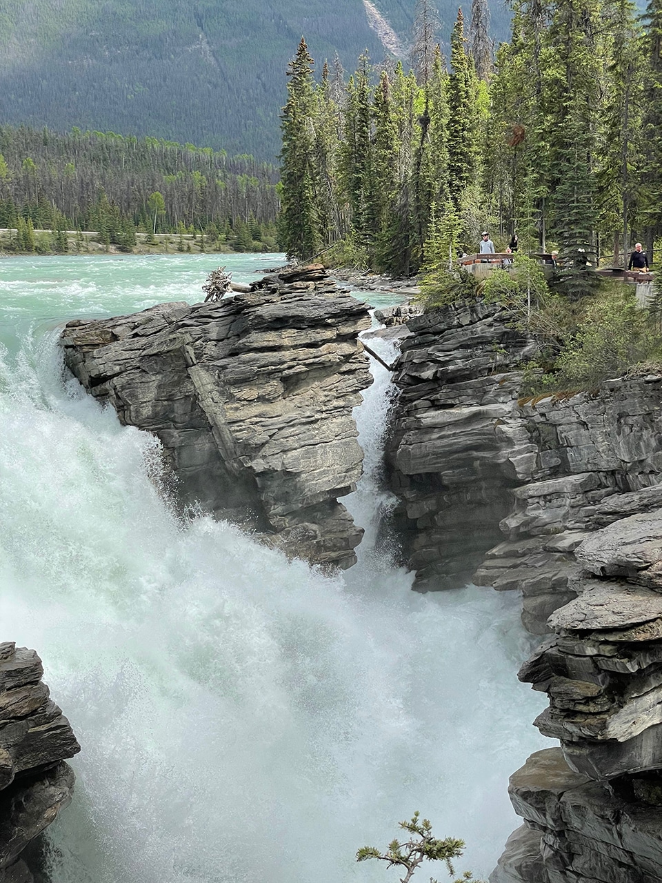 “Every couple of years, someone dies at Athabasca Falls. Park staff search for and rescue people who fall into the canyon. Usually only the bodies are recovered for the grieving families. Step off the trail and you risk your life. The rocks, covered by spray year-round, are as slippery as ice. The water is glacial-cold, swift and deep. Within minutes of slipping into the water hypothermia takes over – you cannot pull yourself out of the river. Once over the falls death is swift.