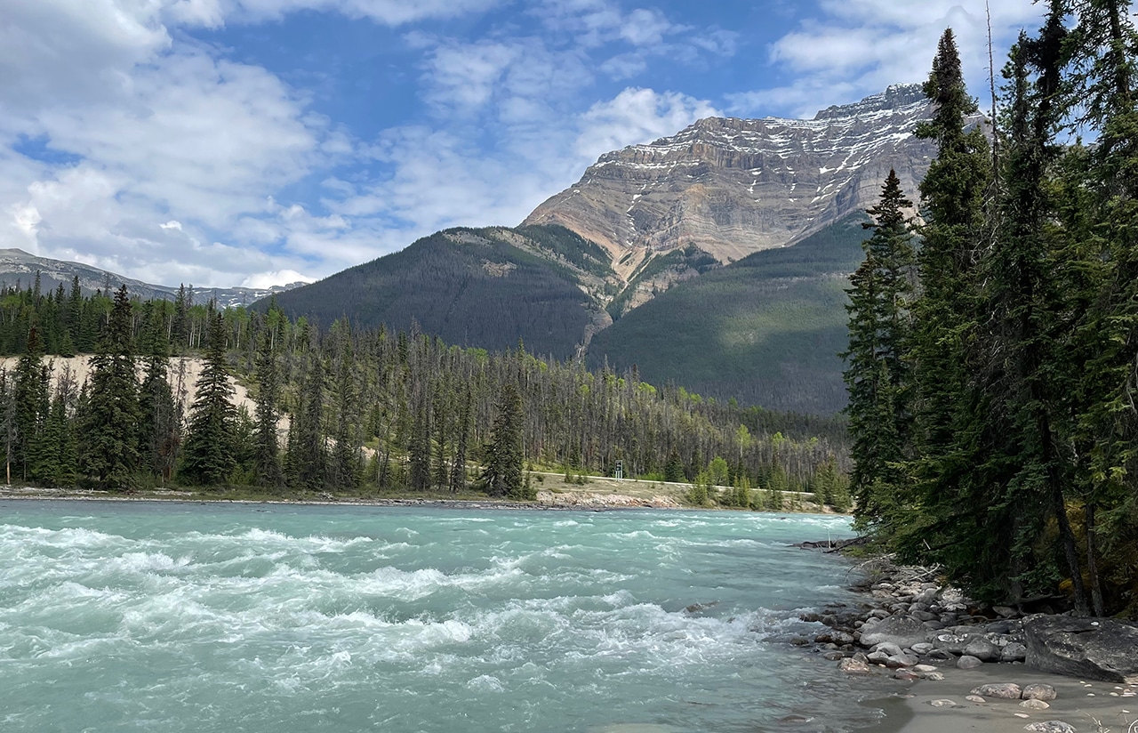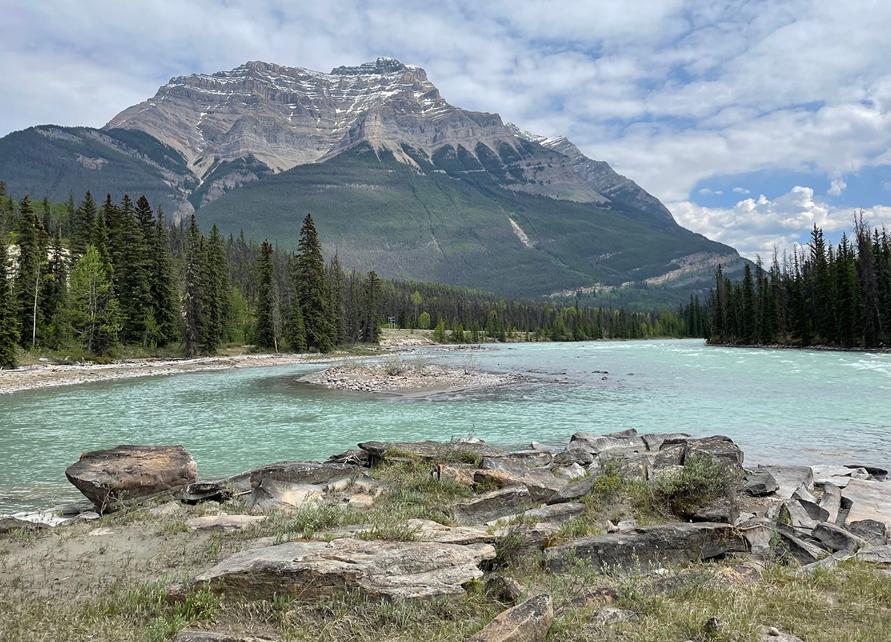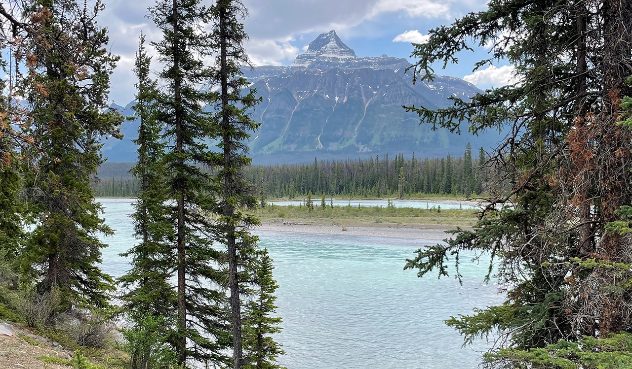 This was a marvelous lookout with expansive views of the snowcapped mountains and the Athabasca River. An awesome view of Mount Kerkeslin (last photo) was just across the road from the parking lot. Click on the link to find your camping spot along the Athabasca at Mount Kerkeslin Campground!