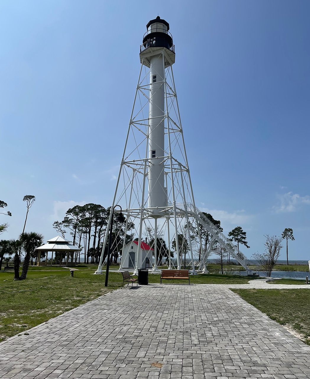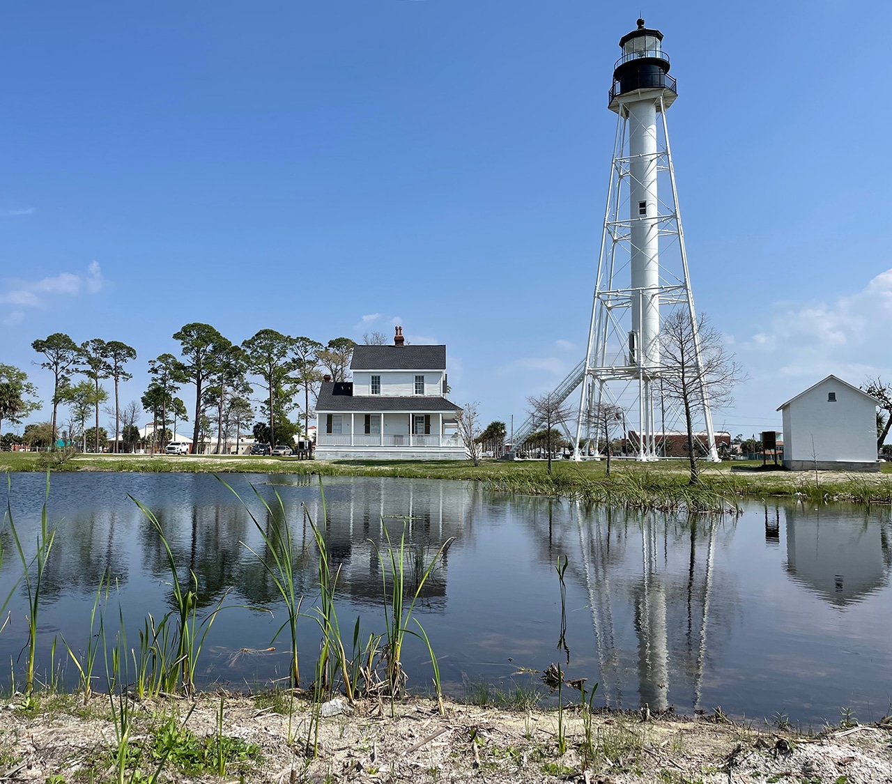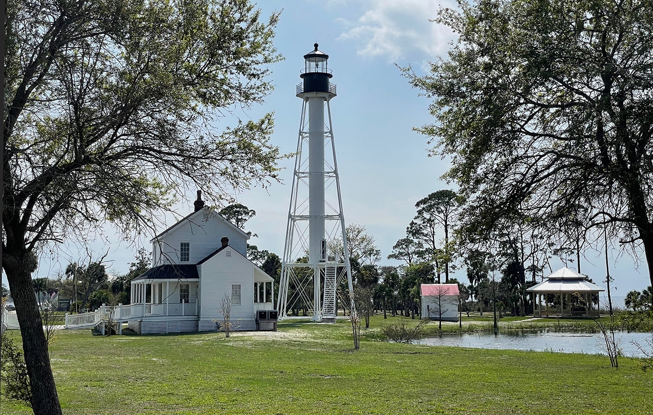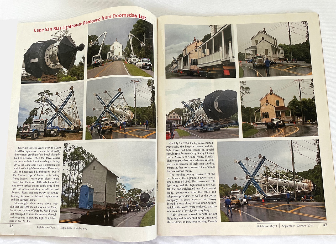 “On July 15, 2014, the big move started… The entire distance covered was 12.3 miles and was the longest move of an intact lighthouse in the United States. Right on schedule, at 5:00 pm the convoy pulled into Port St. Joe near the George Core Park which was to be the new home for the lighthouse and its out-buildings. Obviously, a large crowd was there to give a cheer to the dozen or more house-mover employees who led the historic move.”